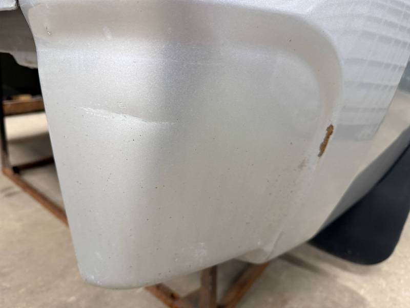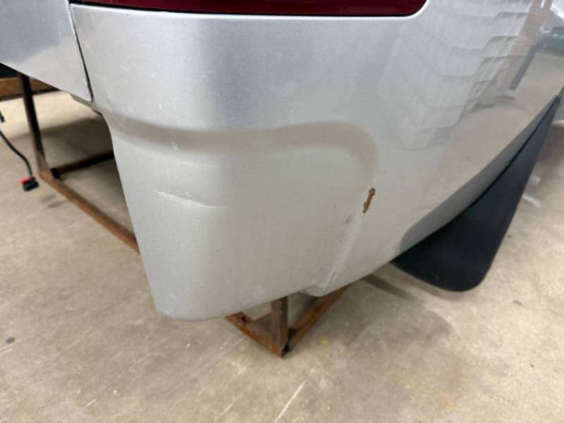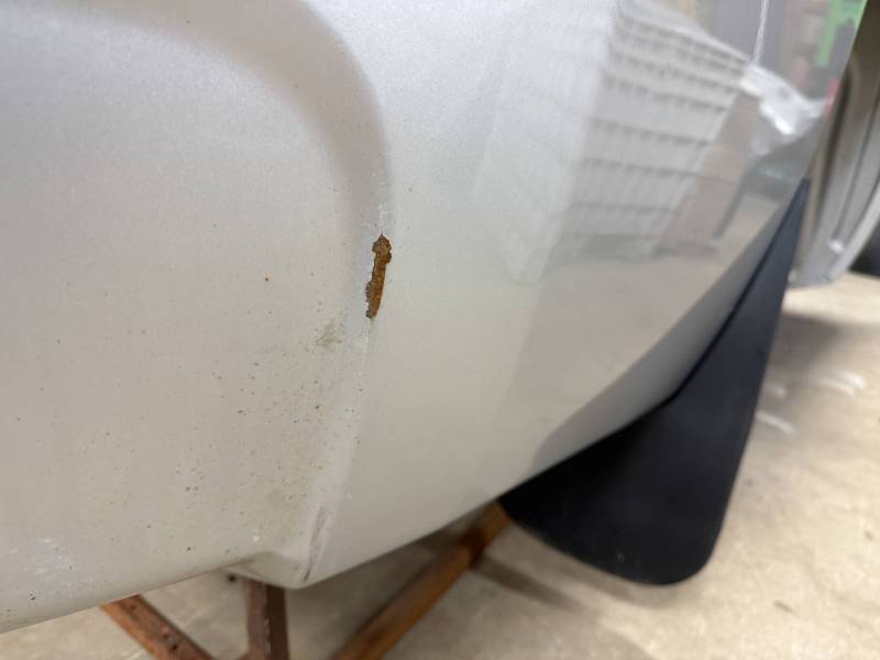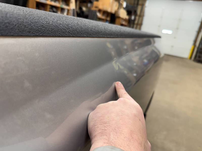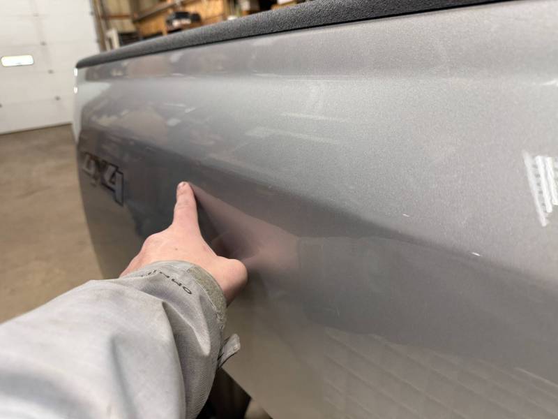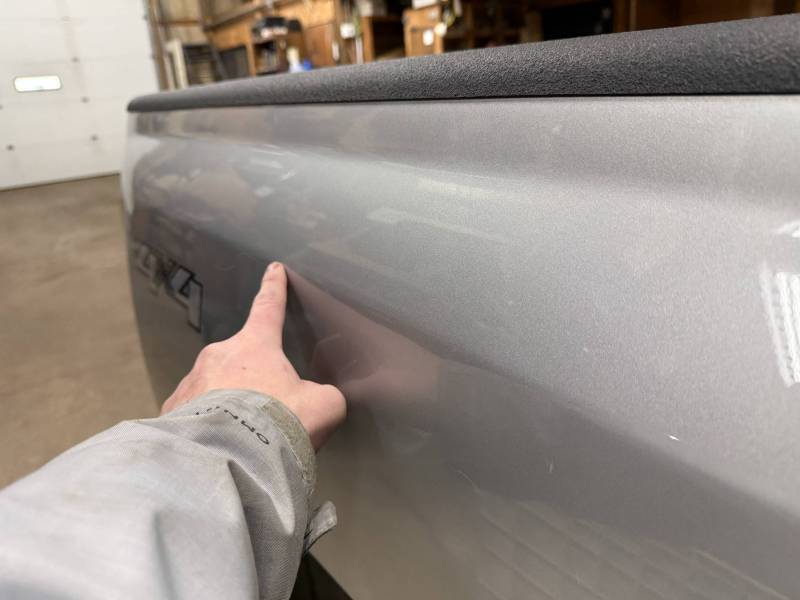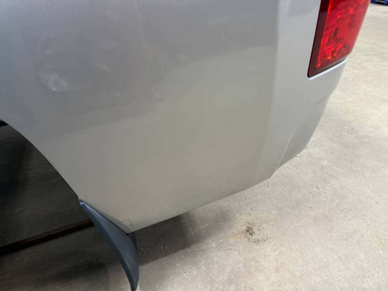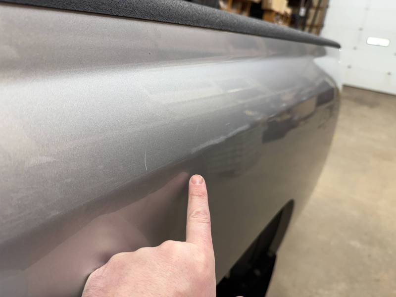 The right/passenger's side has (8) dime-sized dings by the top rail, and above the wheel arch also has (2) dime-sized dings from a ratchet strap. The right rear under the taillight has a 2" crease and a chip in the paint from a bumper being pushed in. The dings are very minor, so minor that they are hard to pick up with the lighting and the camera