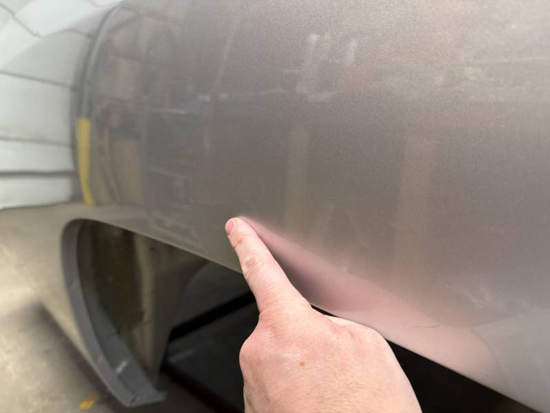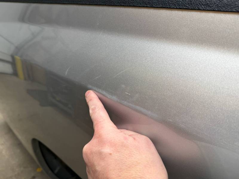 The left/driver's side has (5) dime-sized dings by the top rail, and the left side above the wheel arch has (3) dime-sized dings from a ratchet strap.