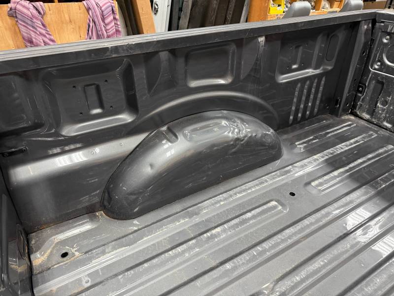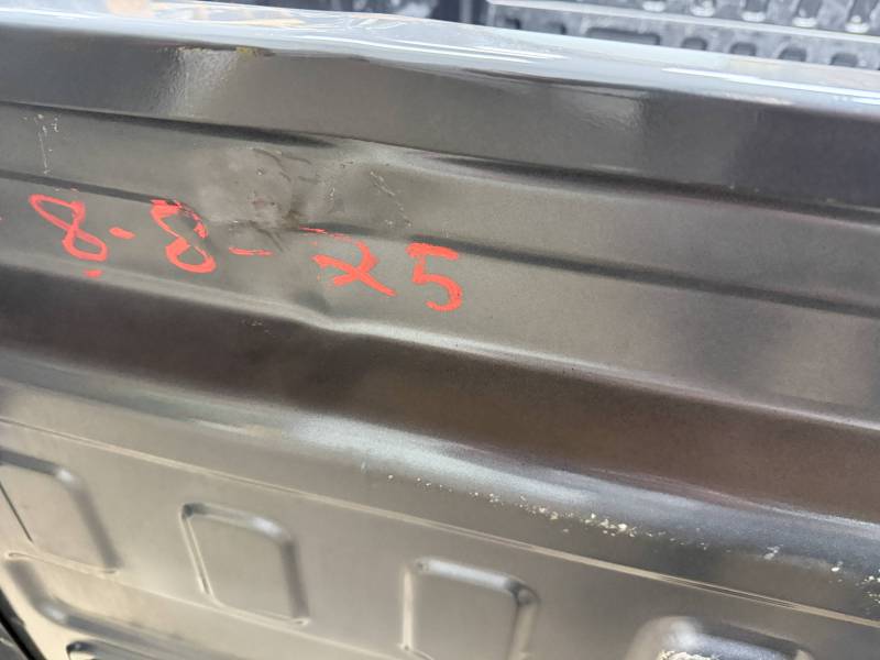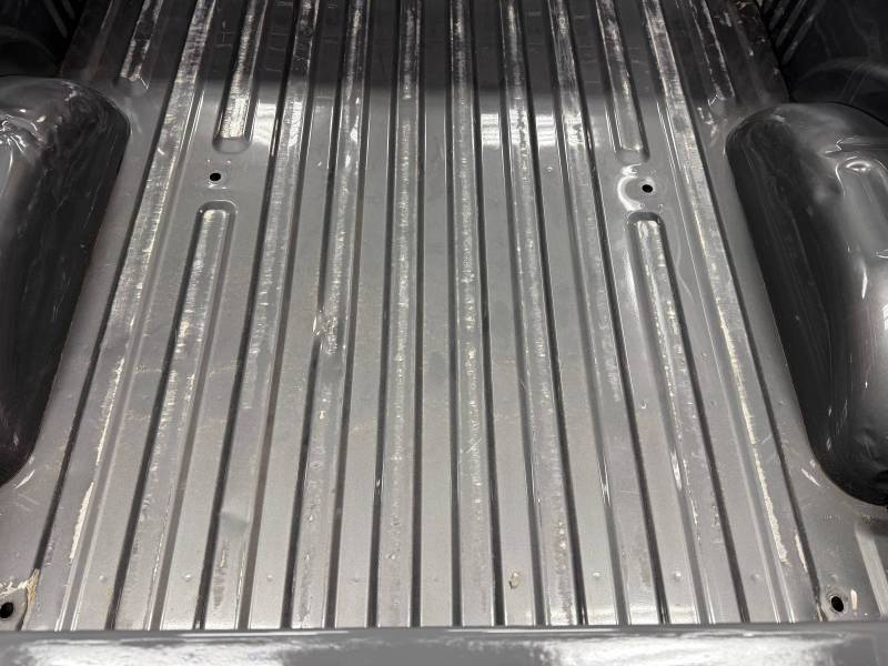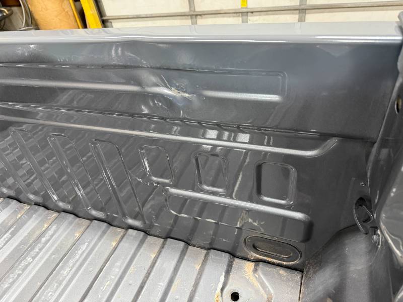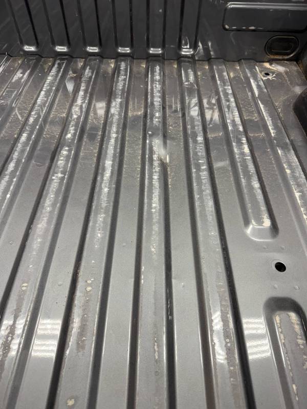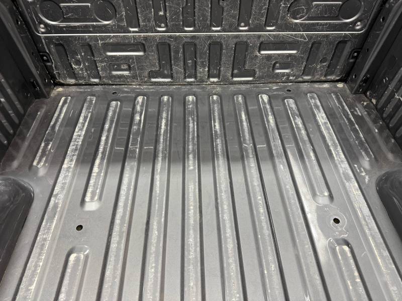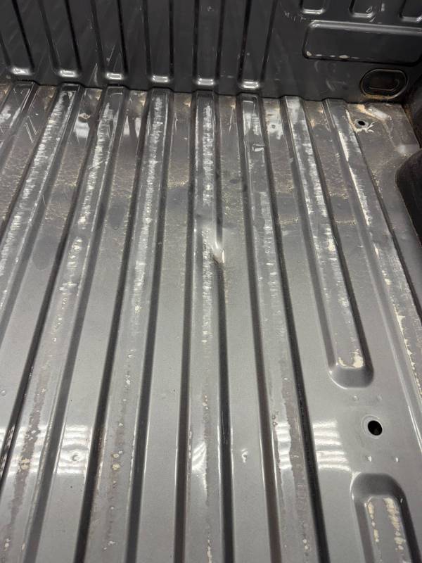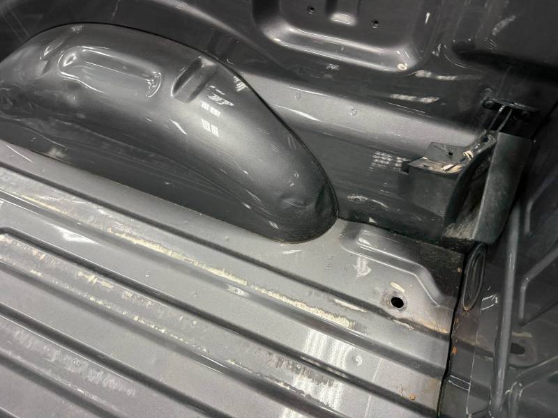 This bed comes with halogen taillights, a tailgate with a manual handle, and a camera. There are scratches on the floor, and the inner wheel tubs are dented. There is a baseball-sized dent on the floor, along with a dent on the header panel. There are also scratches and gouges on the top plastic rails.