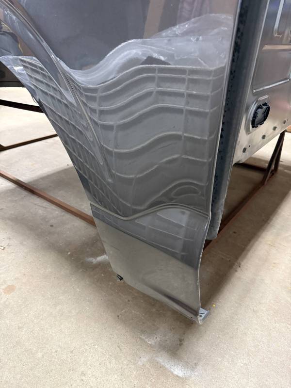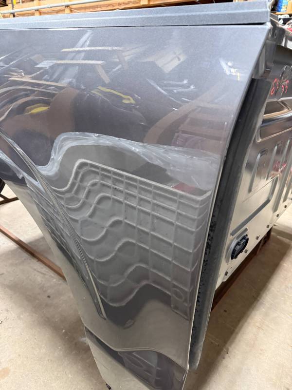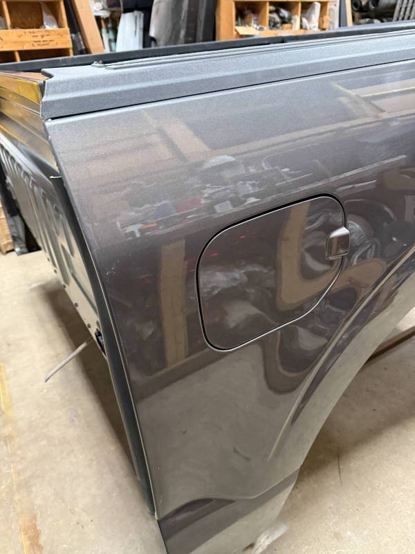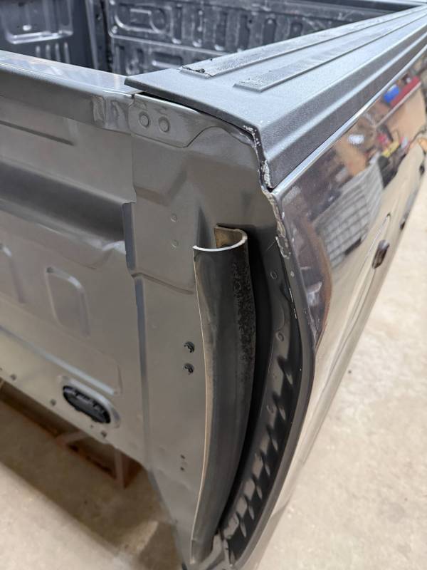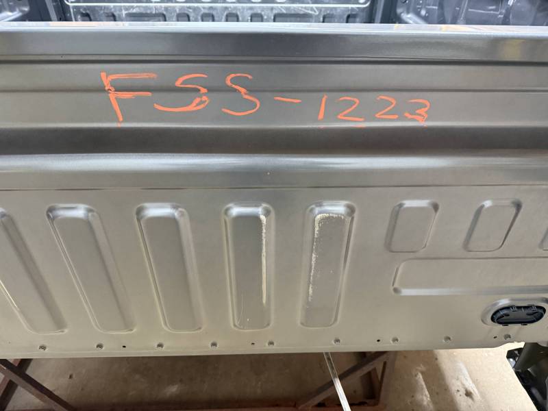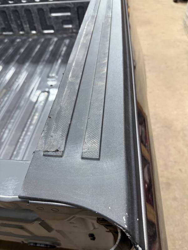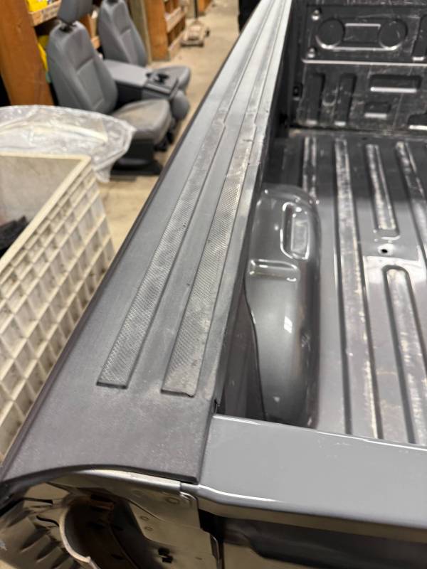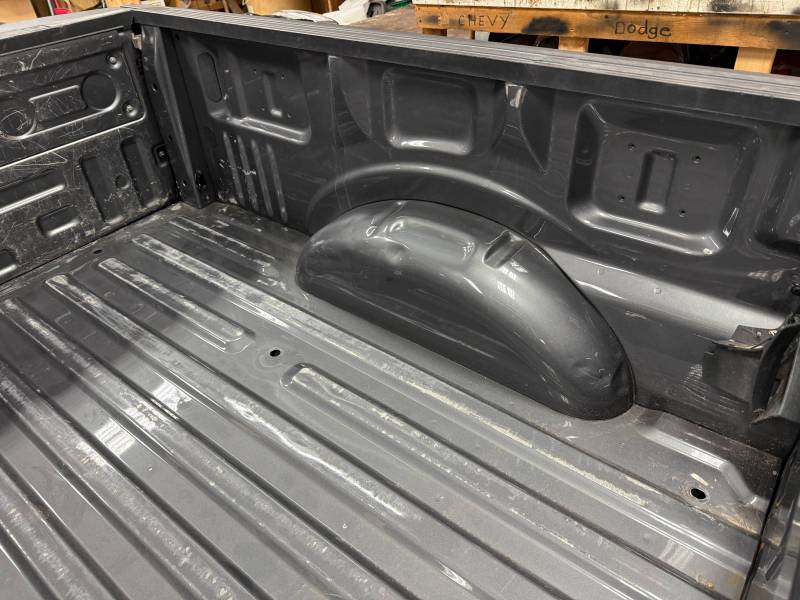 This bed comes with halogen taillights, a tailgate with a manual handle, and a camera. There are scratches on the floor, and the inner wheel tubs are dented. There is a baseball-sized dent on the floor, along with a dent on the header panel. There are also scratches and gouges on the top plastic rails.