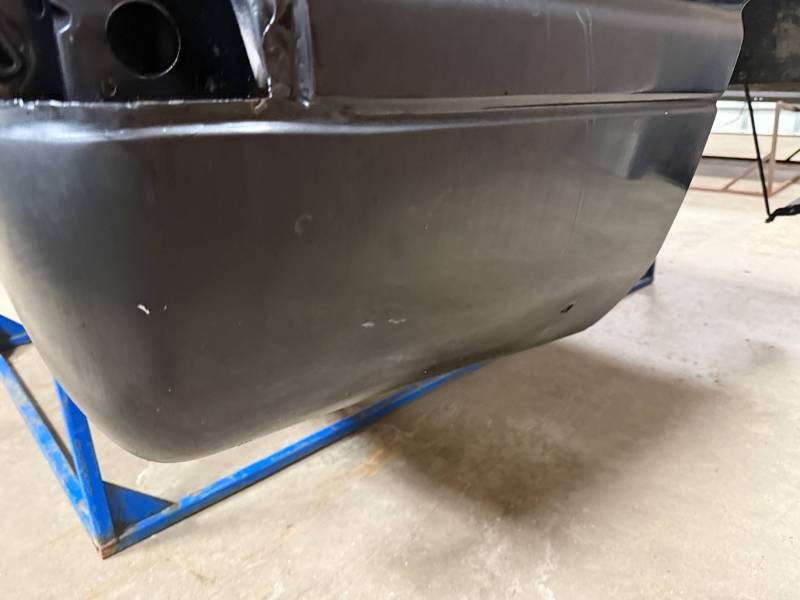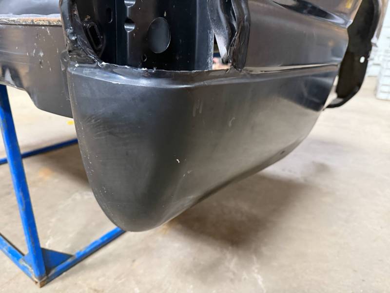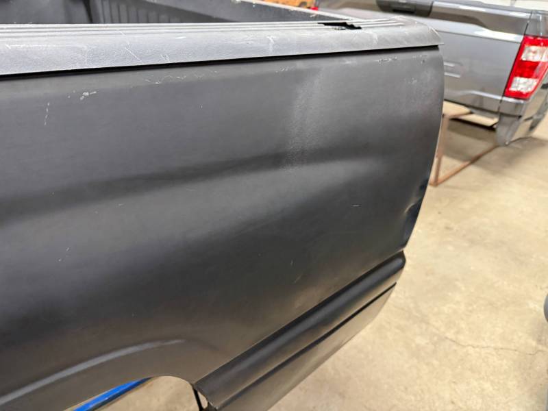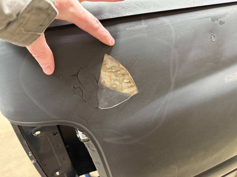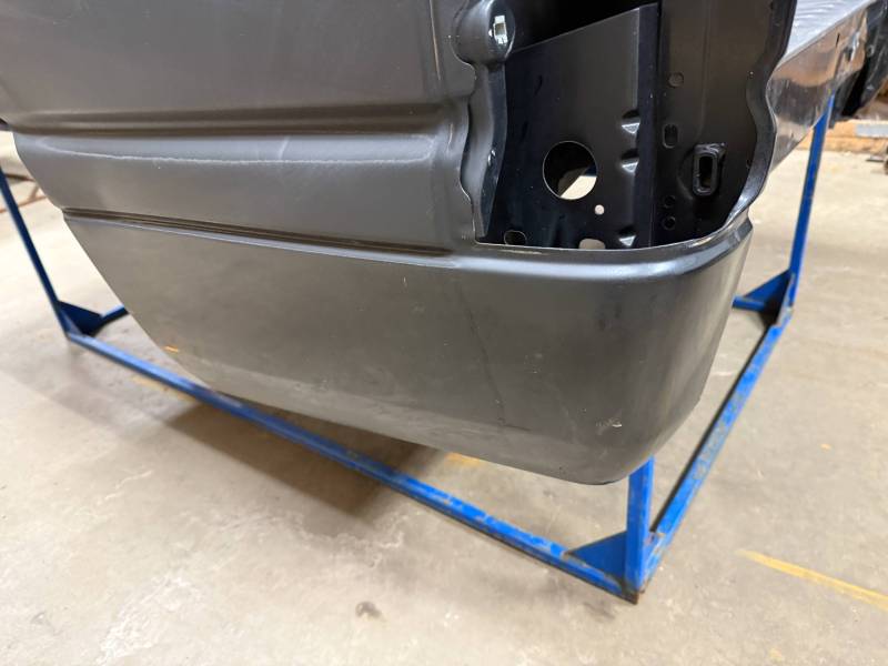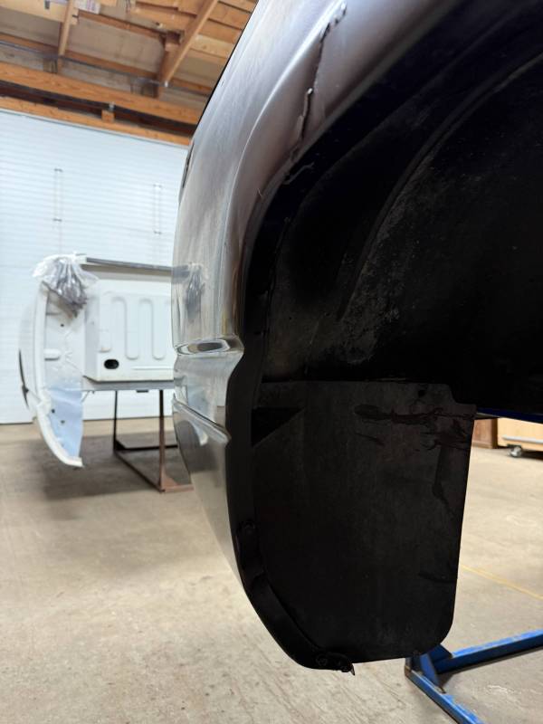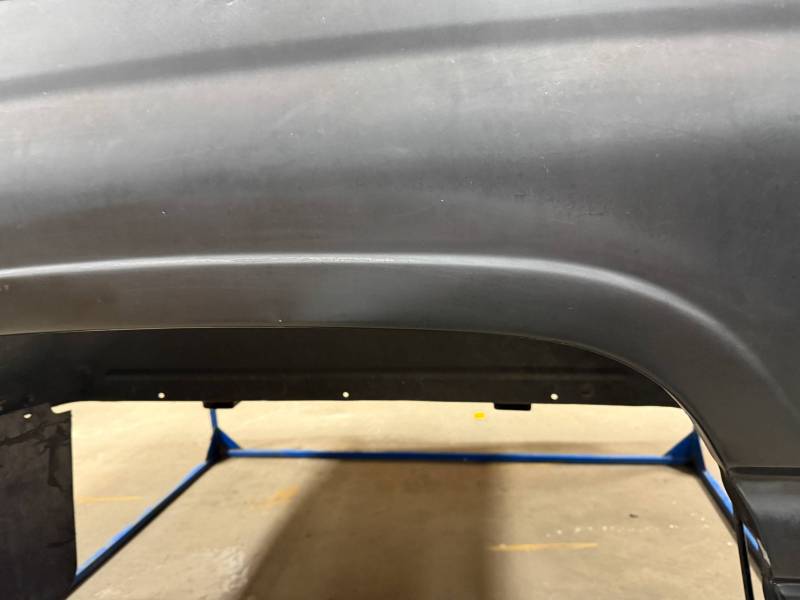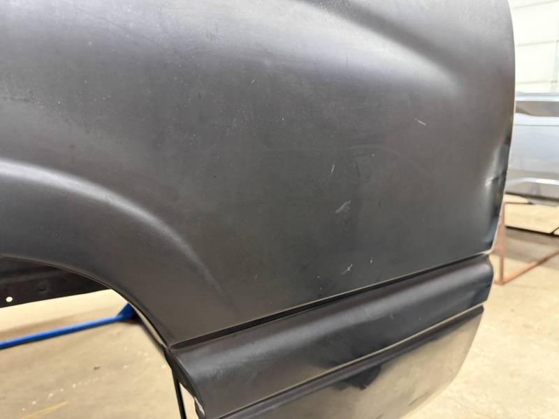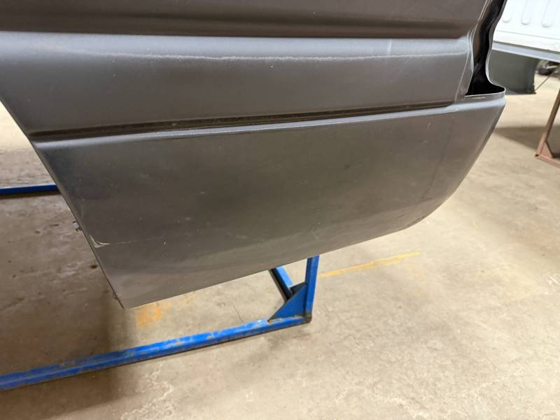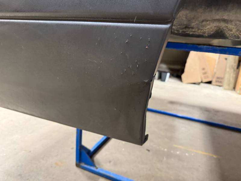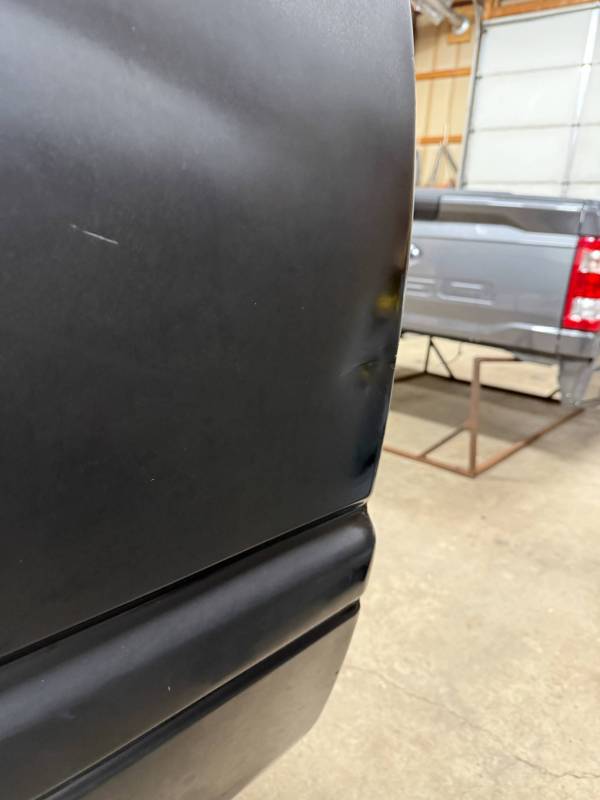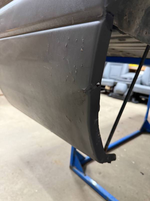 The right/passenger's side front edge has a 6" crease along with a dent. The right side by the top rail has (2) quarter-sized dents, and the right front has a quarter-sized dent, and the right front lower has a dime-sized ding. The right side has (2) quarter-sized dents on the wheel arch, and the left rear by the taillight opening has a 1/8" layer of bondo missing. The right rear lower, below the taillight opening, has a 3/16" layer of bondo.