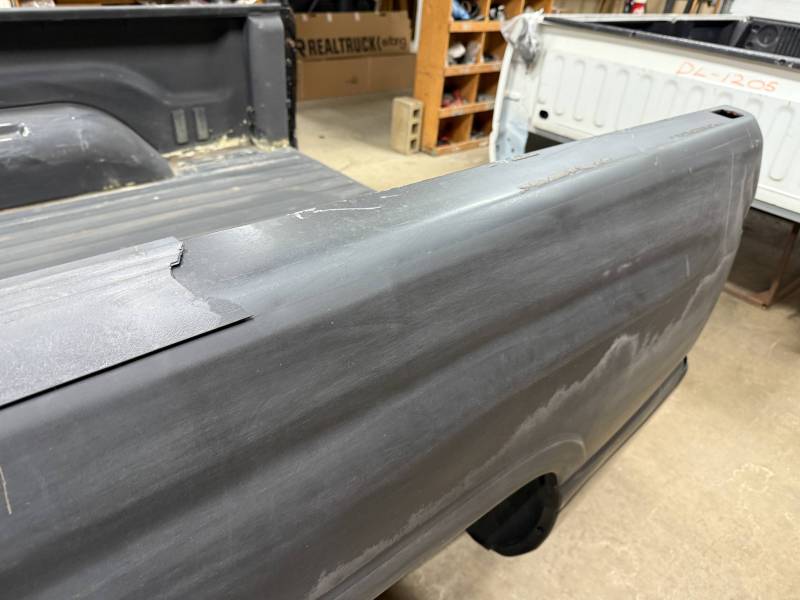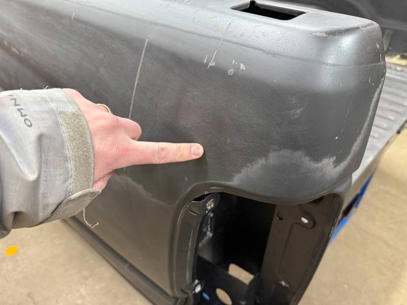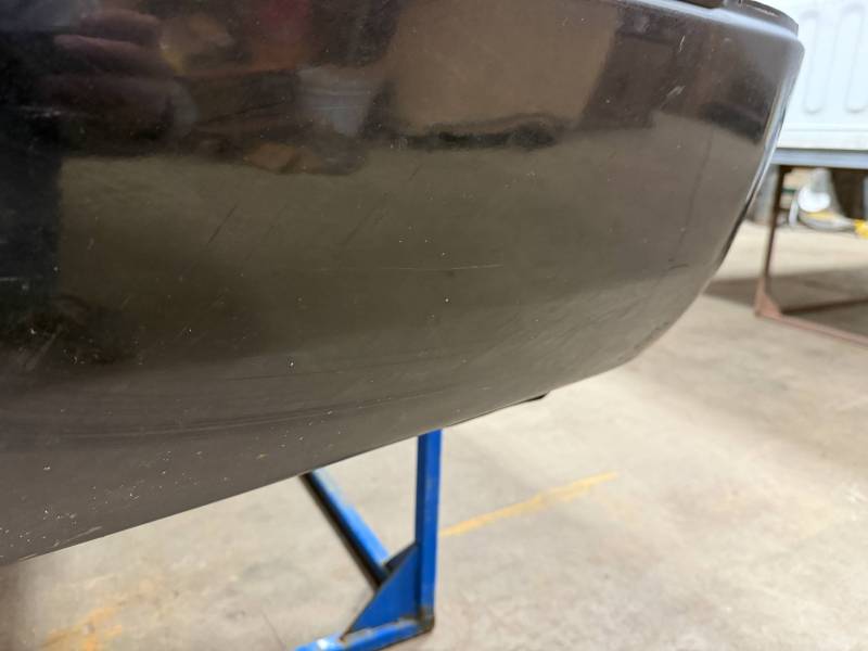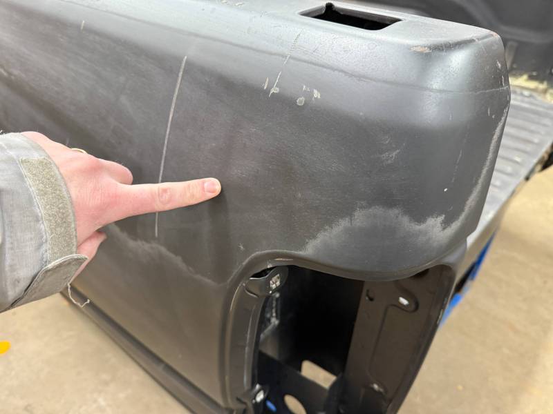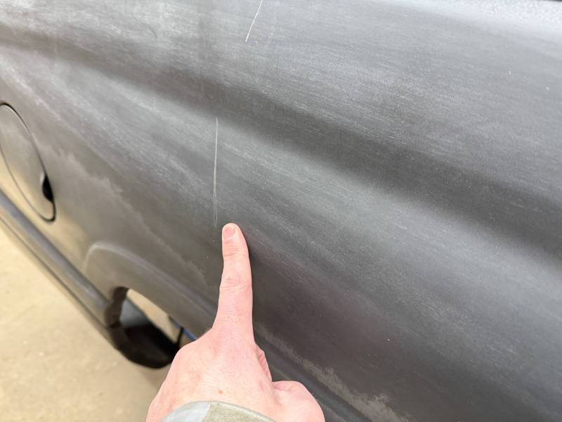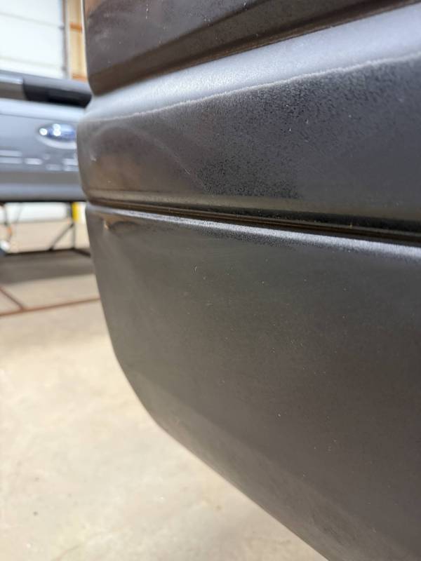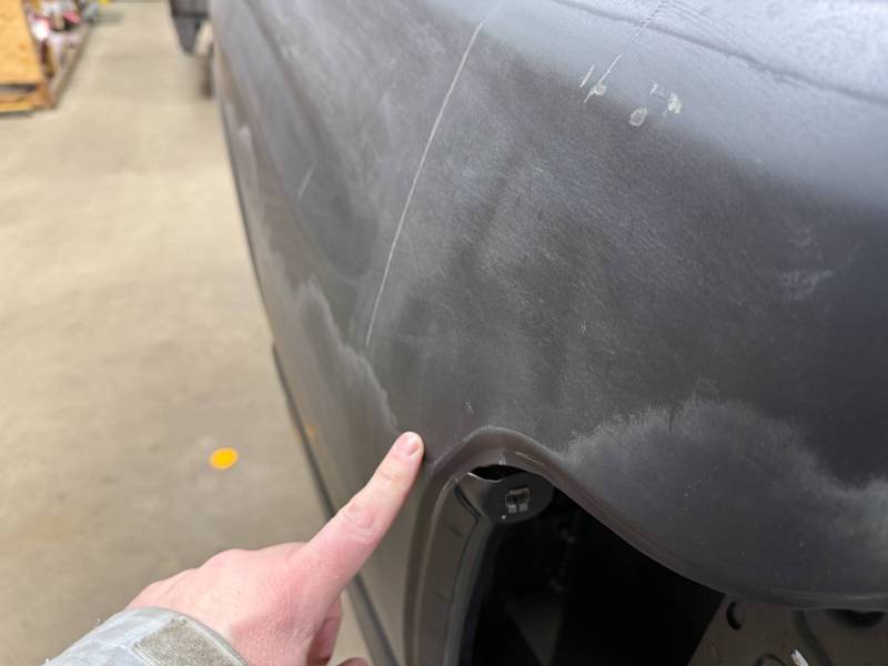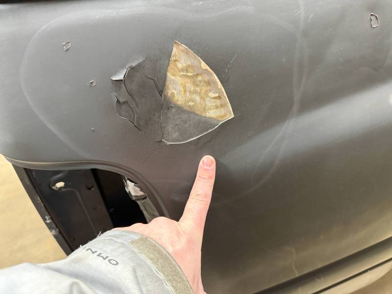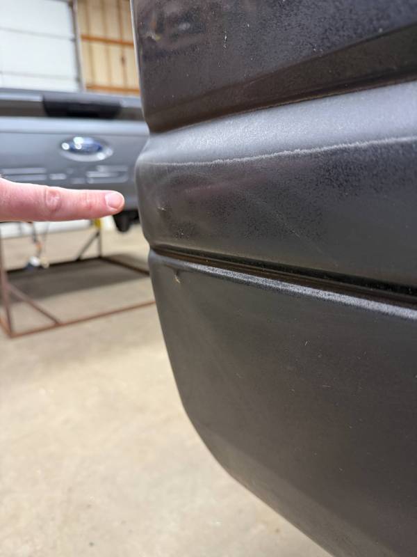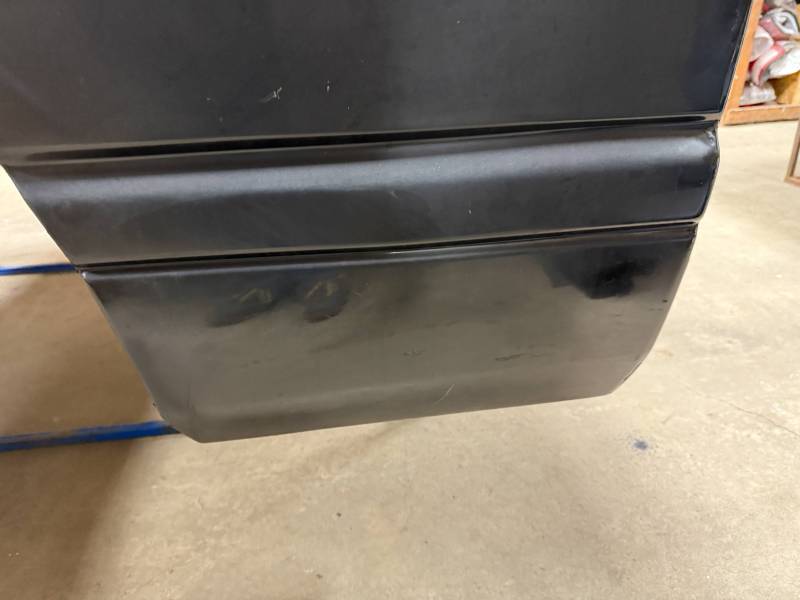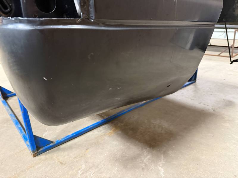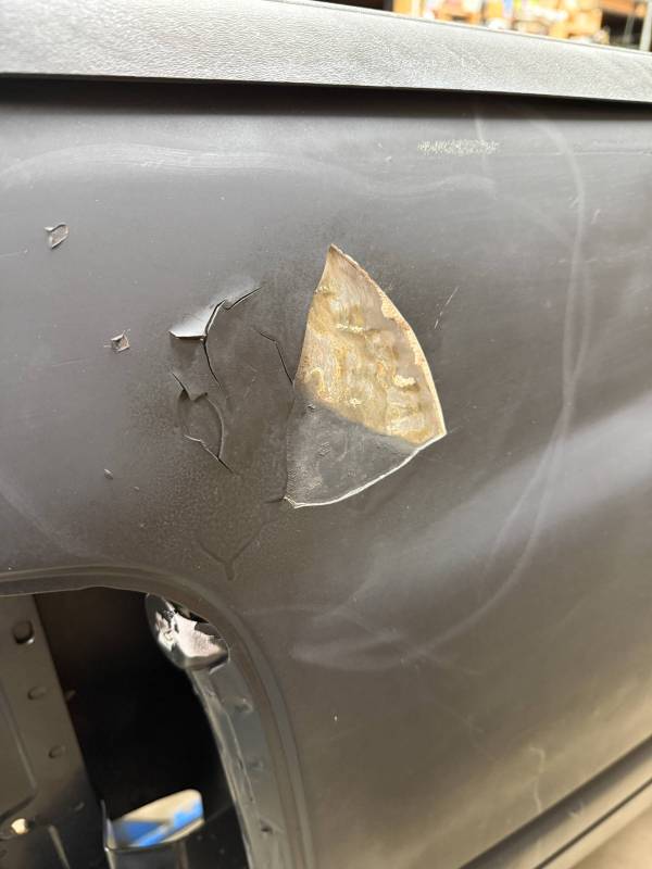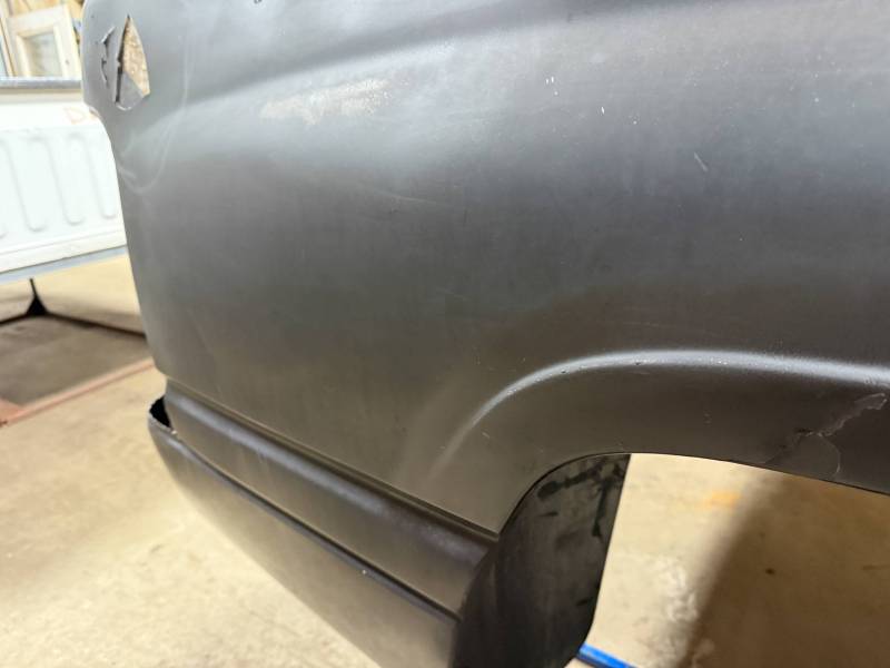 The right/passenger's side front edge has a 6" crease along with a dent. The right side by the top rail has (2) quarter-sized dents, and the right front has a quarter-sized dent, and the right front lower has a dime-sized ding. The right side has (2) quarter-sized dents on the wheel arch, and the left rear by the taillight opening has a 1/8" layer of bondo missing. The right rear lower, below the taillight opening, has a 3/16" layer of bondo.