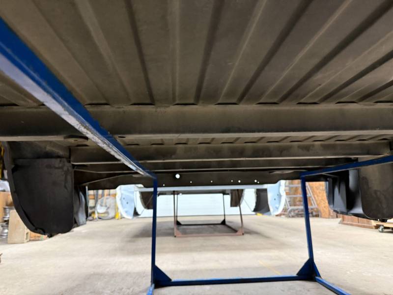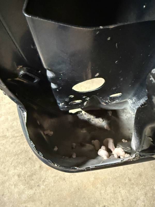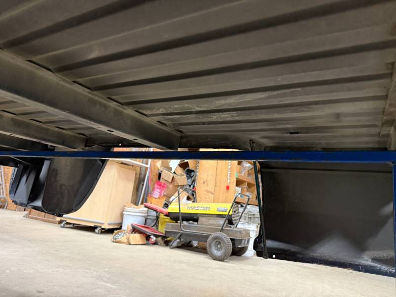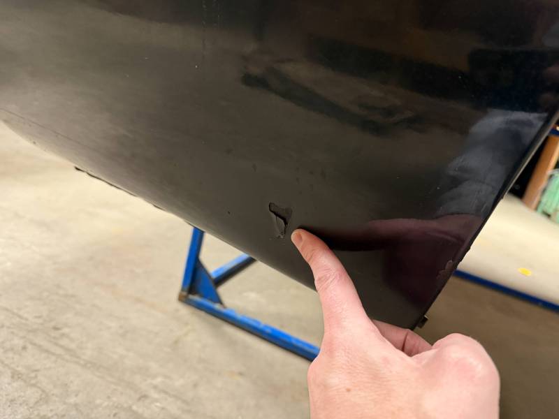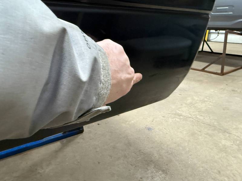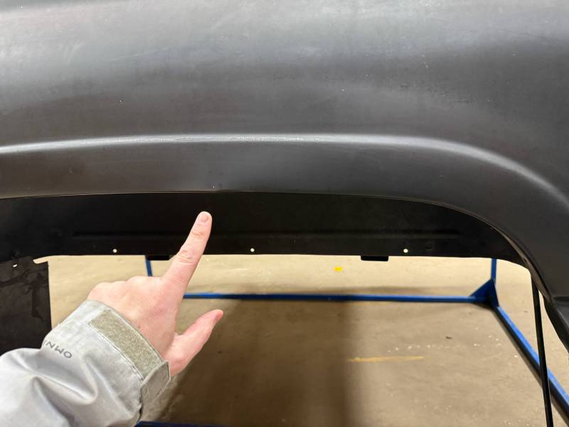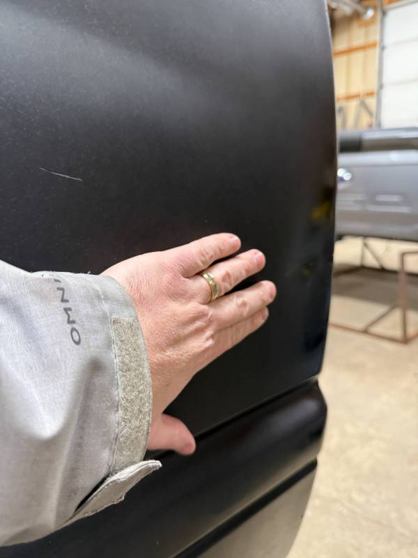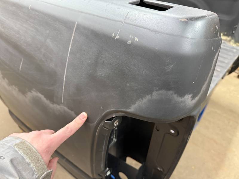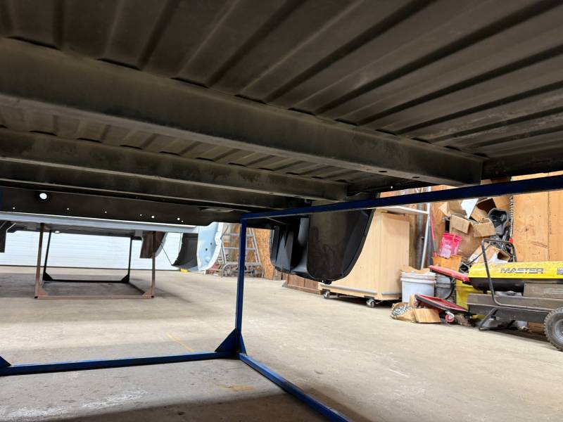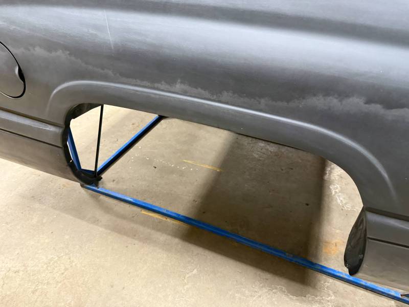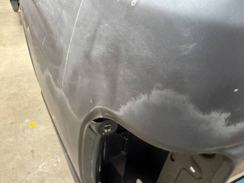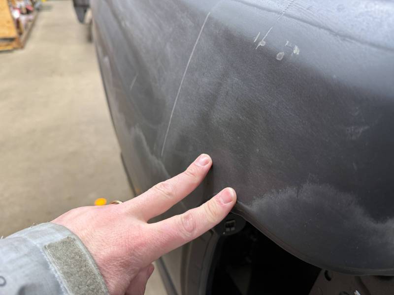 The right/passenger's side front edge has a 6" crease along with a dent. The right side by the top rail has (2) quarter-sized dents, and the right front has a quarter-sized dent, and the right front lower has a dime-sized ding. The right side has (2) quarter-sized dents on the wheel arch, and the left rear by the taillight opening has a 1/8" layer of bondo missing. The right rear lower, below the taillight opening, has a 3/16" layer of bondo.