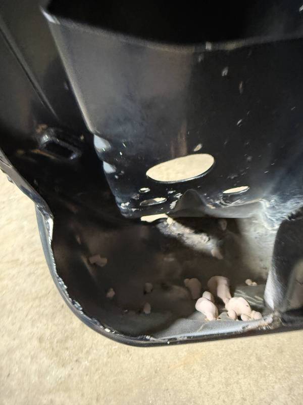 The left/(driver's) side has a quarter-sized dent by the top rail, and the left side has a 4" crease above the wheel arch. The left wheel arch has (3) dime sized dings on the edge and the left front of the wheel arch also has a quarter sized dent. The left rear has (3) quarter-sized dents along with a 6" crease. The left rear lower has (2) quarter-sized dents, and the left front lower has (2) outty dents and is dented up.