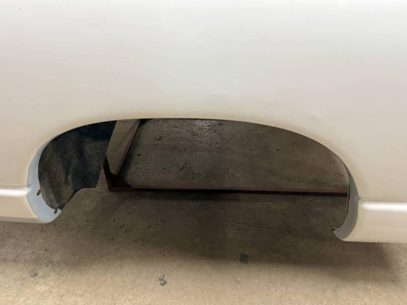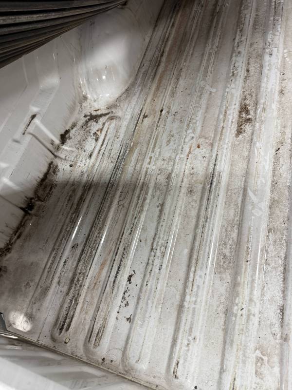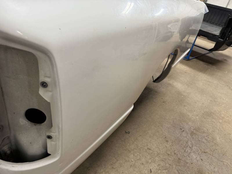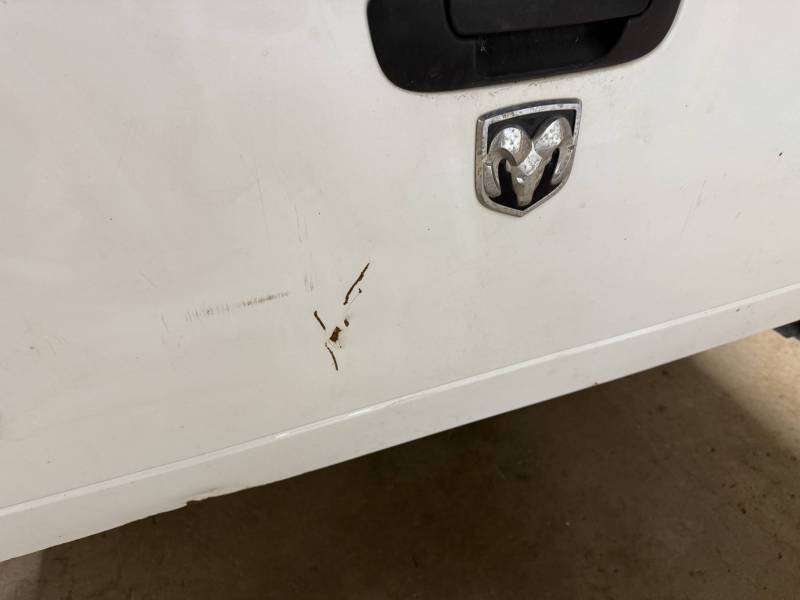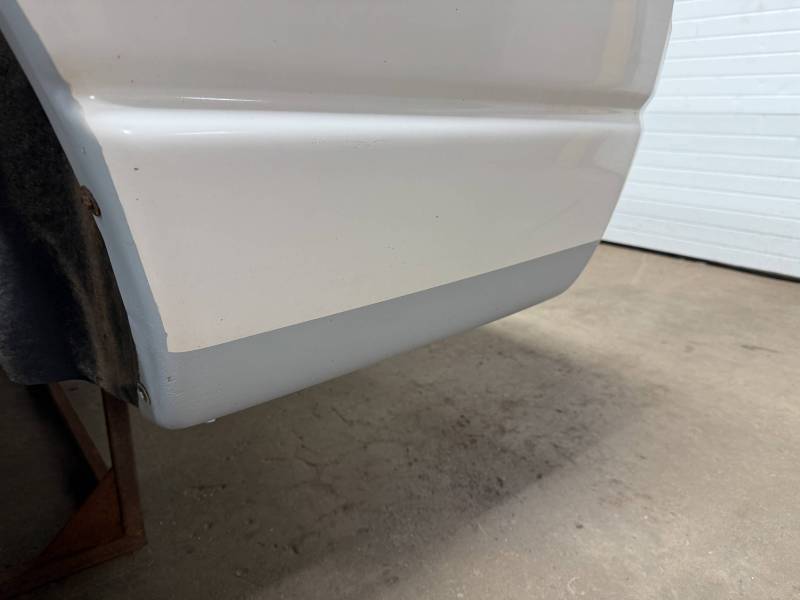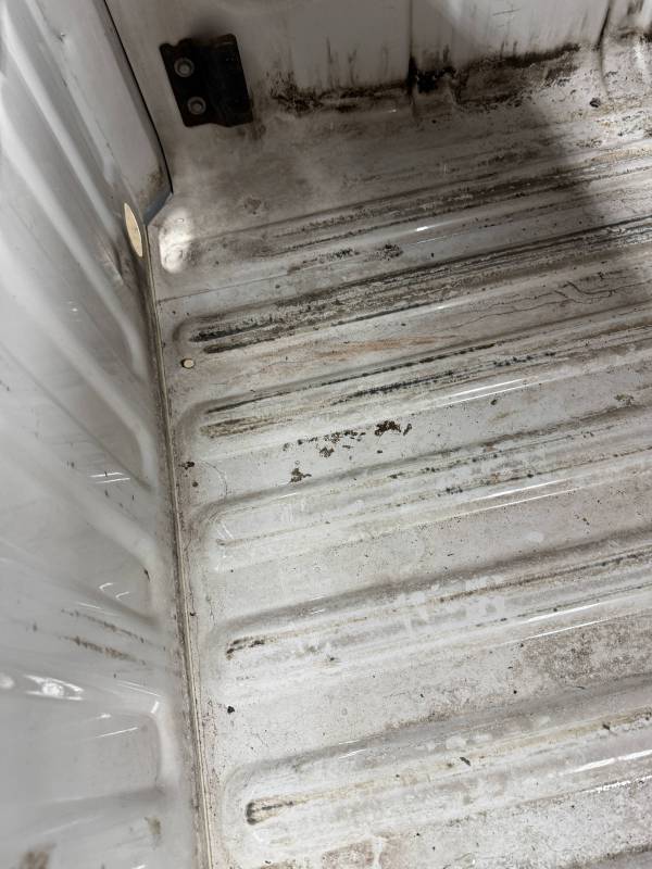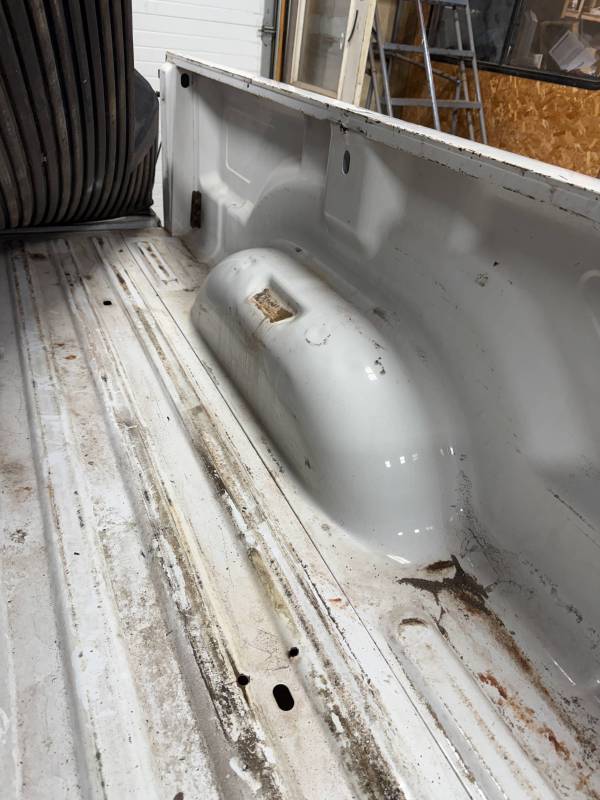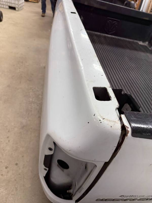 This bed comes with a tailgate but does not include the taillights. The tailgate has (8) dime-sized dents on the outside, along with a quarter-sized dent. This bed has a plastic bed liner. There are (3) holes drilled in each top rail from a toolbox, along with dents and dings on both top rails. There are (6) 1/2" holes drilled in the floor, along with (2) 1/2" holes drilled on both inner bed rails.