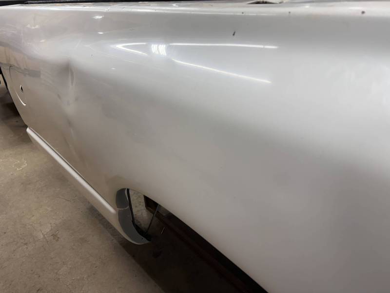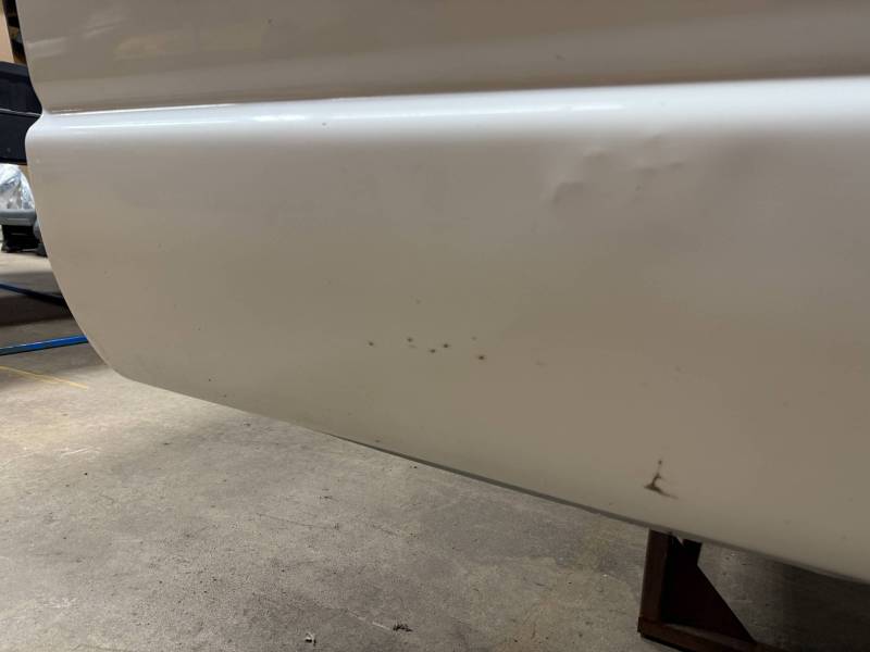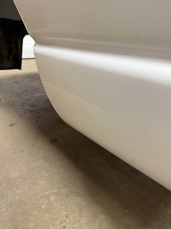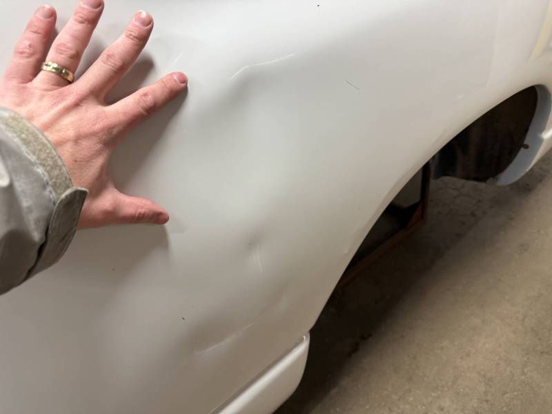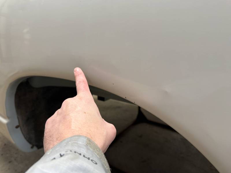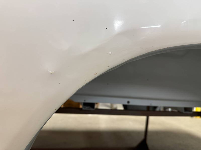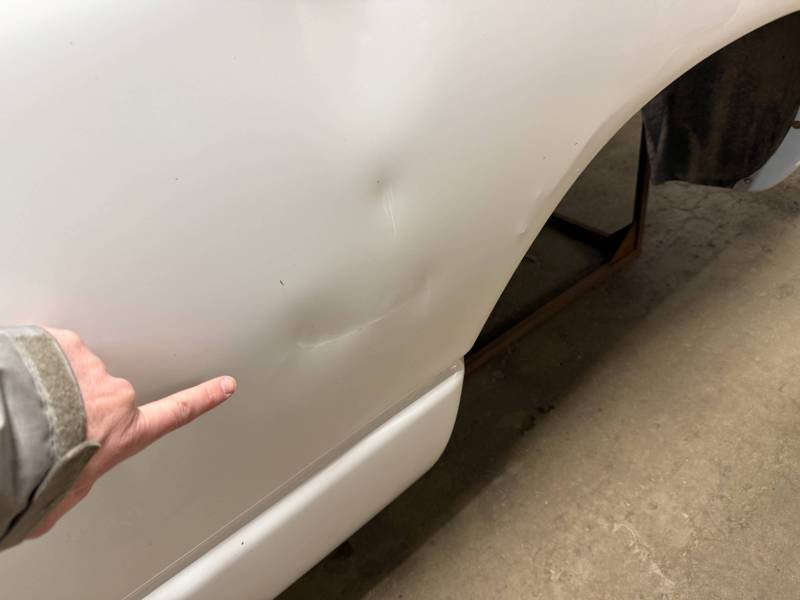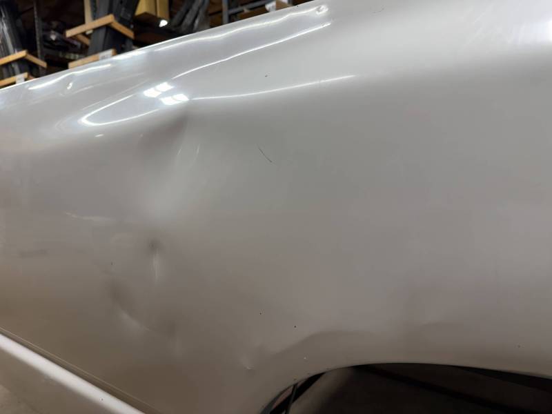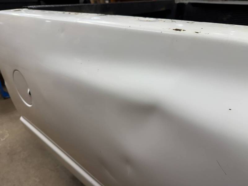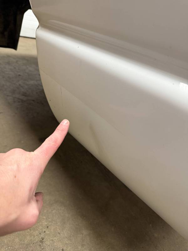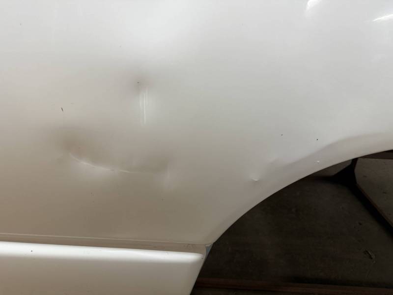 The left/(driver's) side by the top rail has (2) quarter-sized dents, and the left side has a softball-sized dent along with (3) golfball-sized dents. The left front edge also has a goofball-sized dent. The left side of the fuel door has a flat outty dent along with a goofball-sized dent. The left front lower has a 6" crease and outty dents. The left wheel arch has (4) outty dents and a minor bend. The left rear has a faint 12" crease.