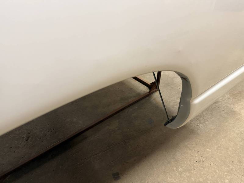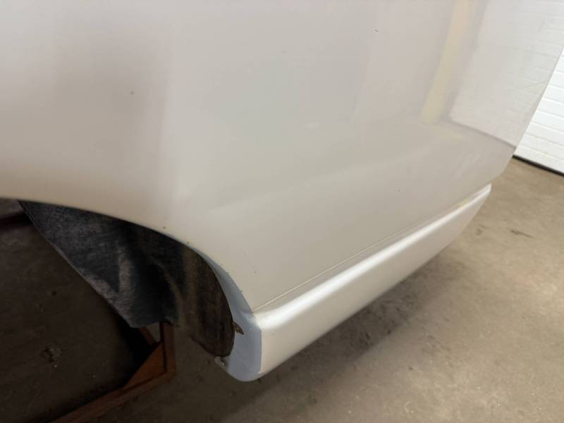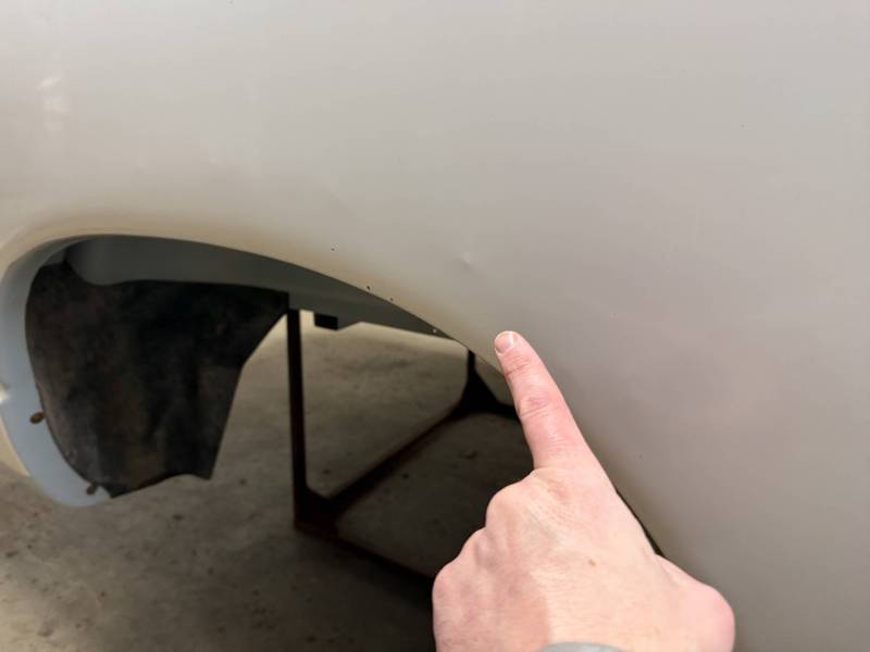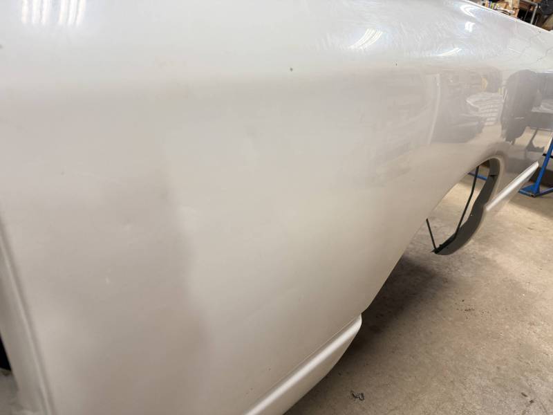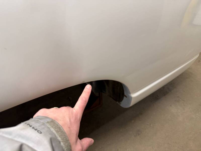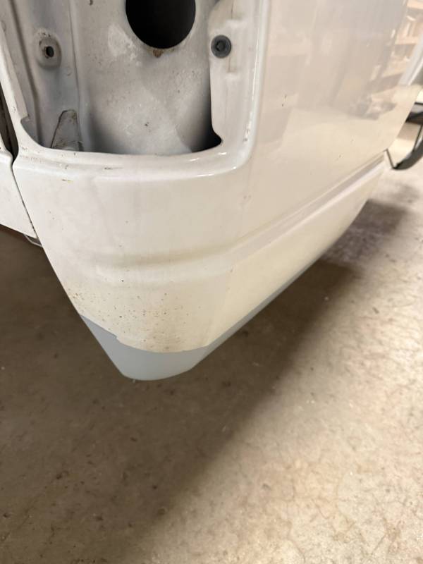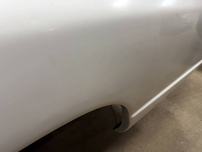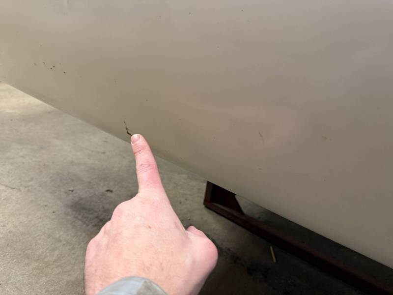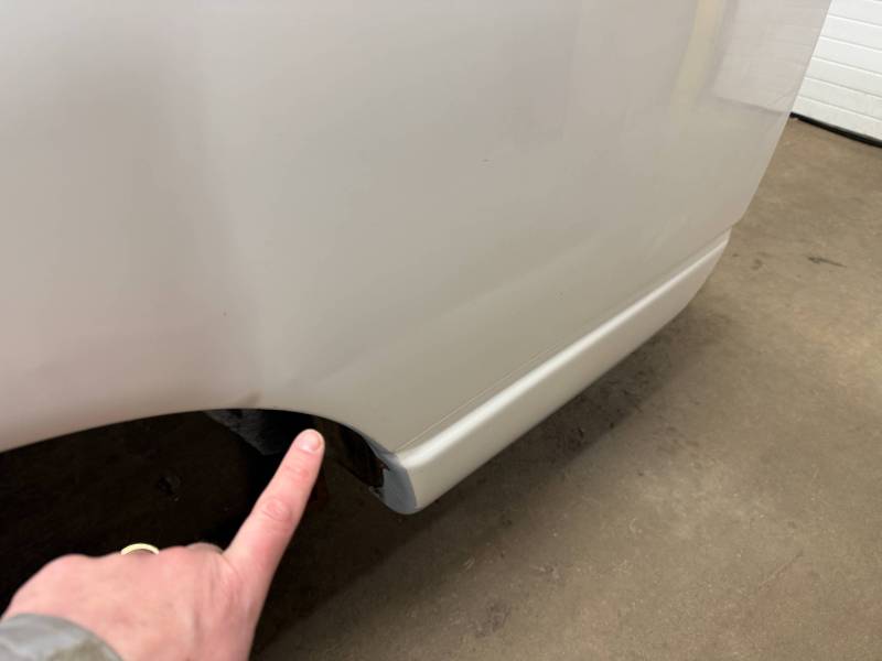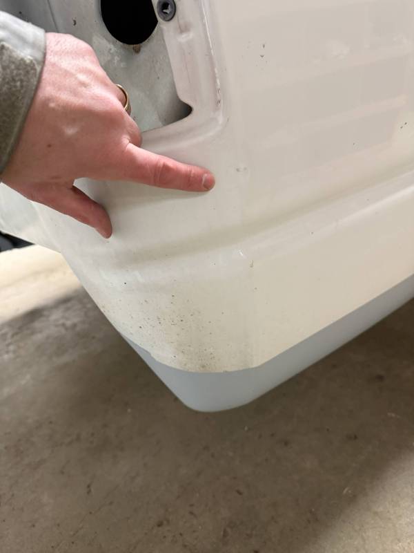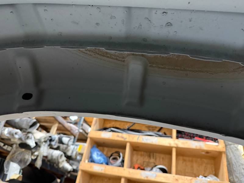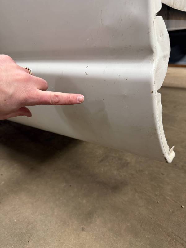 The left/(driver's) side by the top rail has (2) quarter-sized dents, and the left side has a softball-sized dent along with (3) golfball-sized dents. The left front edge also has a goofball-sized dent. The left side of the fuel door has a flat outty dent along with a goofball-sized dent. The left front lower has a 6" crease and outty dents. The left wheel arch has (4) outty dents and a minor bend. The left rear has a faint 12" crease.
