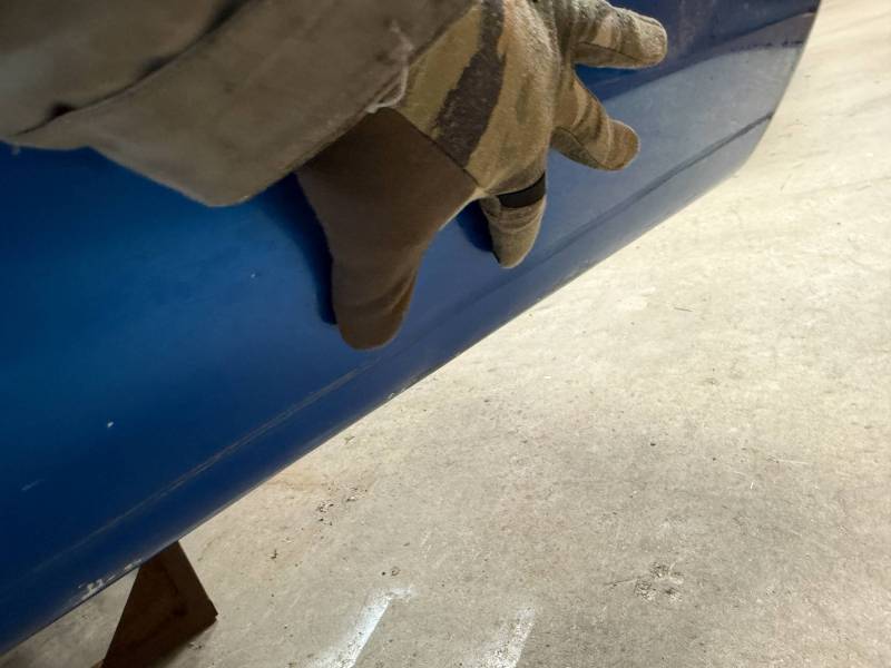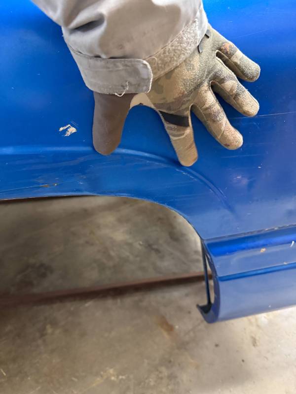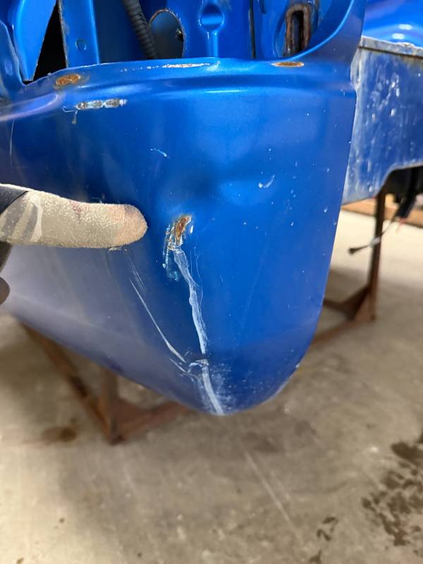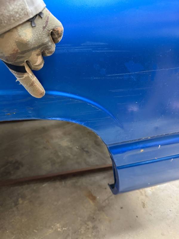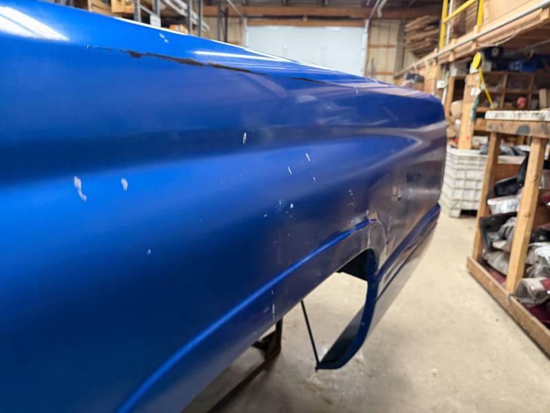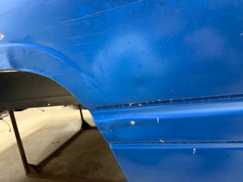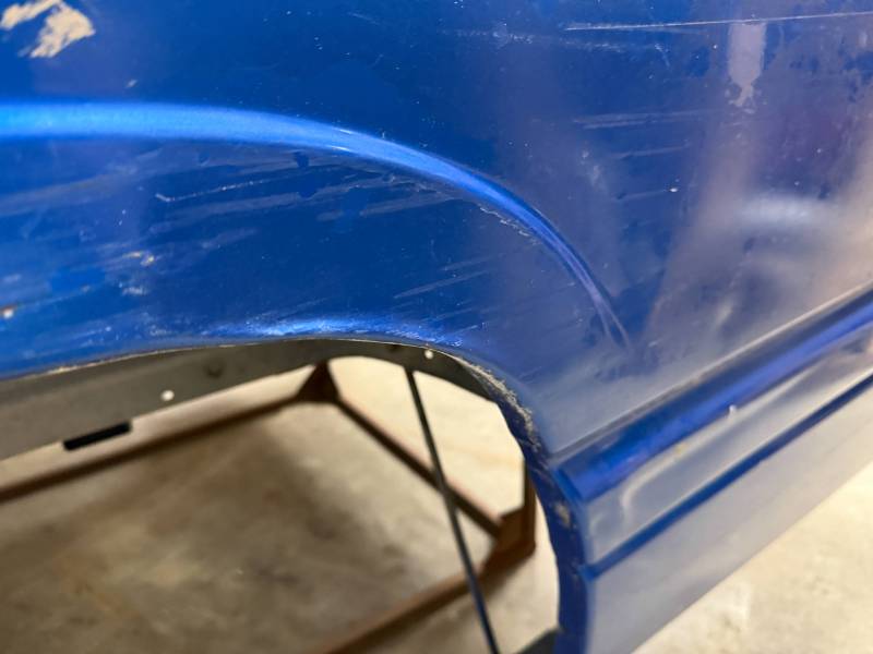 The right/(passenger's) side has (2) quarter-sized dents and a goofball-sized dent. The right front wheel arch has (3) quarter-sized dents, and the right front lower has (3) quarter-sized dents. The right front lower has a 30" crease along with (2) baseball-sized dents. The right front edge is dented in.