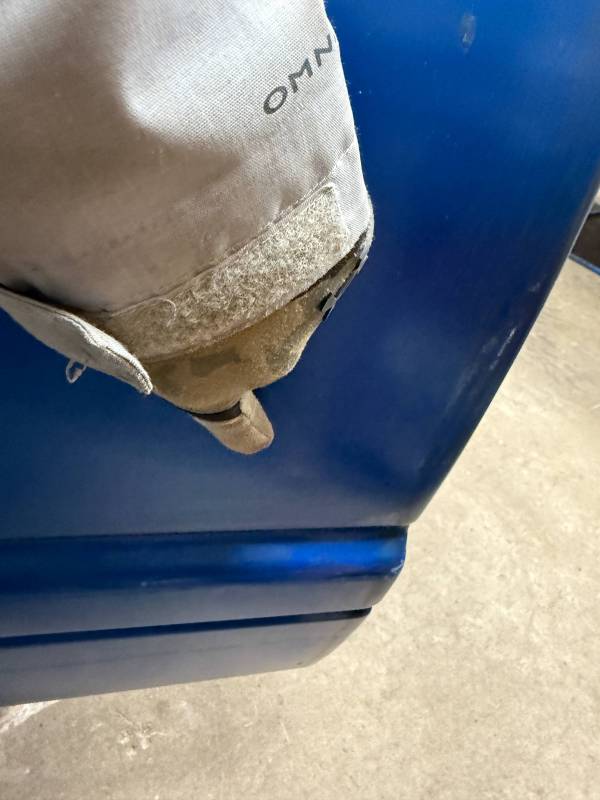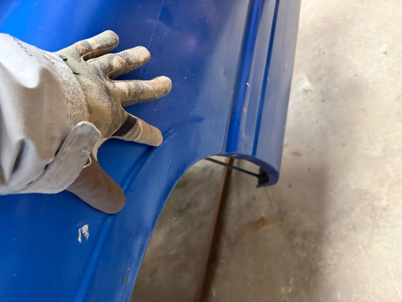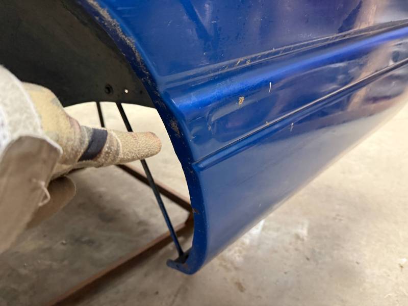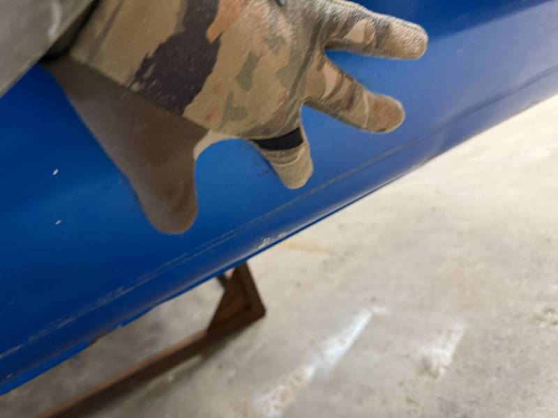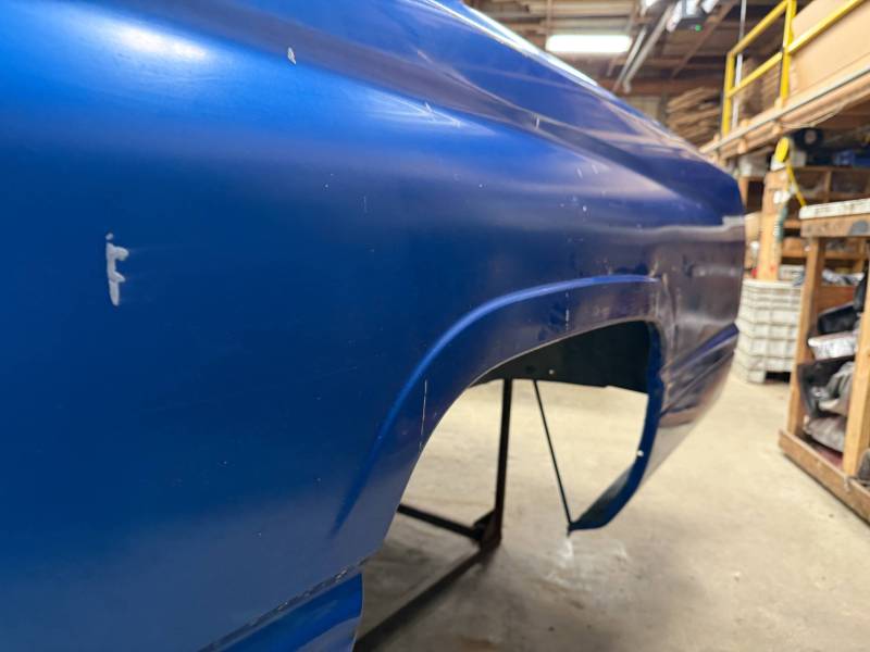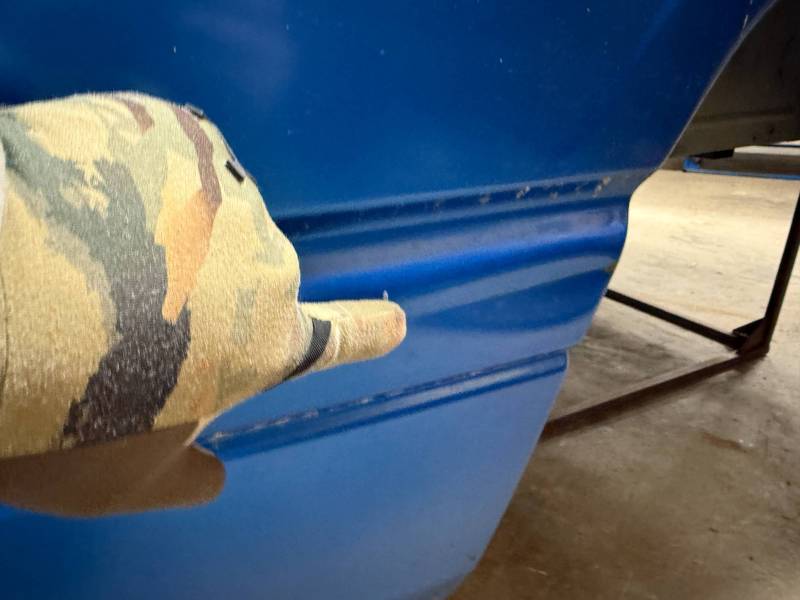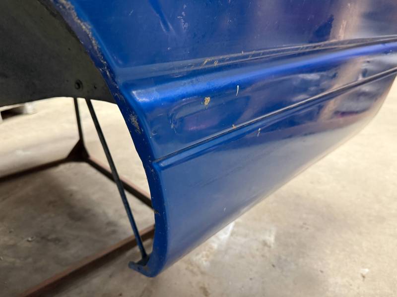 The right/(passenger's) side has (2) quarter-sized dents and a goofball-sized dent. The right front wheel arch has (3) quarter-sized dents, and the right front lower has (3) quarter-sized dents. The right front lower has a 30" crease along with (2) baseball-sized dents. The right front edge is dented in.