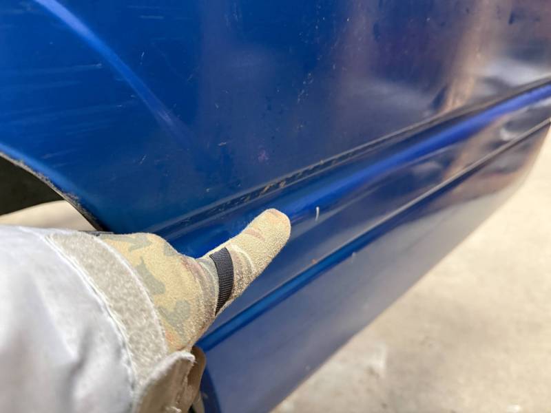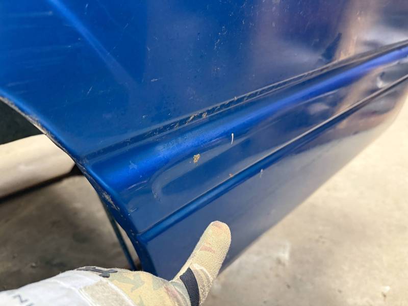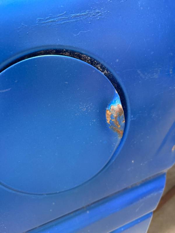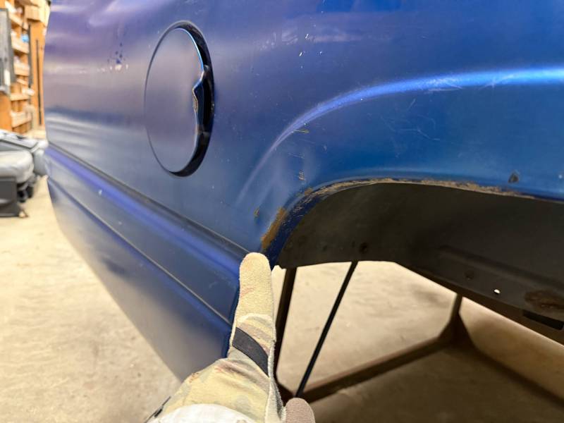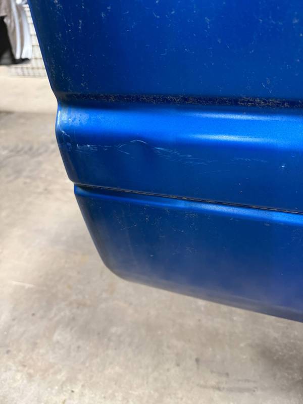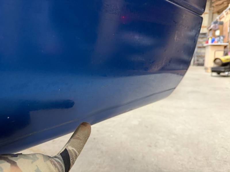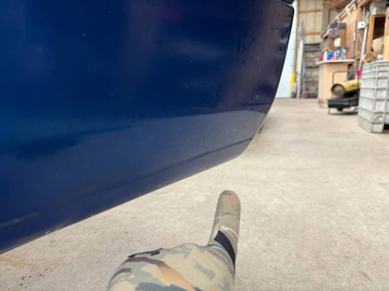 The left/(driver's) side front lower has (2) quarter-sized dents, and the left side has a dime-sized ding. The left side by the fuel door has (2) quarter-sized dents, and the left side front wheel arch has (3) quarter-sized dents. The left rear under the taillight opening has (3) quarter-sized dents.