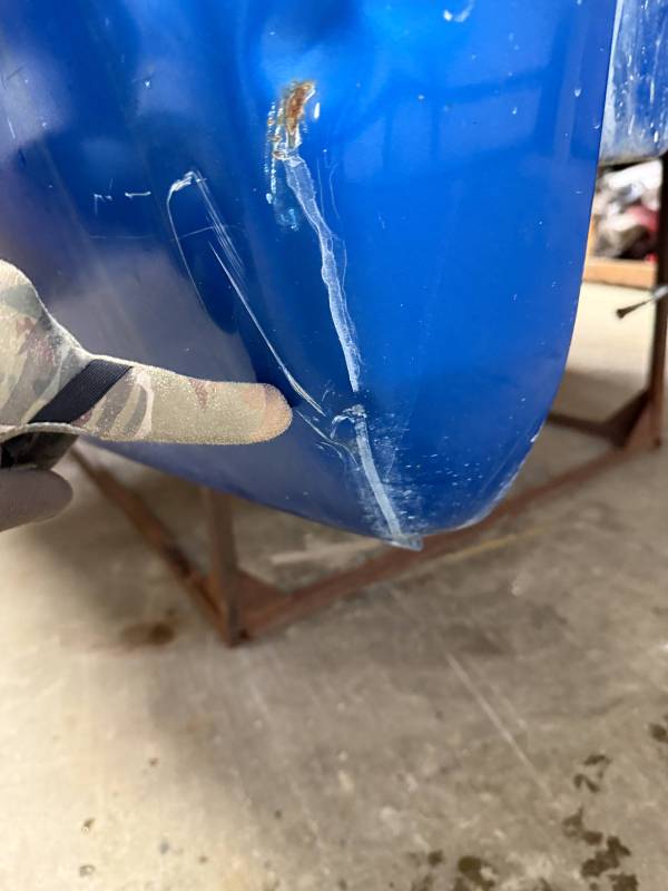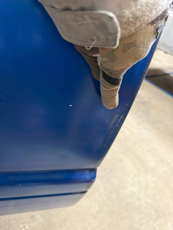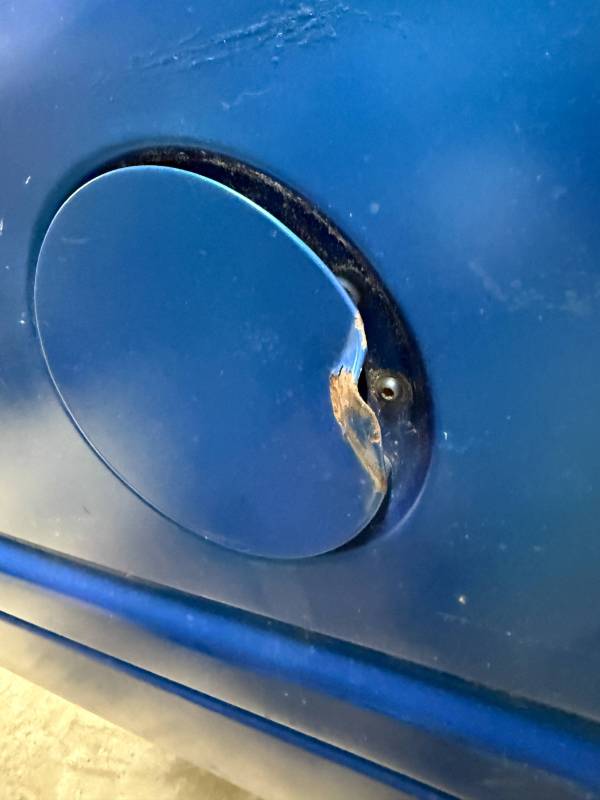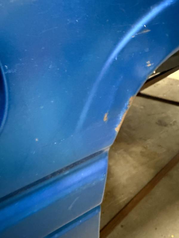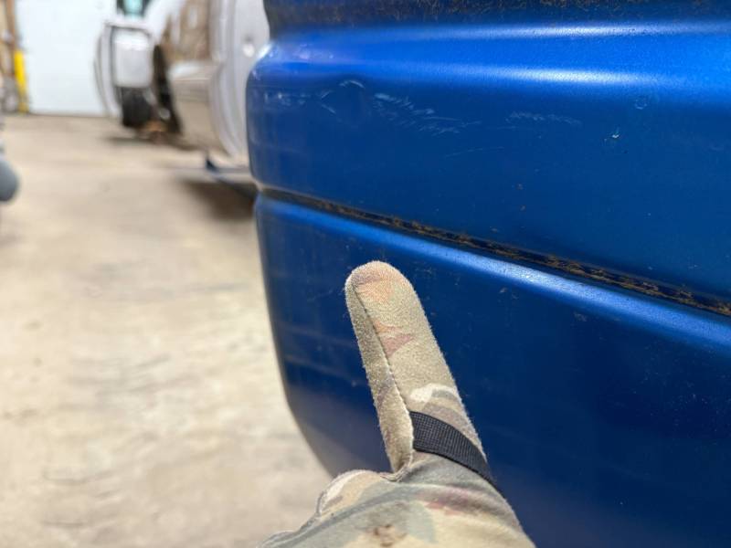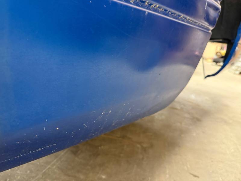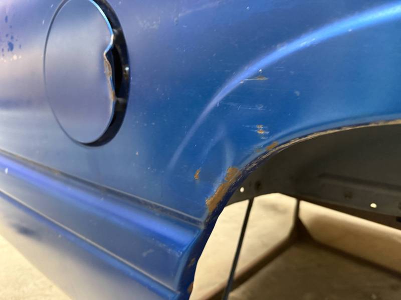The left/(driver's) side front lower has (2) quarter-sized dents, and the left side has a dime-sized ding. The left side by the fuel door has (2) quarter-sized dents, and the left side front wheel arch has (3) quarter-sized dents. The left rear under the taillight opening has (3) quarter-sized dents.