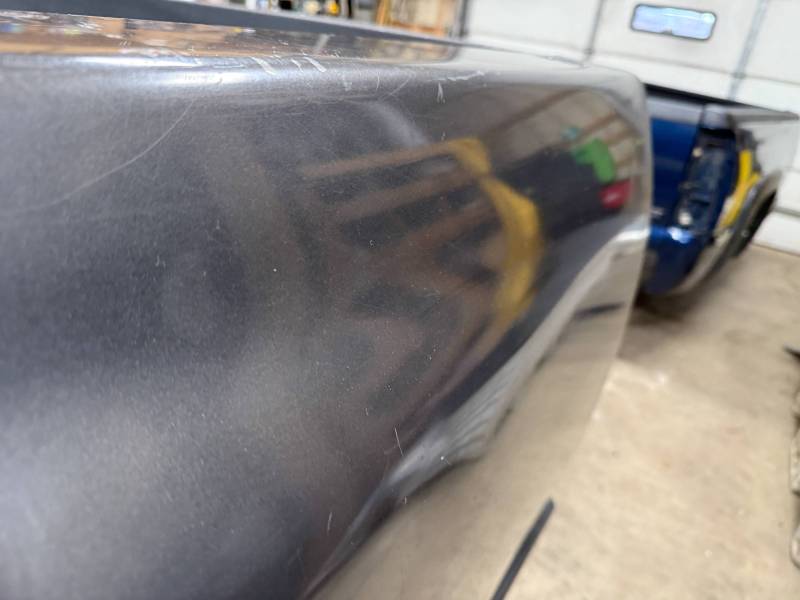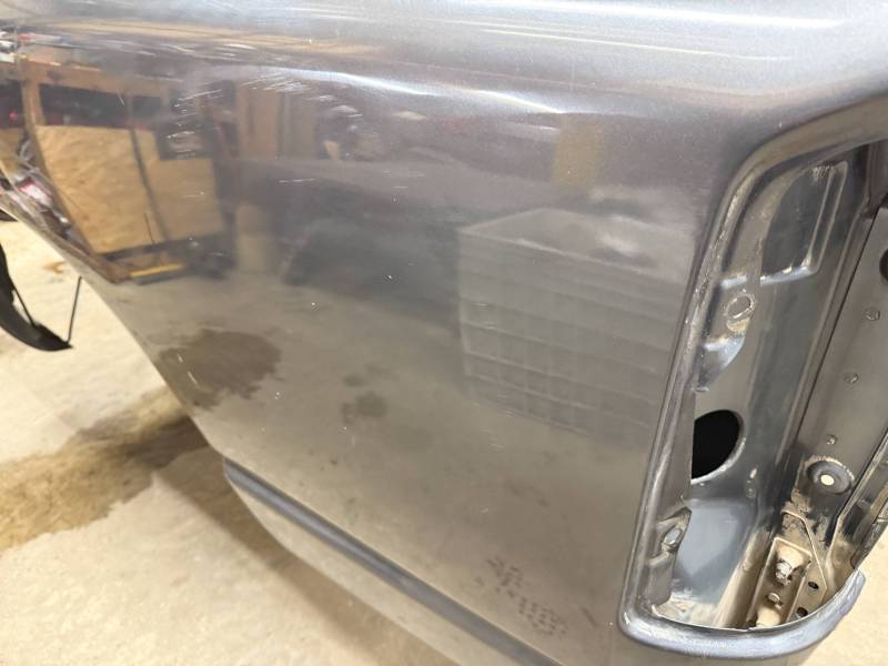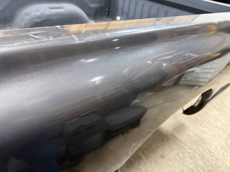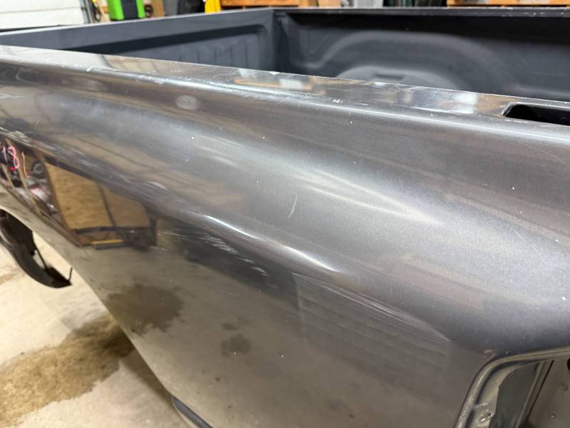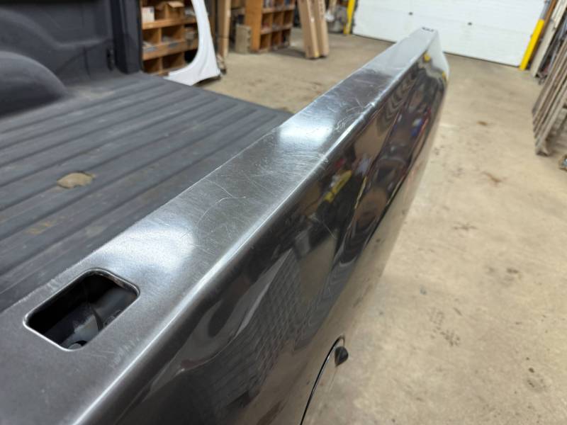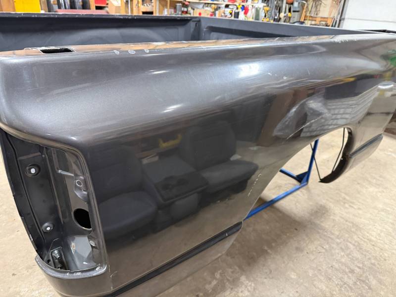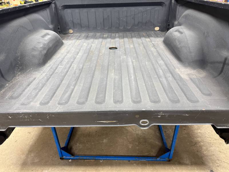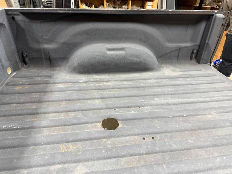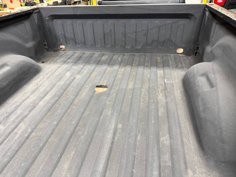 This bed comes without taillights and without a tailgate. This bed has a sprayed-in bed liner, and there is a 4" gooseneck hole in the floor and a 1" hole in the left front of the floor. There are also (6) 1/8" holes in the floor, and there are dings and dents on the top of the bed rails. There are also scratches on both sides.