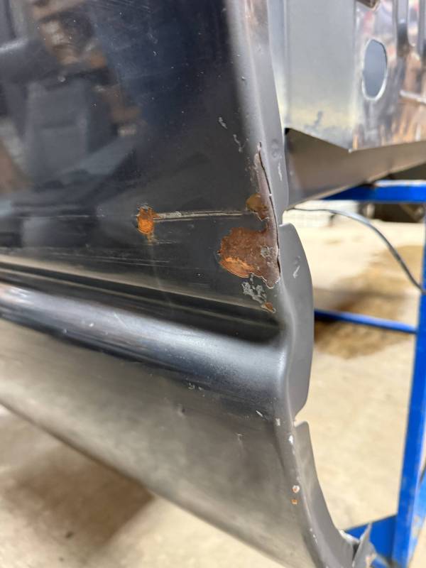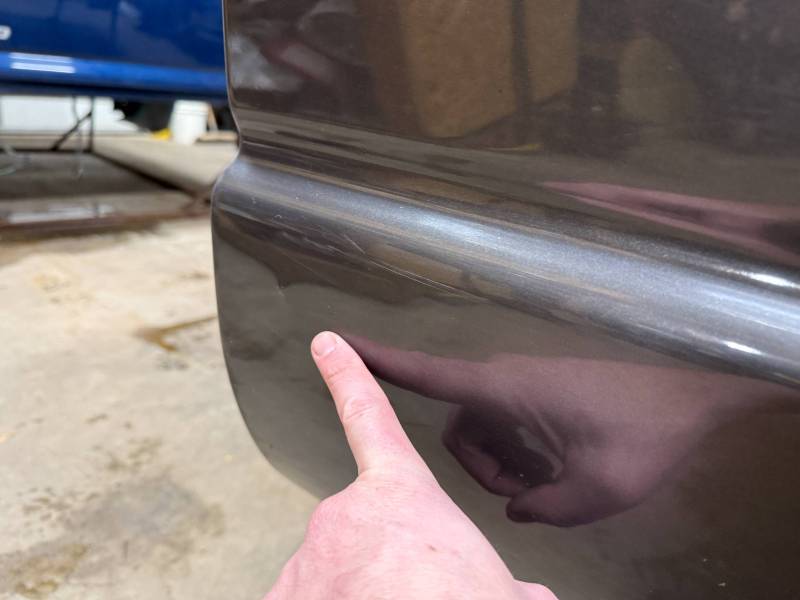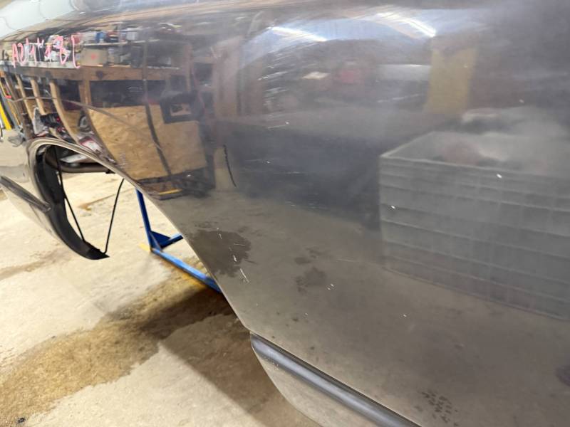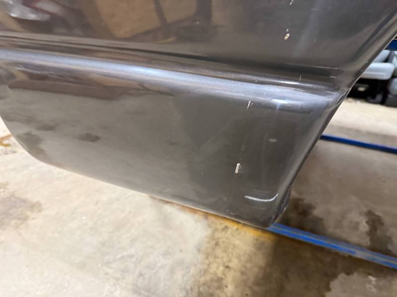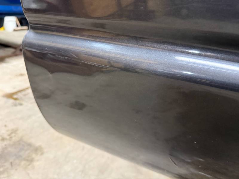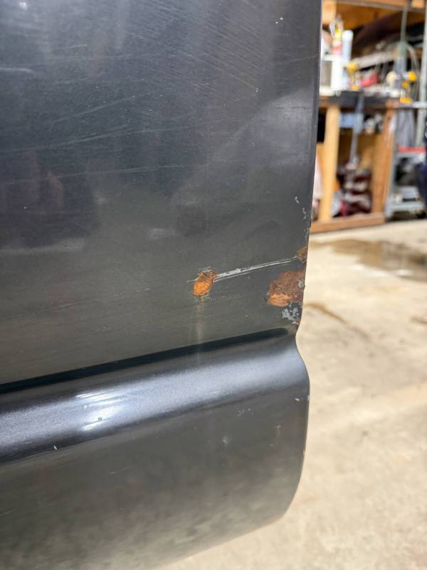 The right (passenger's) front side has an outty dent and a goofball-sized dent, along with some surface rust. The right rear has a dime-sized ding, and the right wheel arch has (3) outty dents.