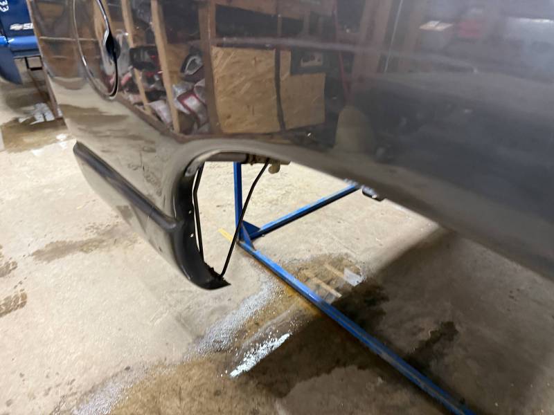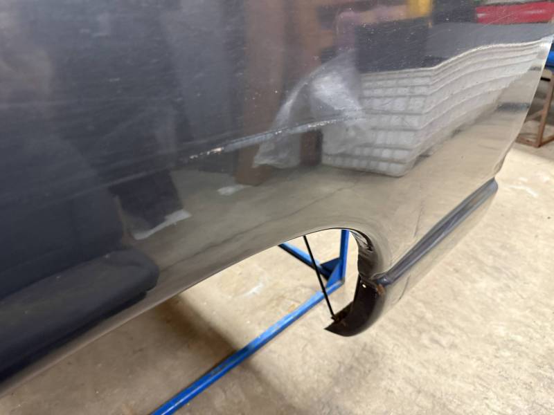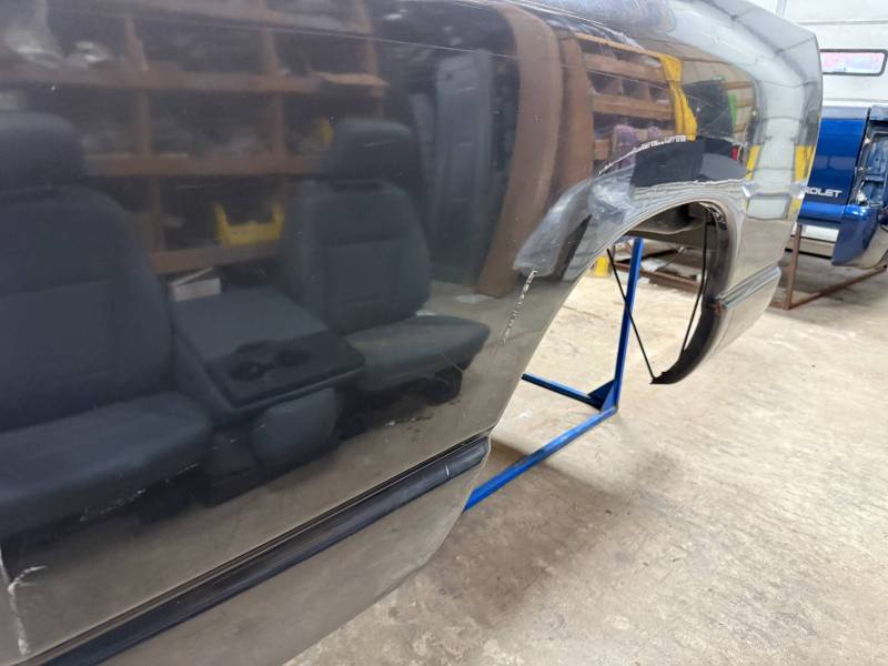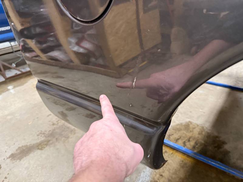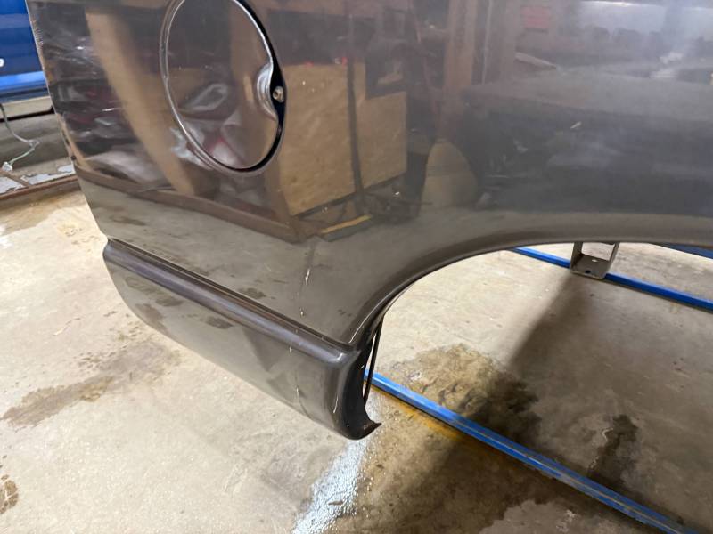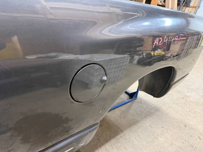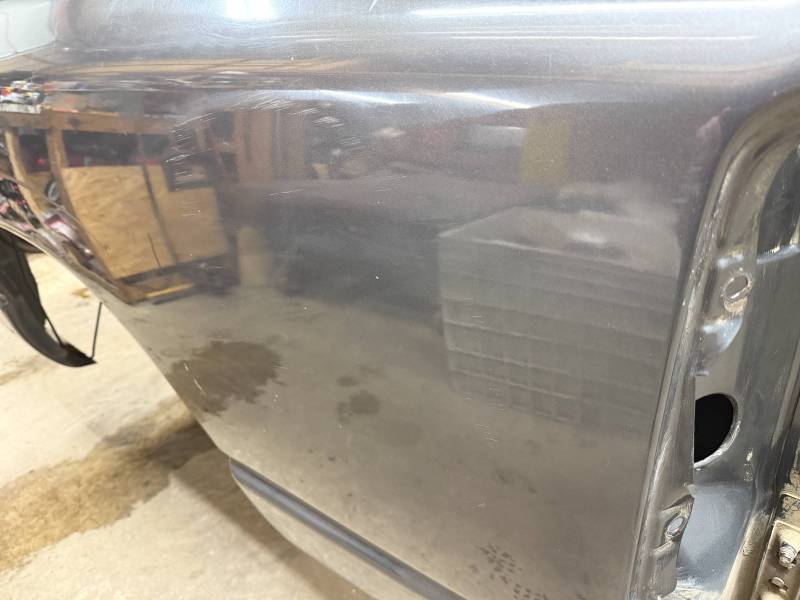 The right (passenger's) front side has an outty dent and a goofball-sized dent, along with some surface rust. The right rear has a dime-sized ding, and the right wheel arch has (3) outty dents.