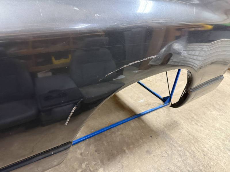 The left (driver's) side front has an outty dent, and the left wheel arch has (2) outty dents.