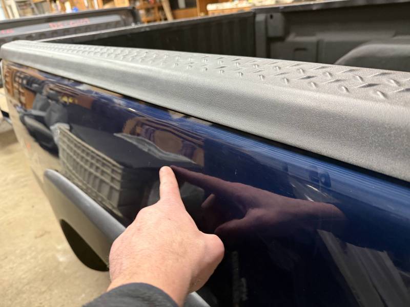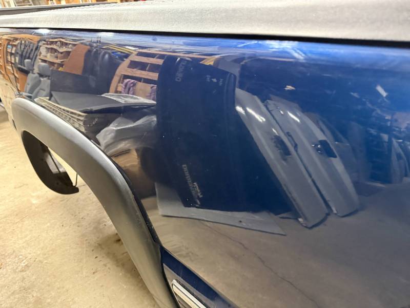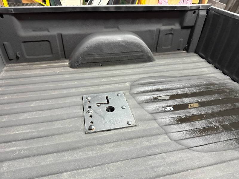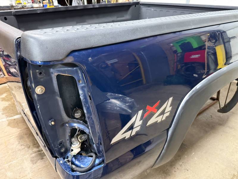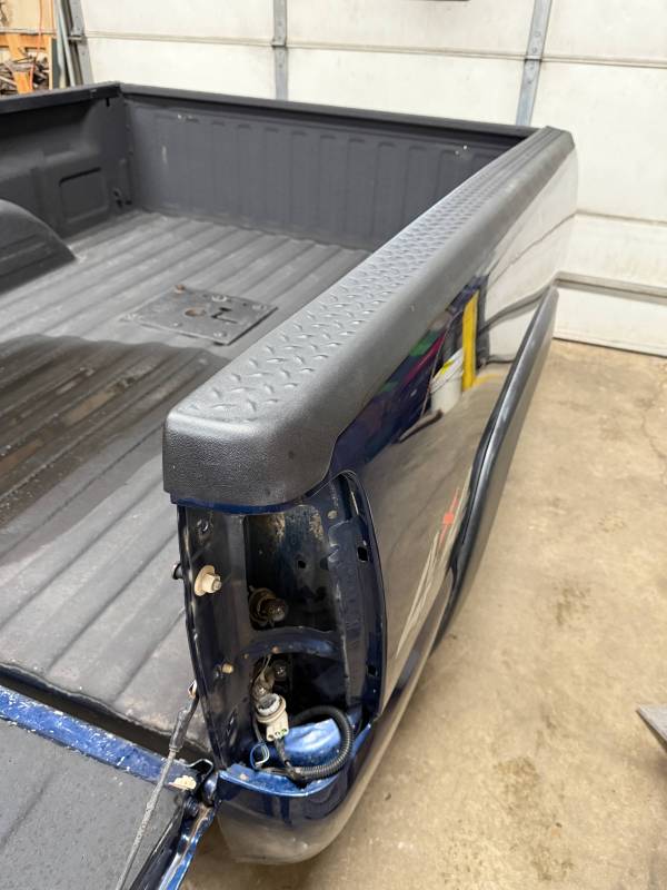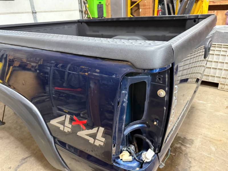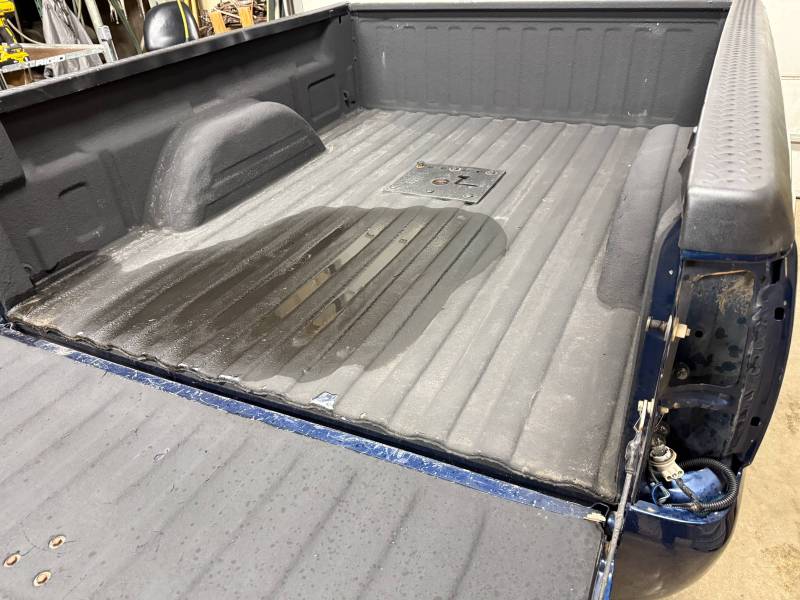 This bed comes without taillights, but it does include a tailgate. This bed has a sprayed-in bed liner, and black plastic bed rail caps are on the top rails and the tailgate. There is a 12"x12" gooseneck mount in the floor,r and there are also (2) holes drilled in the header panel. This bed also has black factory fender flares.