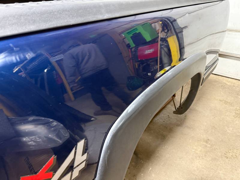 The left (driver's) side has a quarter-sized dent, and the left front also has a quarter-sized dent. There is also a large spot of rust under the fender flare in the wheel well.