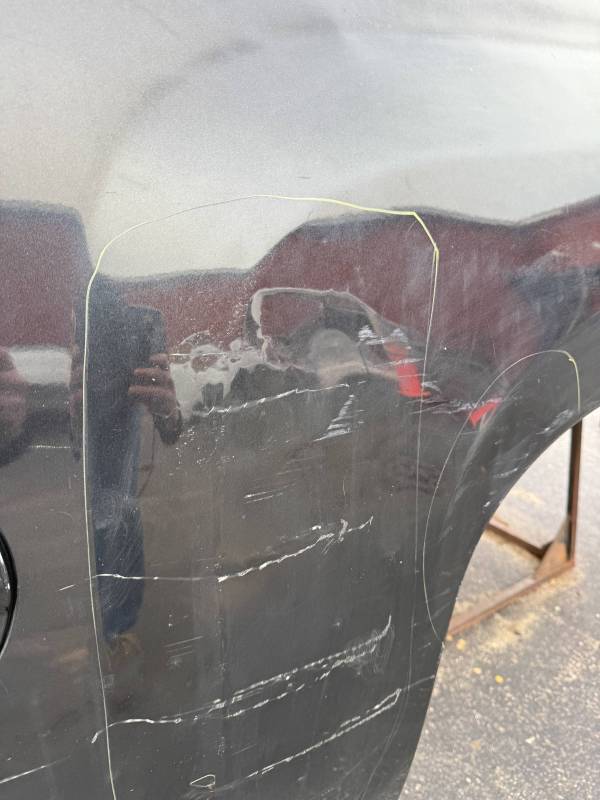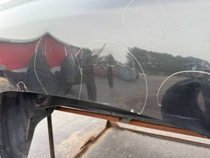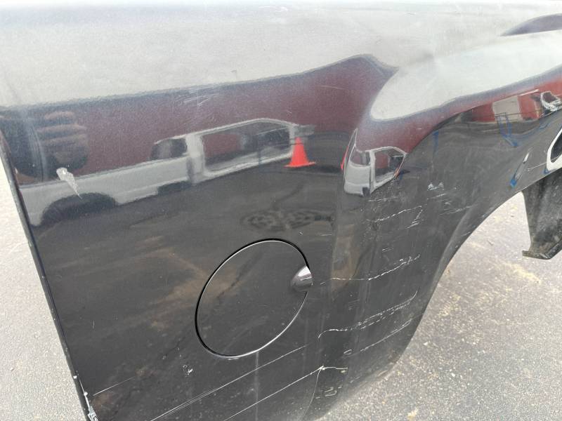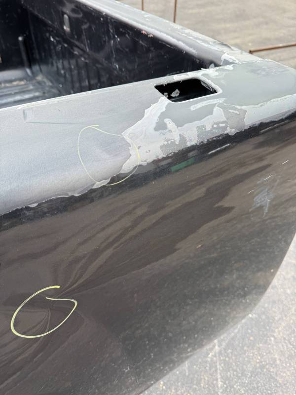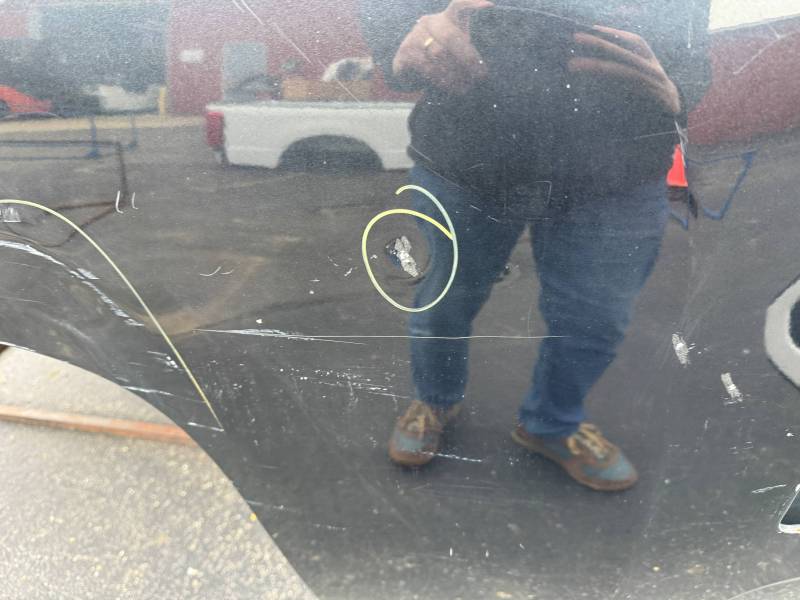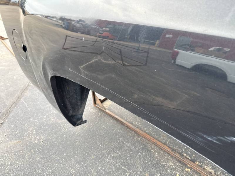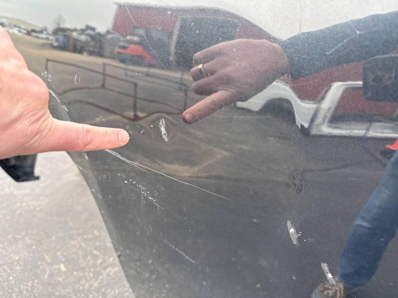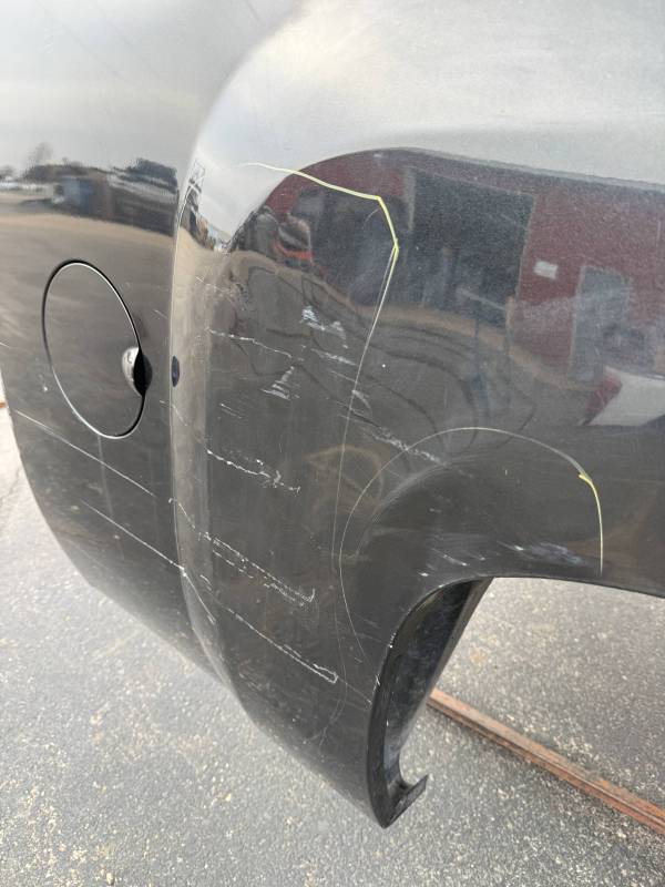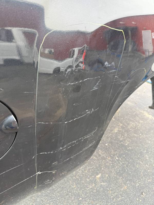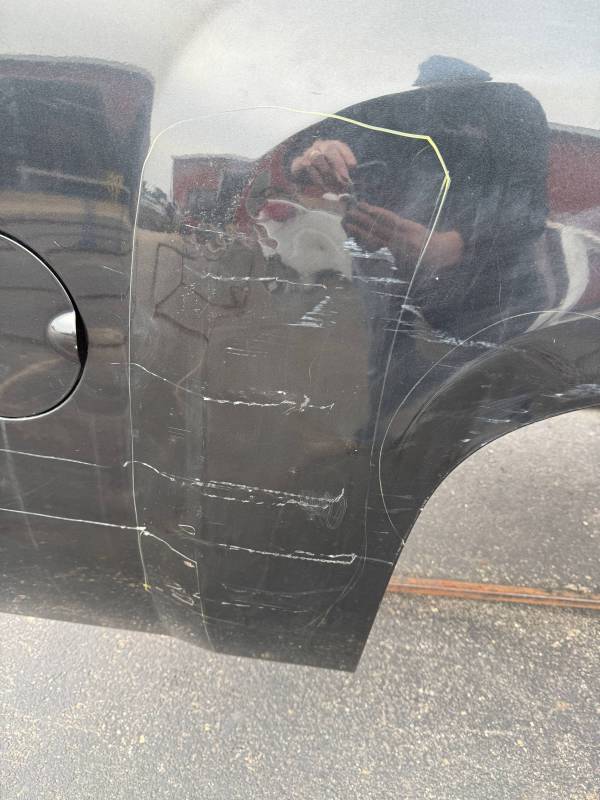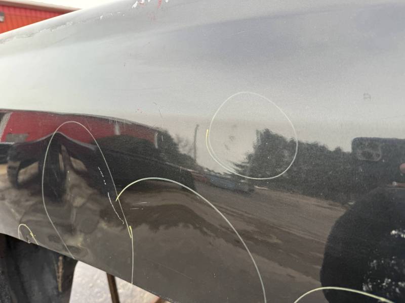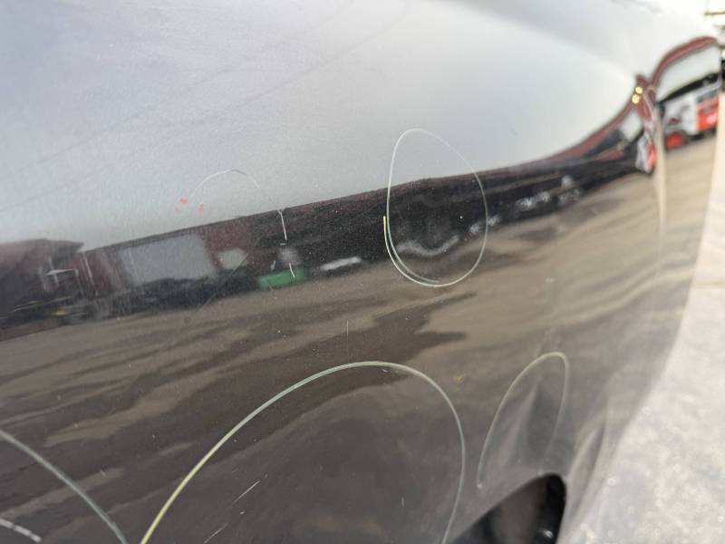 The left (driver's) side wheel arch has (3) baseball-sized dents and a softball-sized dent. The left front is dented up from the top to the bottom, and the left rear has (2) quarter-sized dents. The left rear above the taillight opening has numerous dents, along with (4) golf ball-sized dents.