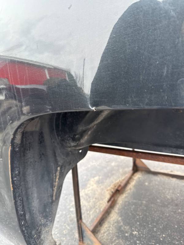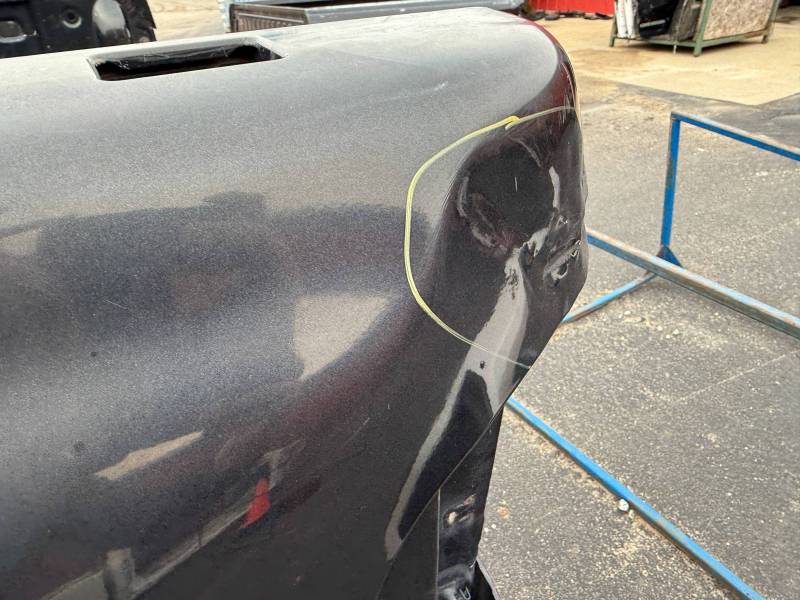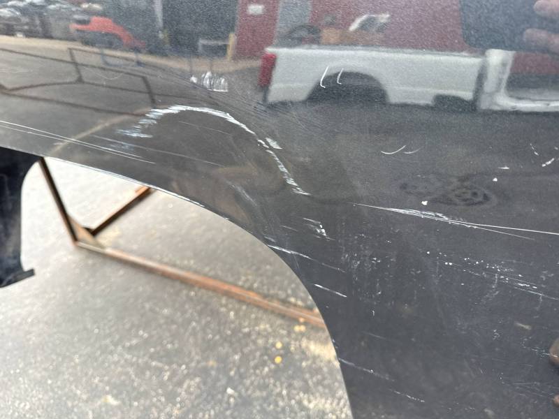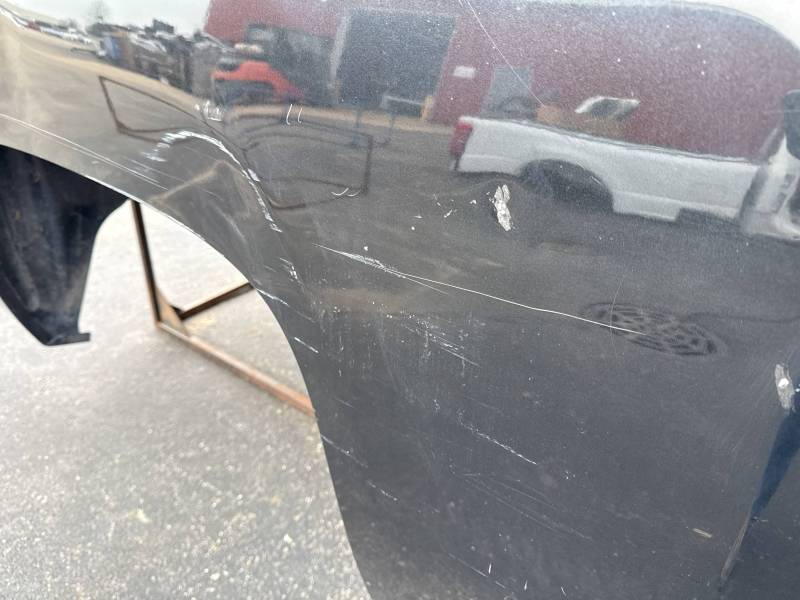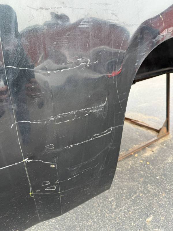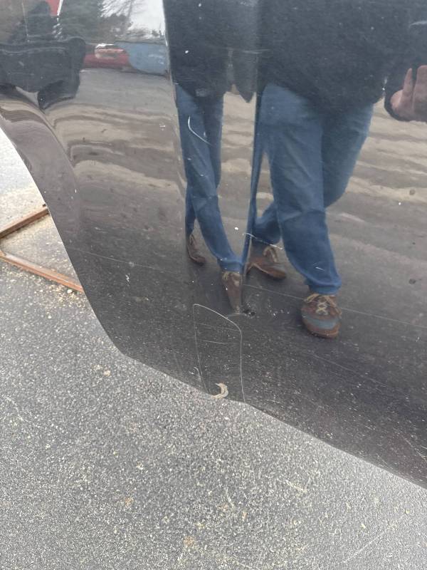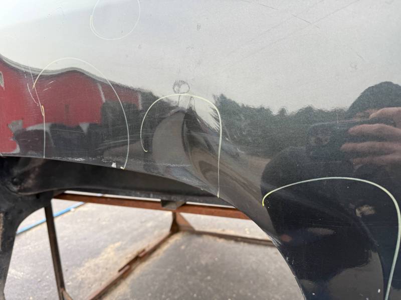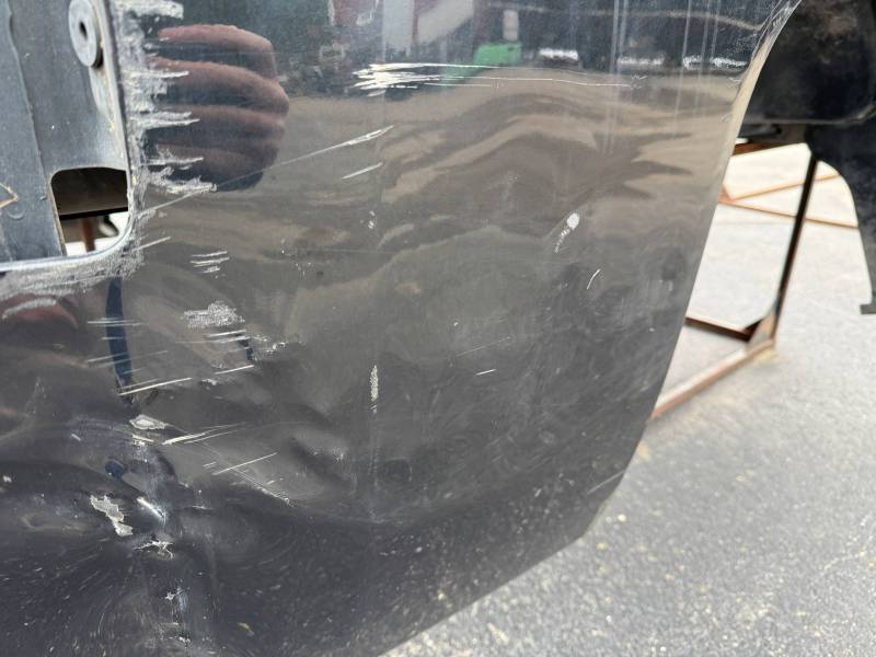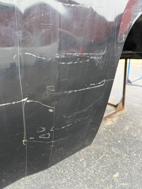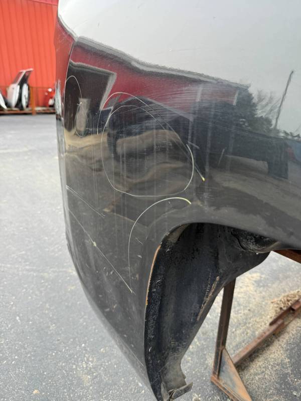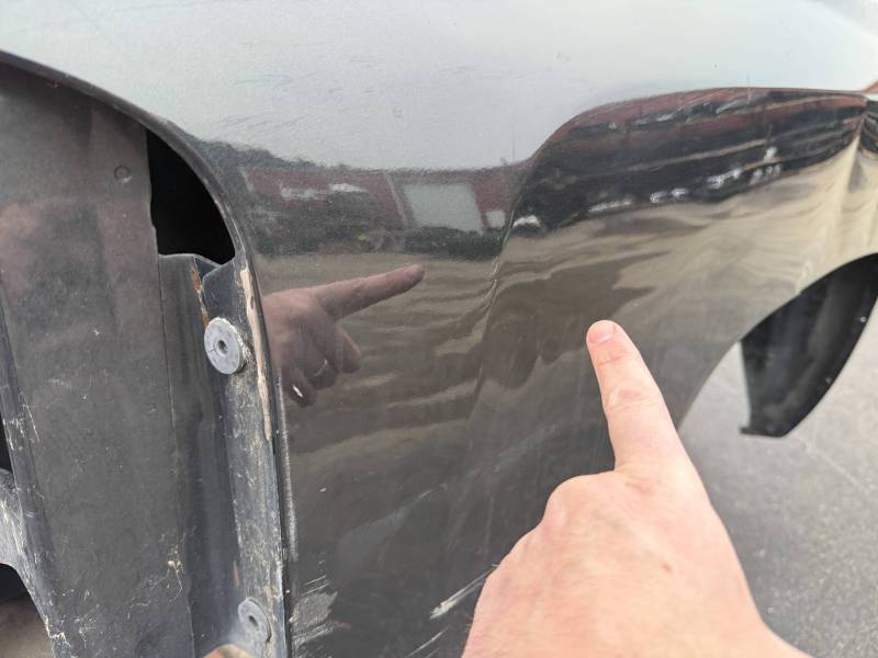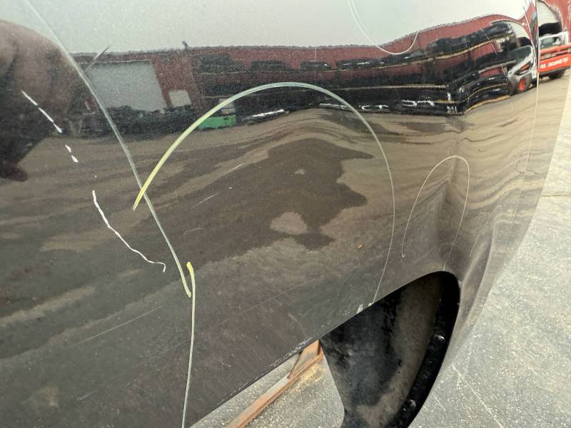 The left (driver's) side wheel arch has (3) baseball-sized dents and a softball-sized dent. The left front is dented up from the top to the bottom, and the left rear has (2) quarter-sized dents. The left rear above the taillight opening has numerous dents, along with (4) golf ball-sized dents.