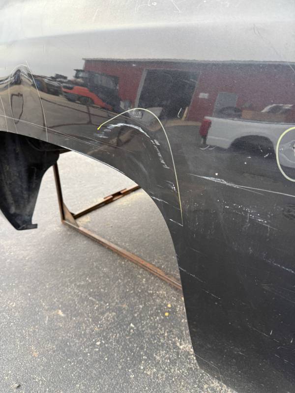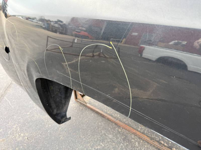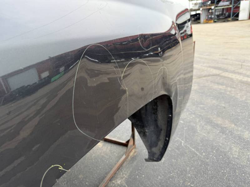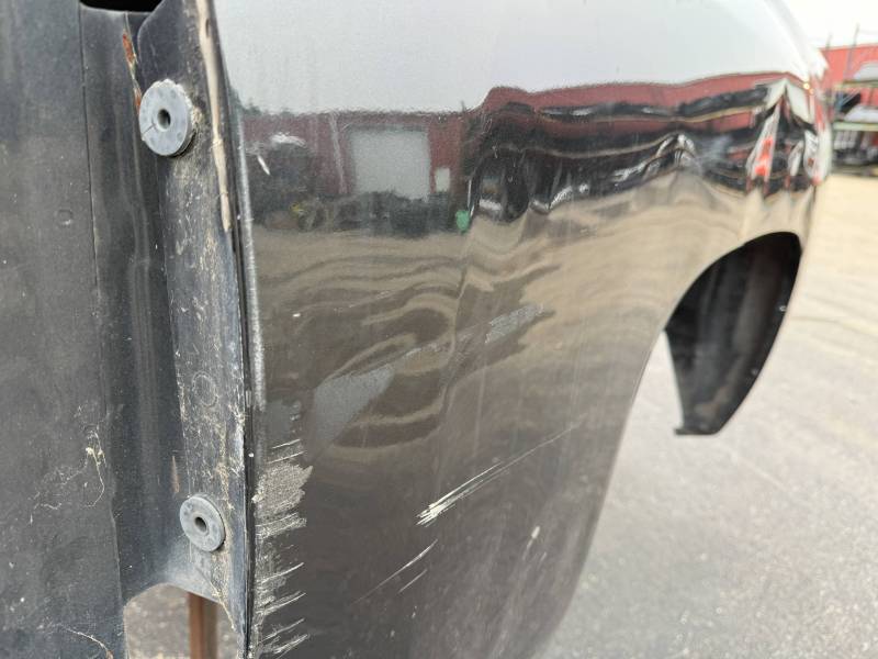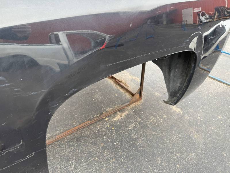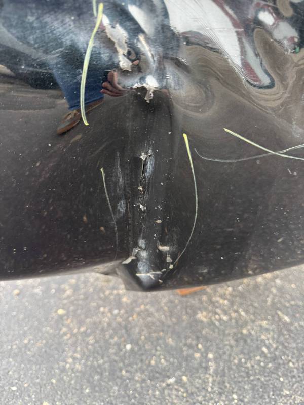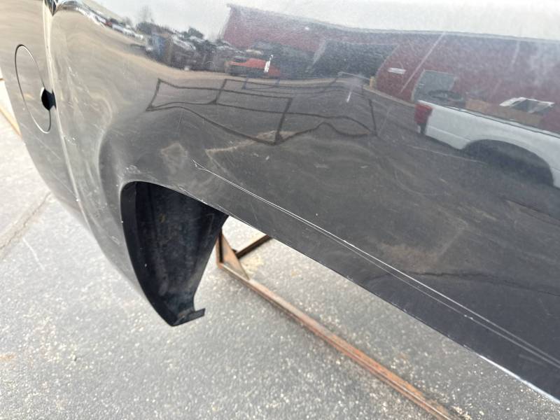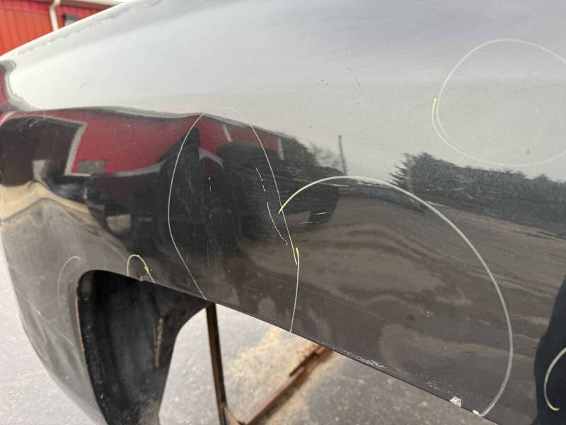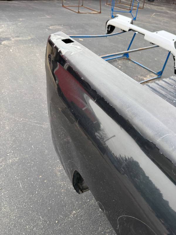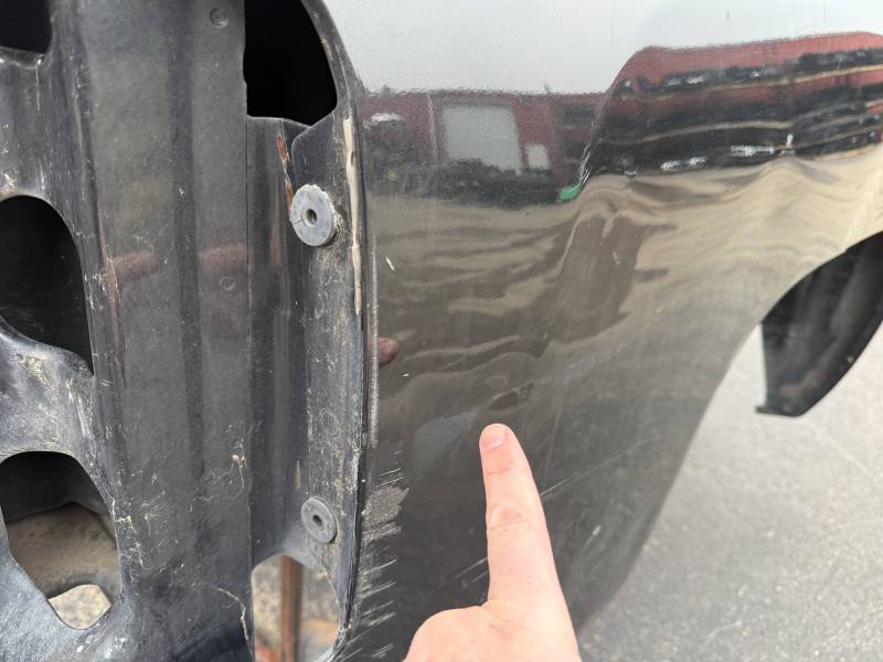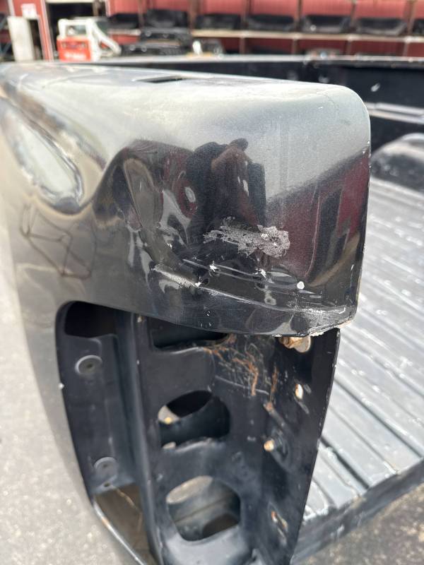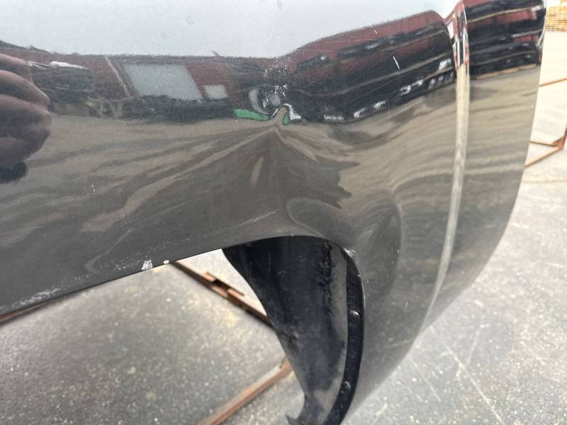 The left (driver's) side wheel arch has (3) baseball-sized dents and a softball-sized dent. The left front is dented up from the top to the bottom, and the left rear has (2) quarter-sized dents. The left rear above the taillight opening has numerous dents, along with (4) golf ball-sized dents.