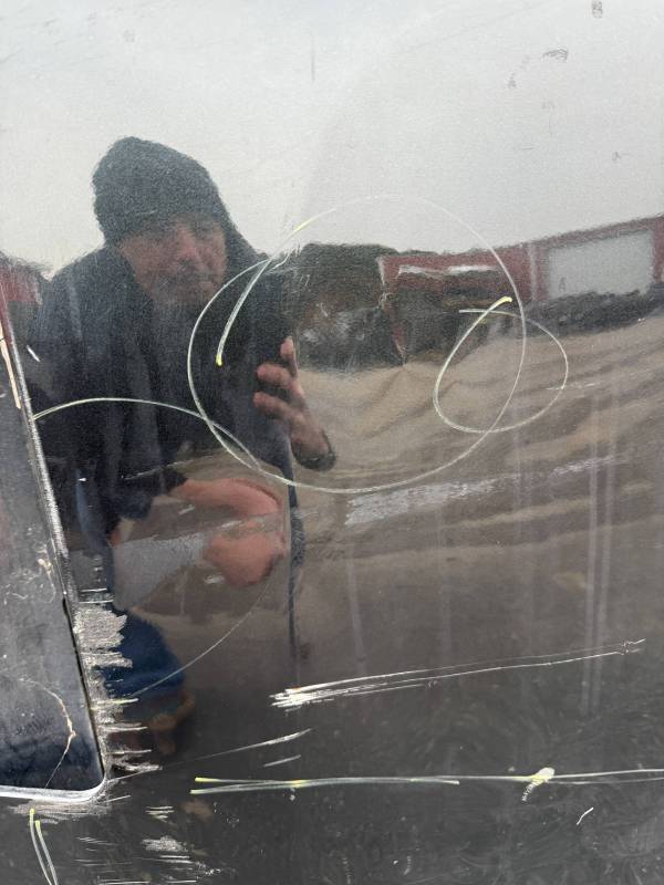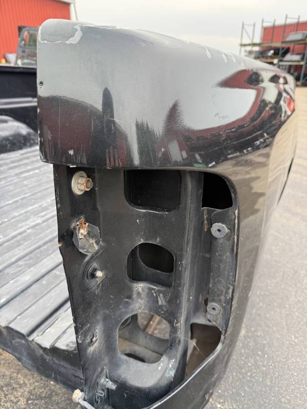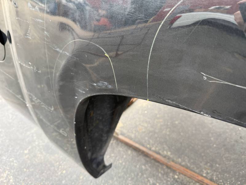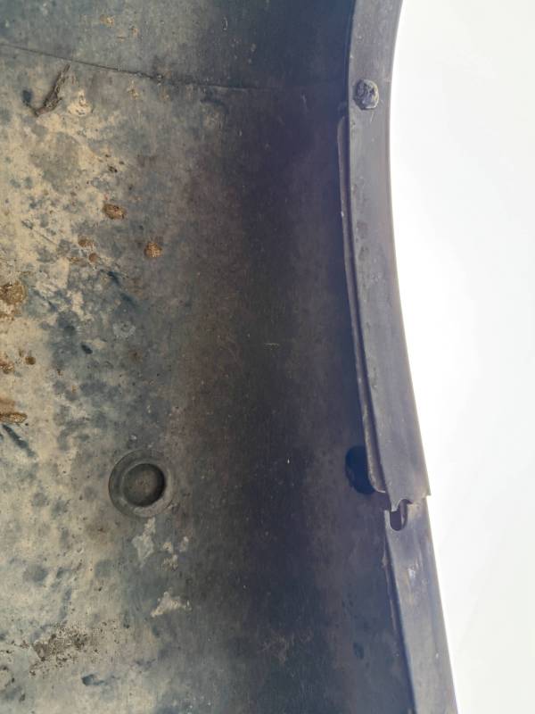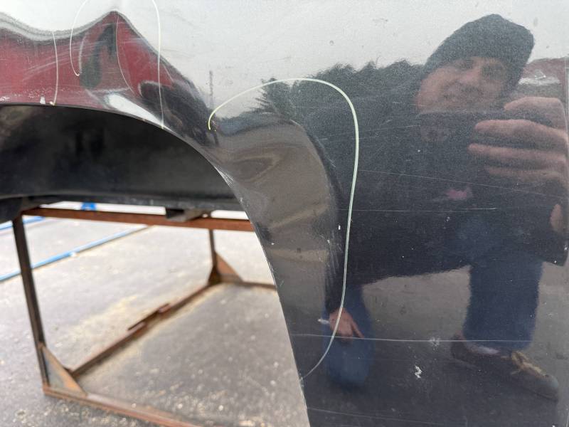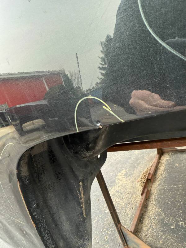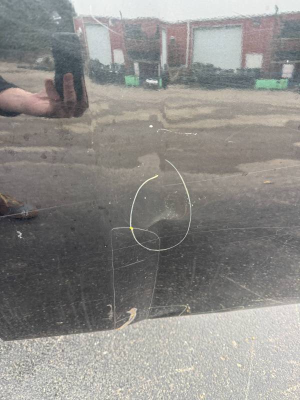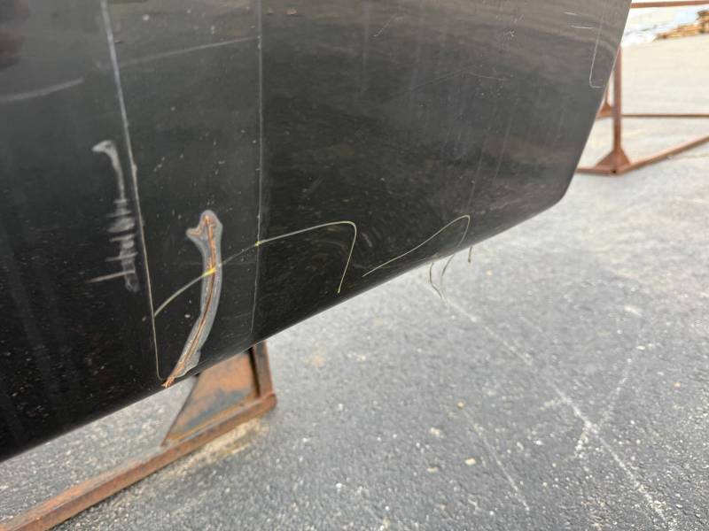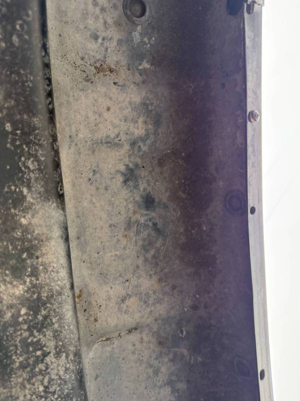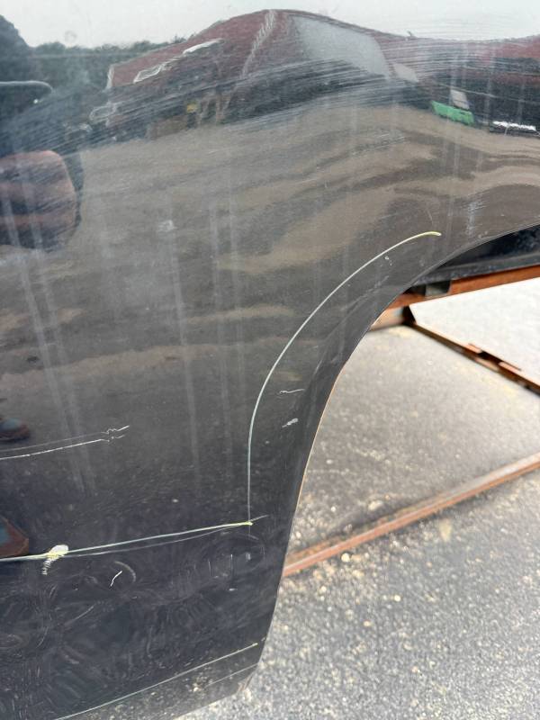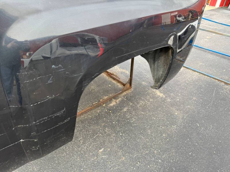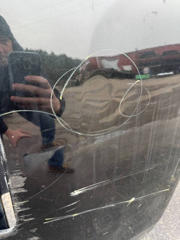 The left (driver's) side wheel arch has (3) baseball-sized dents and a softball-sized dent. The left front is dented up from the top to the bottom, and the left rear has (2) quarter-sized dents. The left rear above the taillight opening has numerous dents, along with (4) golf ball-sized dents.