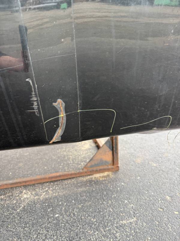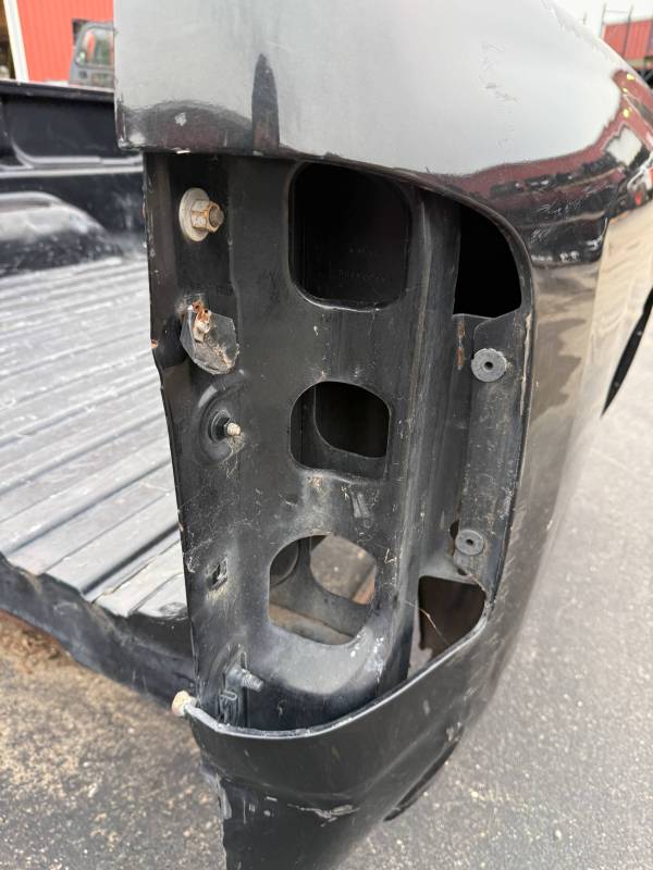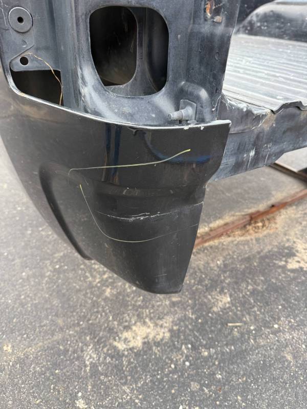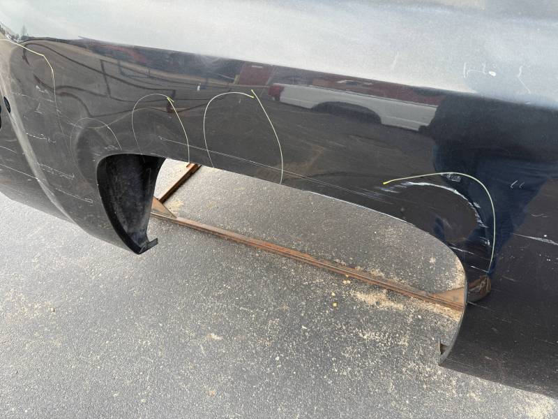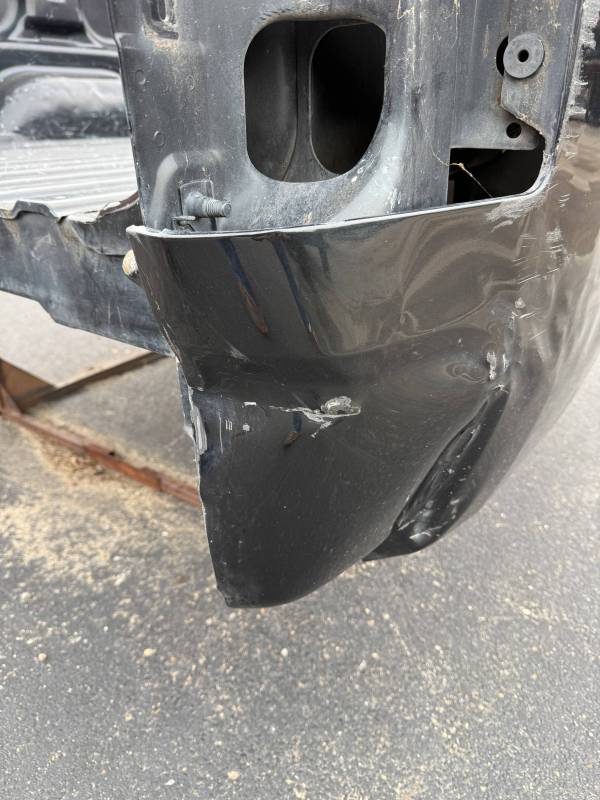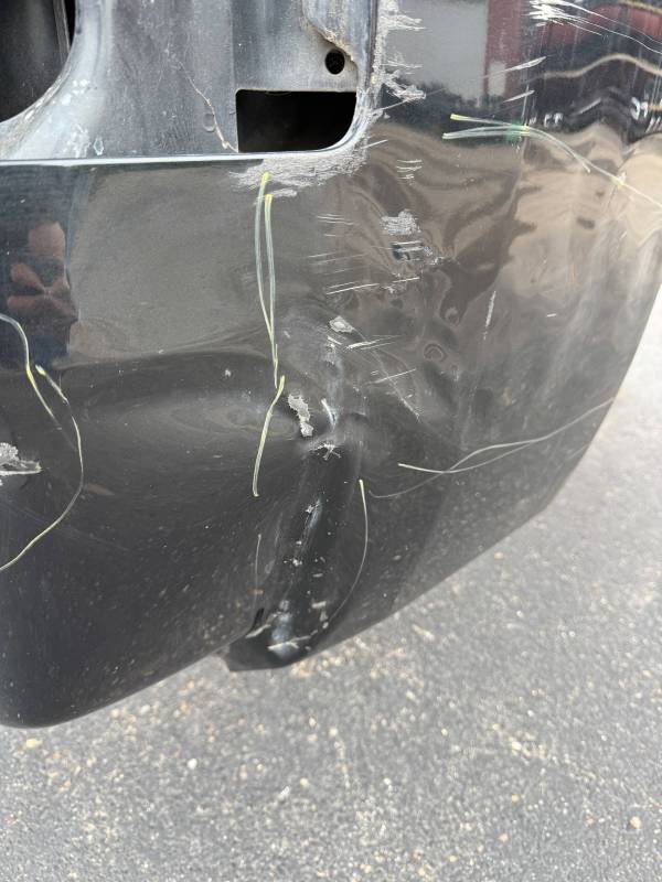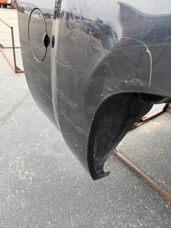 The right (passenger's) side rear lower under the taillight opening is dented and pushed in from a bumper, and the rear lower has (4) baseball sized dents and is all dented up. The right rear lower, by the taillight area, has (3) golf-ball-sized dents and is all dented up. The right rear wheel arch has (2) baseball-sized dents along with (2) softball-sized dents. The right side quarter also has a dent. The right front lower has a quarter-sized dent and (2) outty dents.