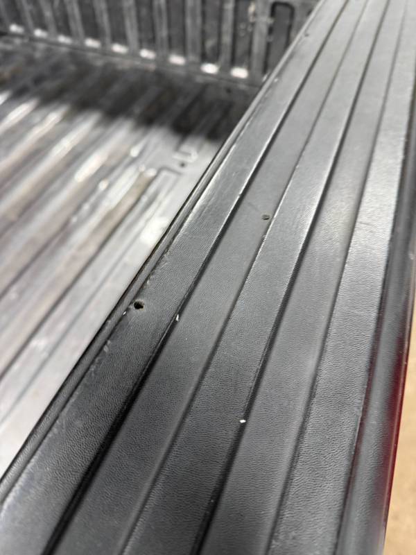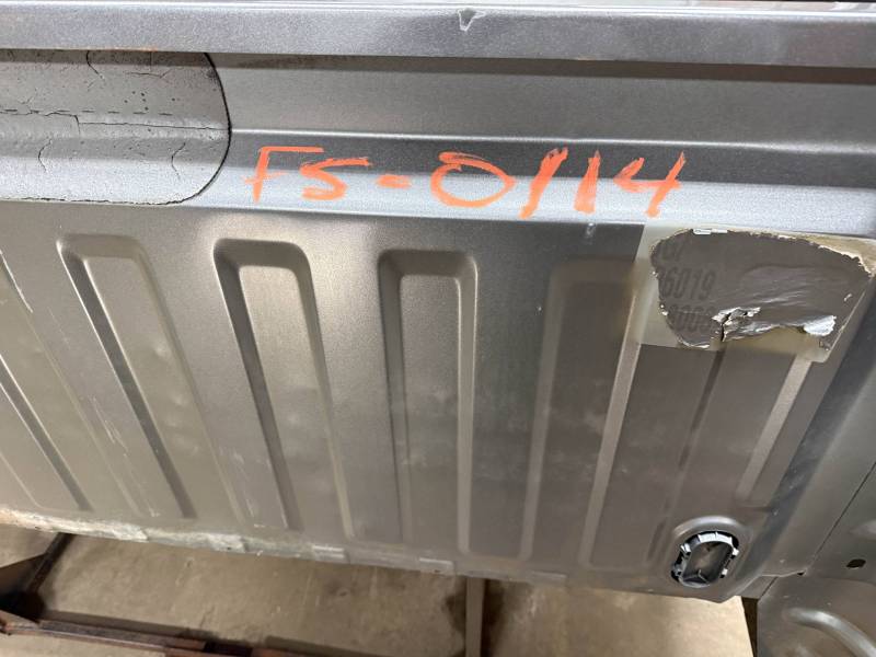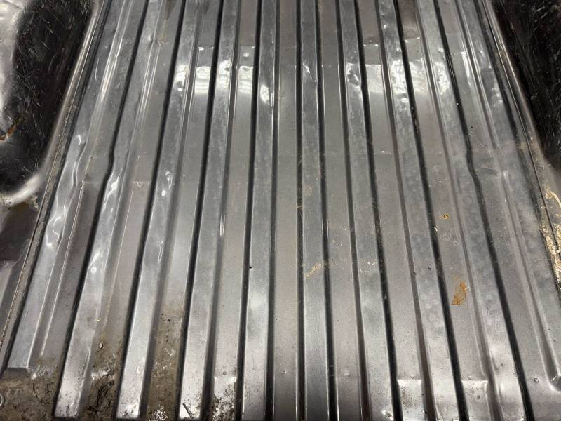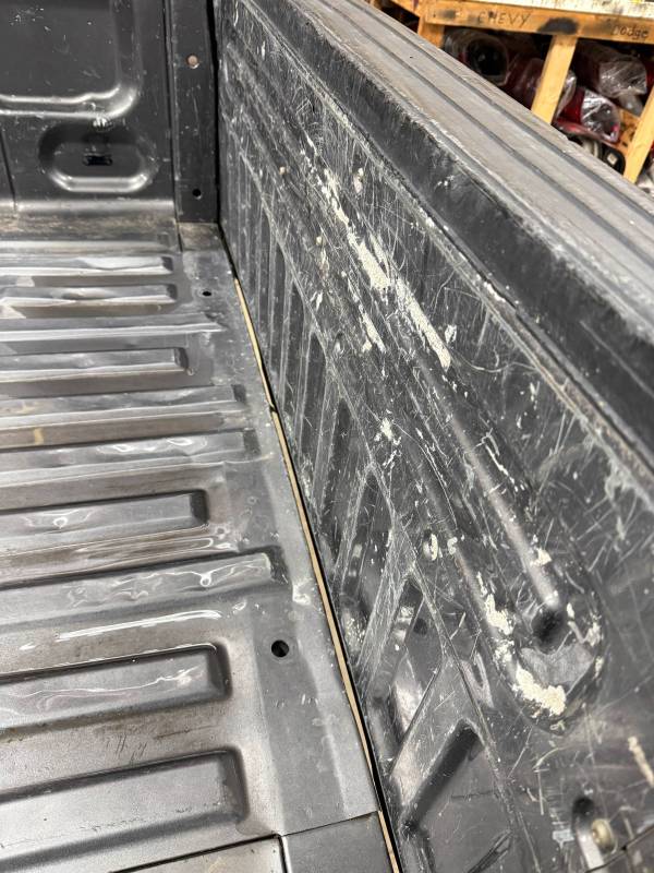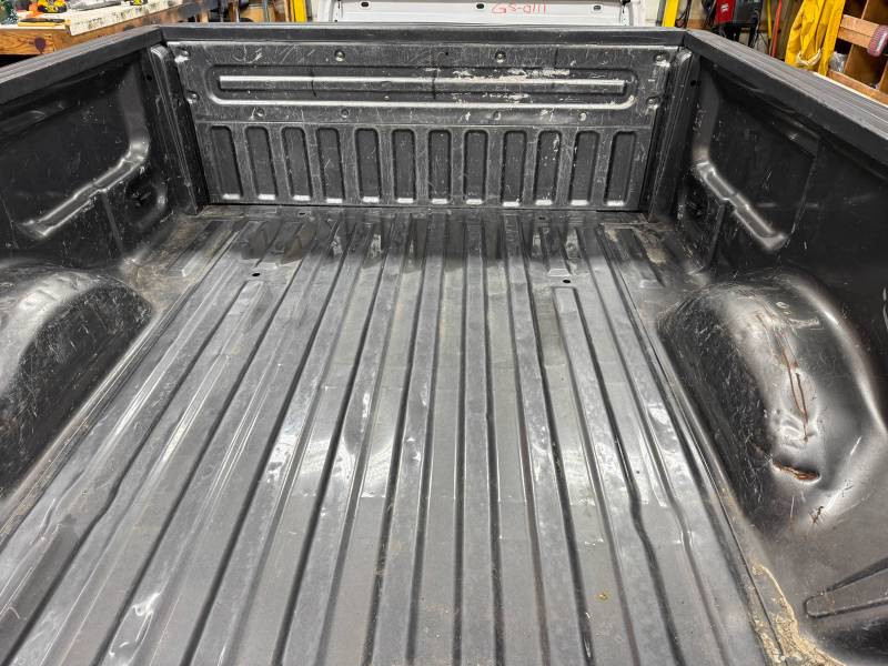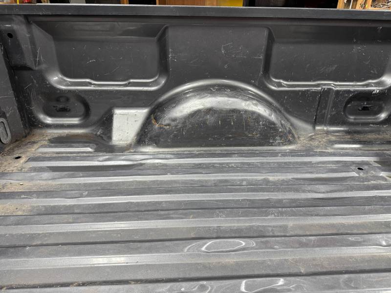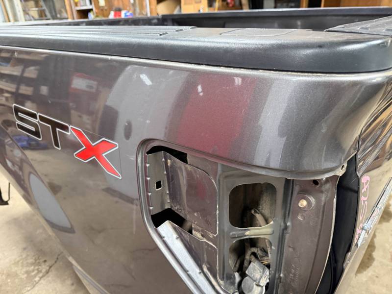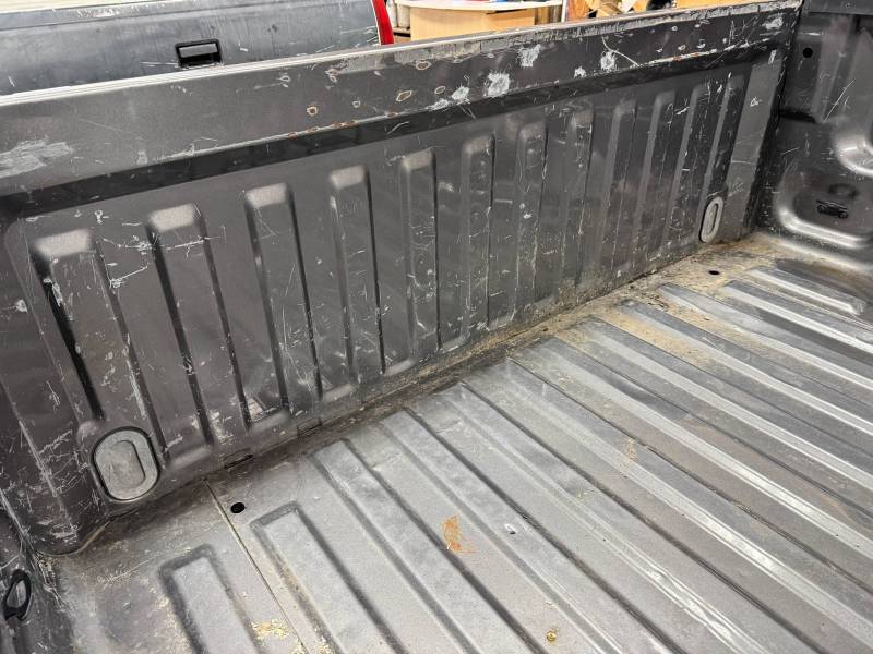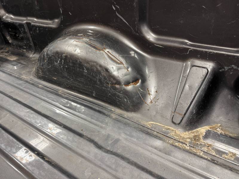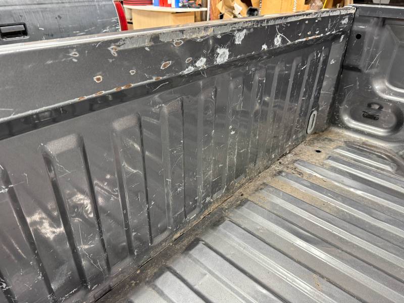 This bed comes without taillights but with a tailgate. The tailgate has a slight bow, along with (3) dime-sized dings and a quarter-sized dent. There are also (4) dents on the header panel, along with dents and dings on the floor. There are (14) 1/8" holes drilled in each top rail.