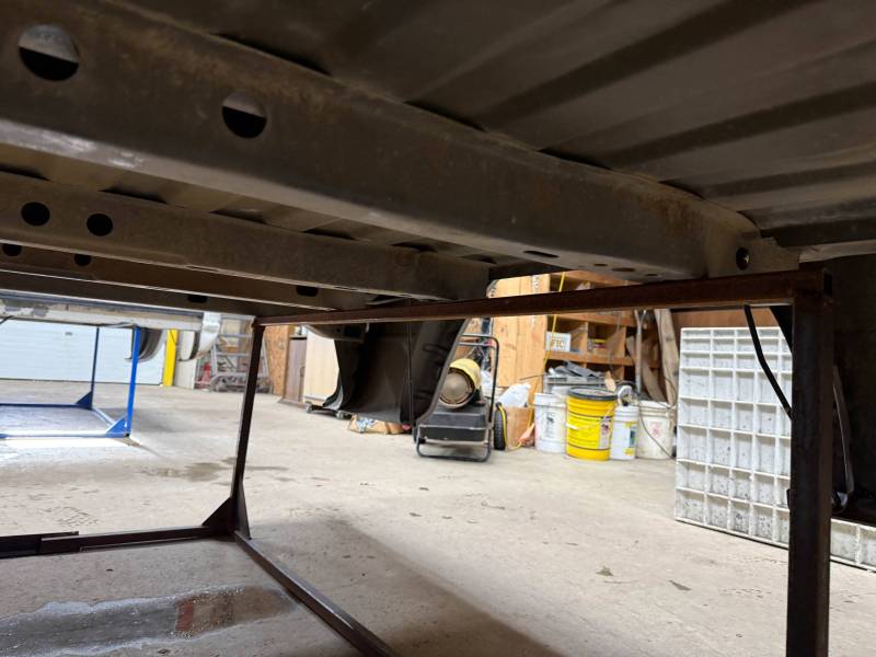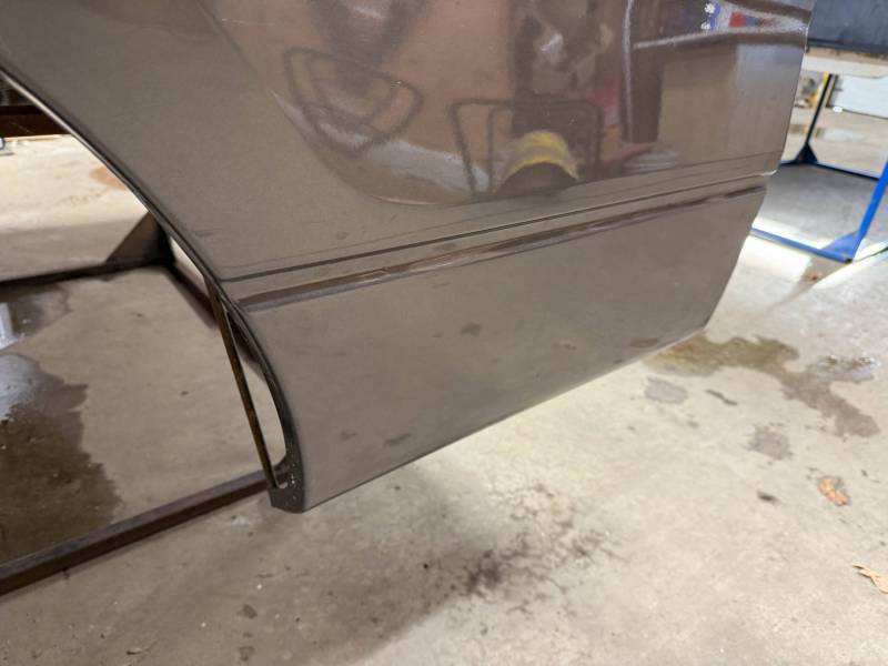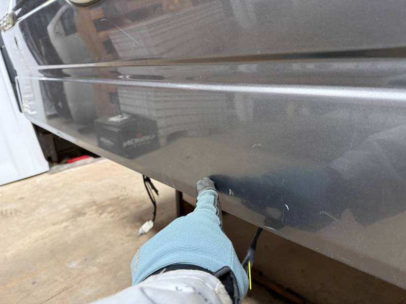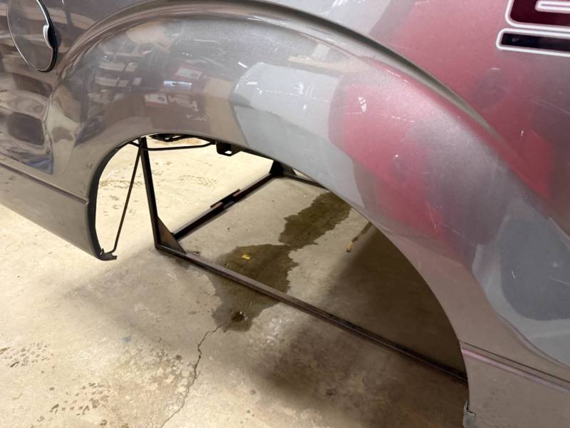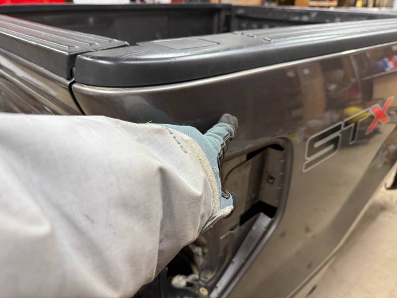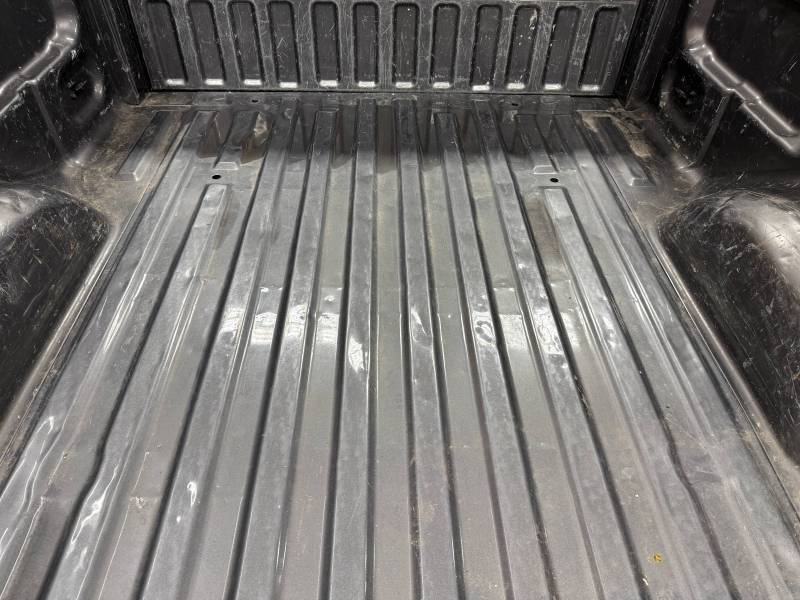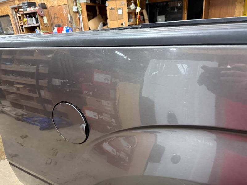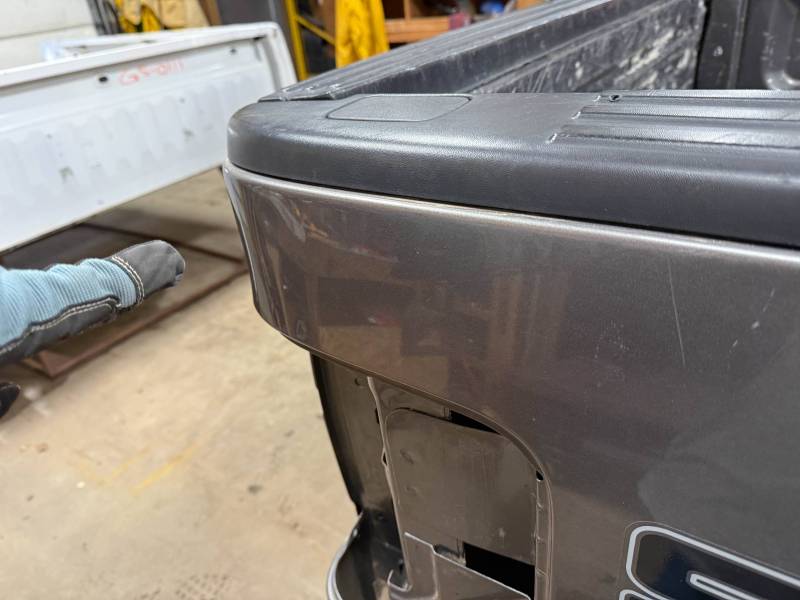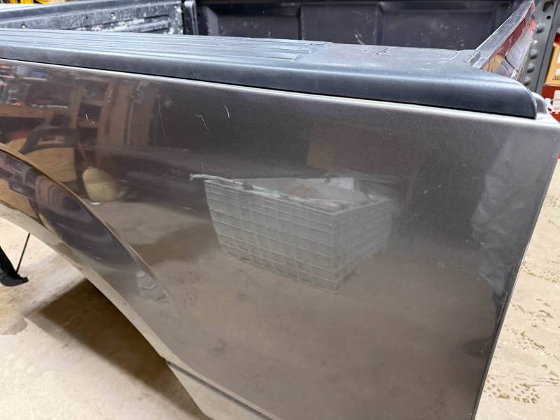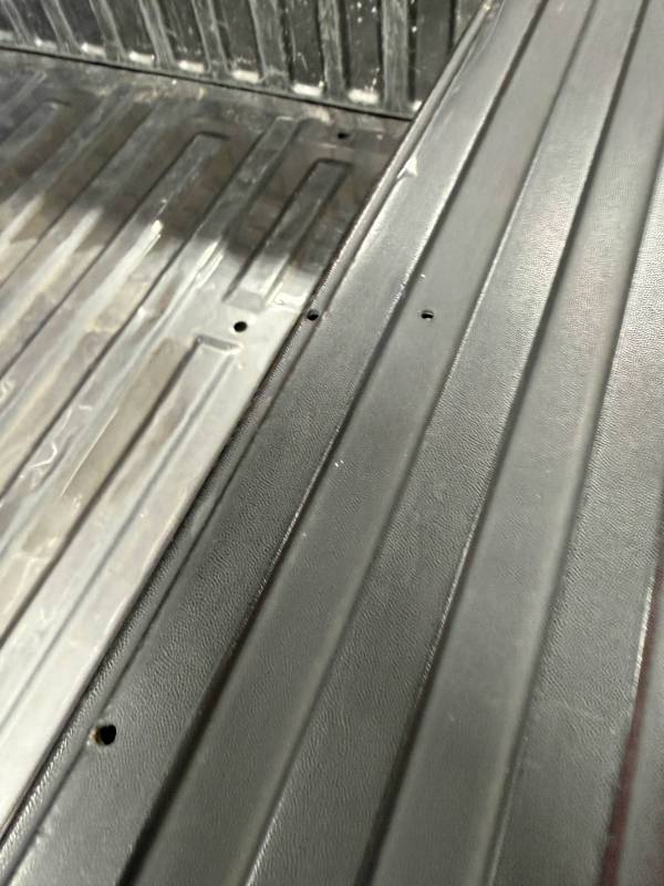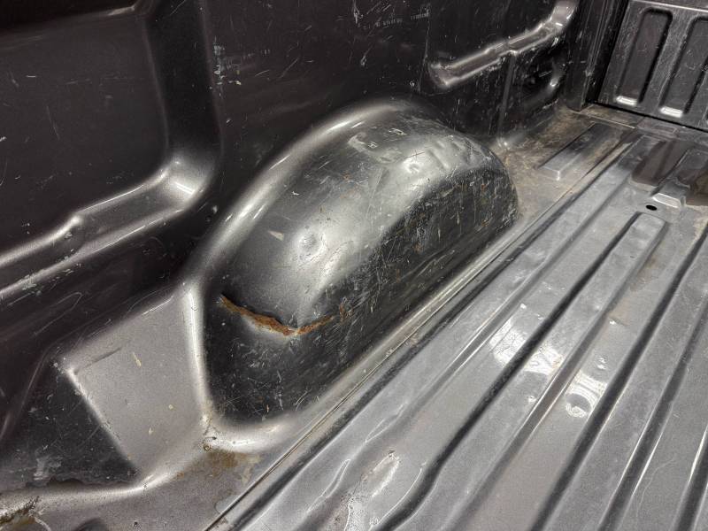 This bed comes without taillights but with a tailgate. The tailgate has a slight bow, along with (3) dime-sized dings and a quarter-sized dent. There are also (4) dents on the header panel, along with dents and dings on the floor. There are (14) 1/8" holes drilled in each top rail.