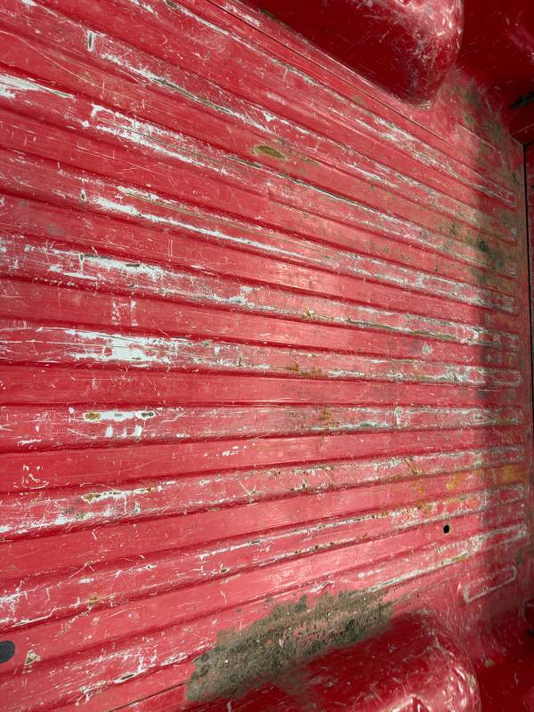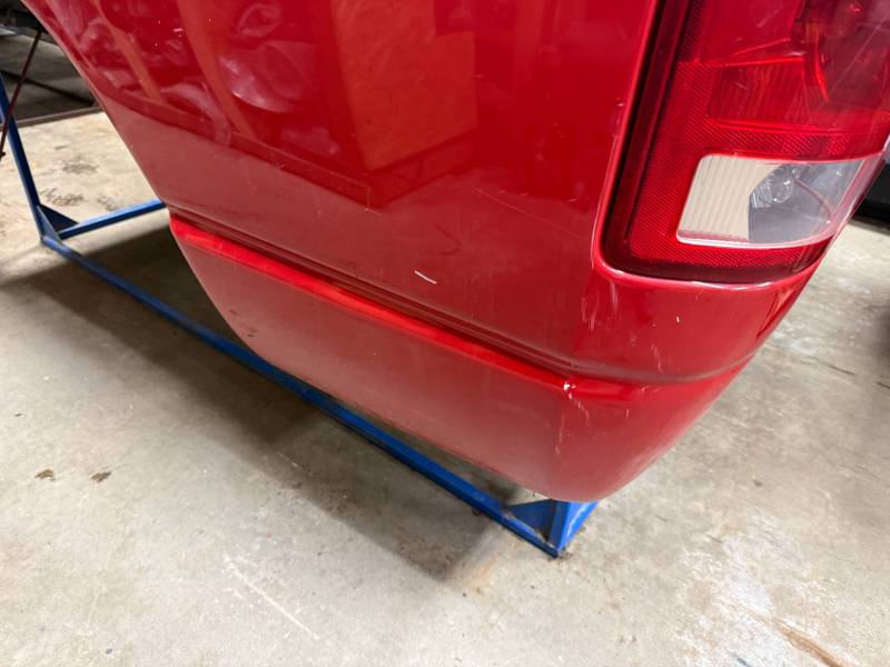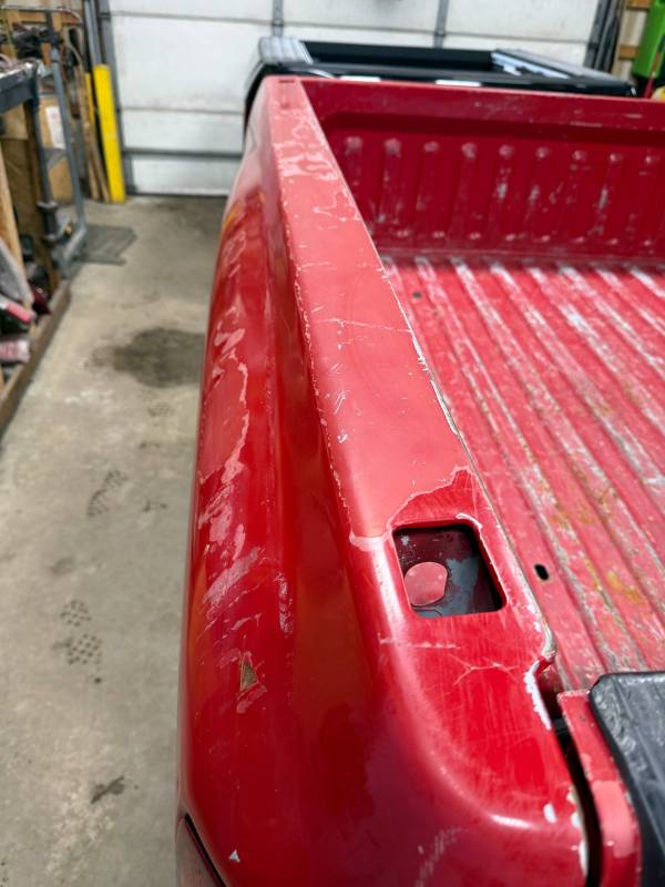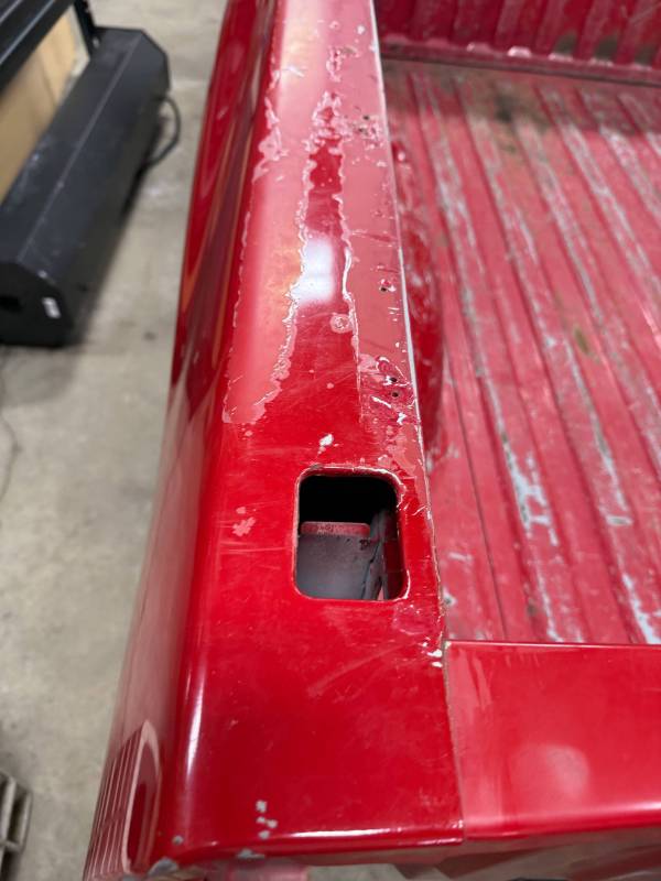 - Tailgate Damage: The upper left section has two dents (one quarter-sized, one golf-ball-sized), and there is rust along the bottom edge.