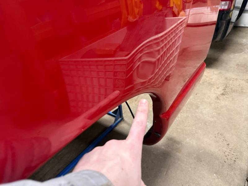 - Right Side (RH): Contains five dime-sized dings. The wheel arch has a baseball-sized dent and a rust bubble. Beneath the taillight, there is a baseball-sized dent and a small hole.