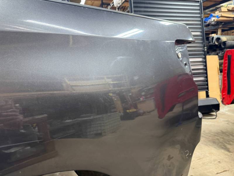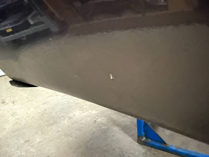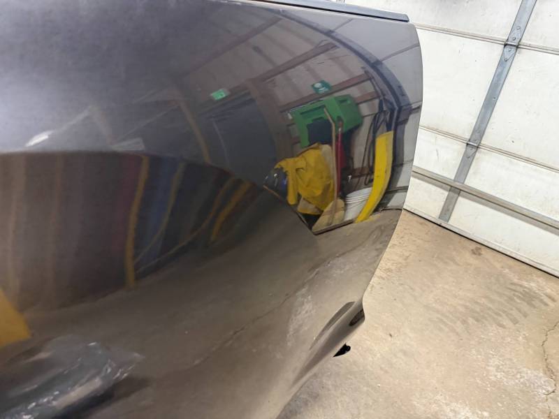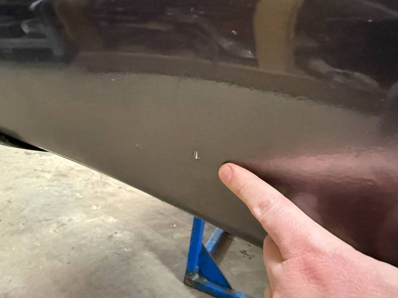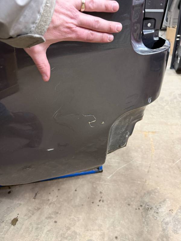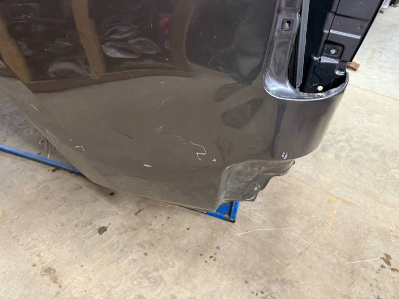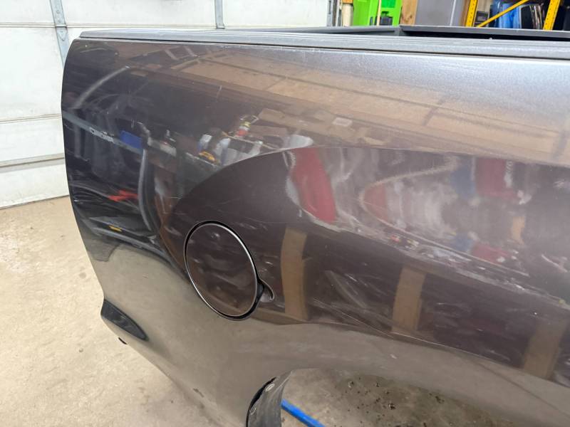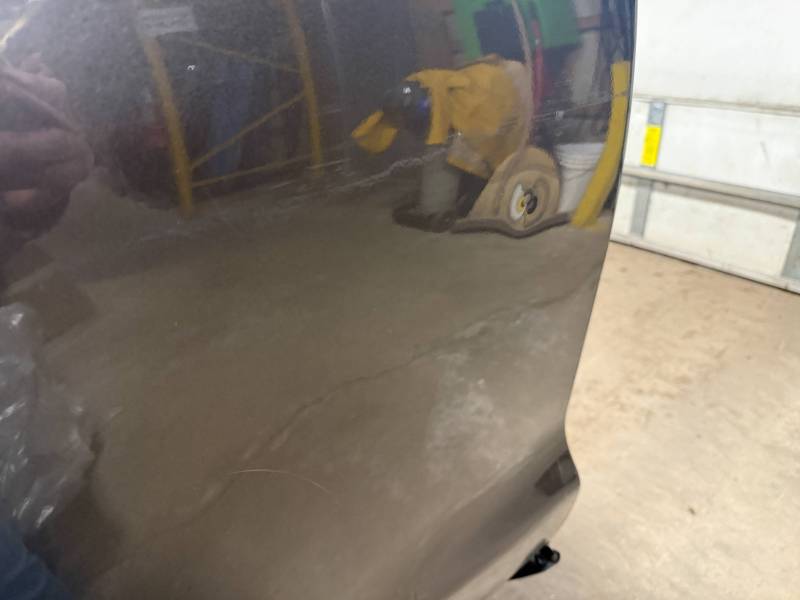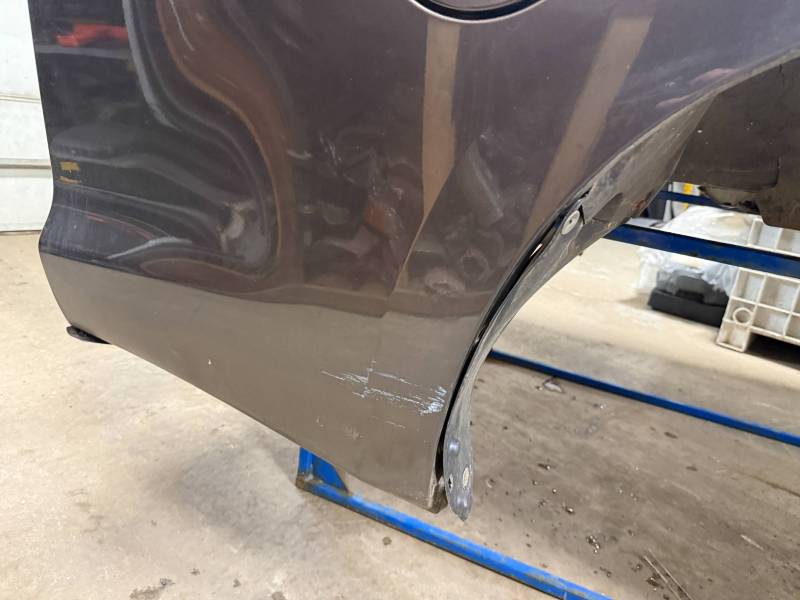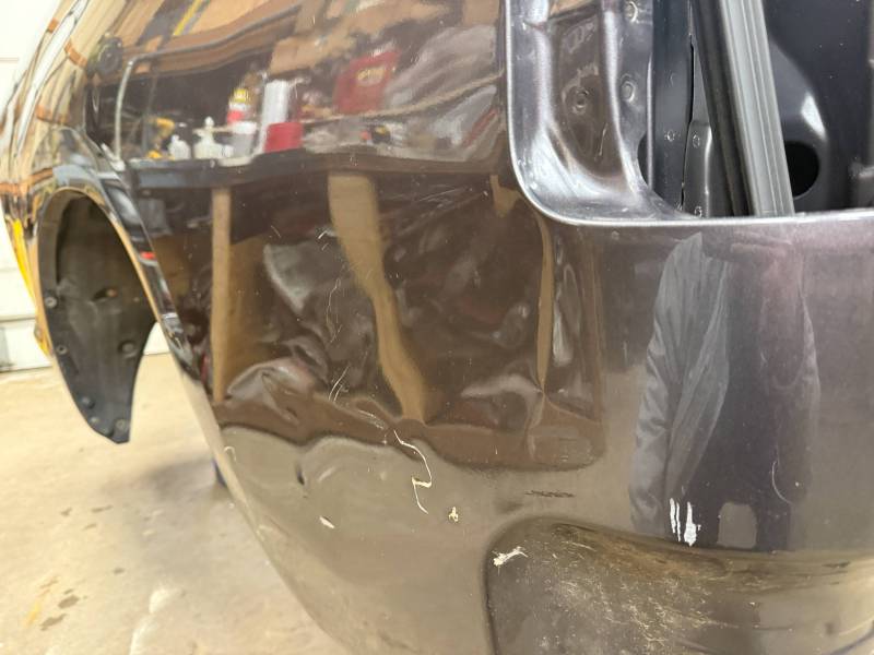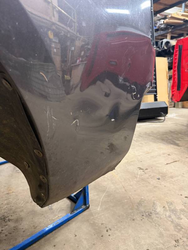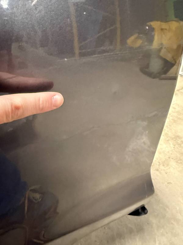 - Left Side: The lower rear section is heavily affected by two softball-sized and two quarter-sized dents. Additionally, there is a dime-sized ding below the taillight opening and another on the front, accompanied by a small "out-dent."