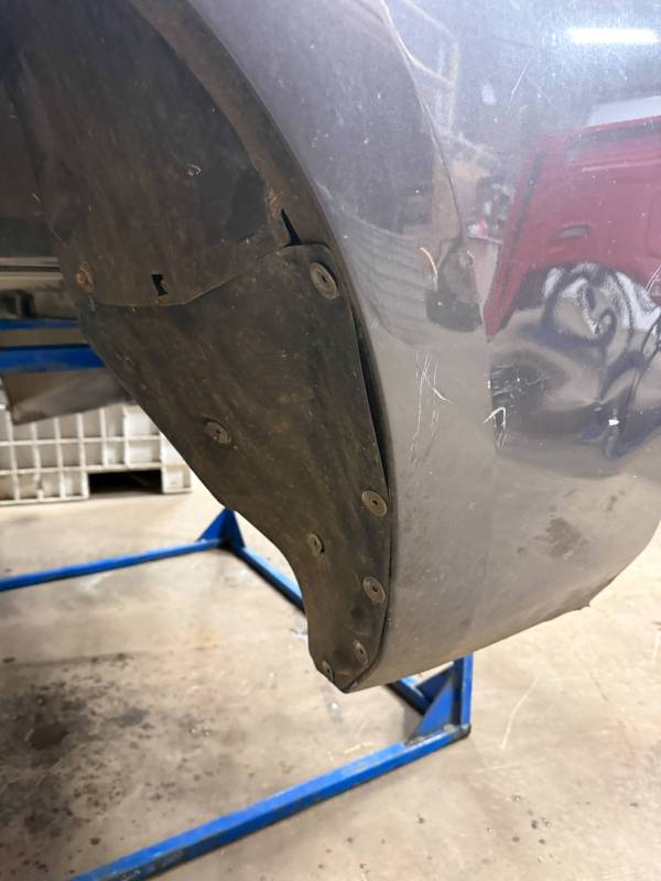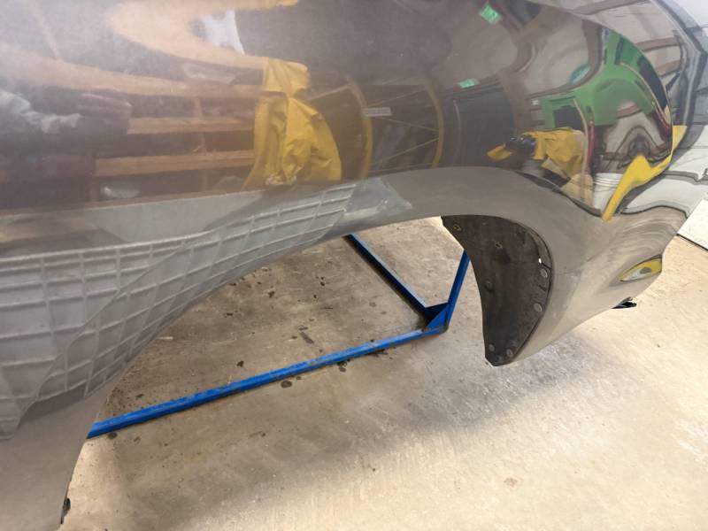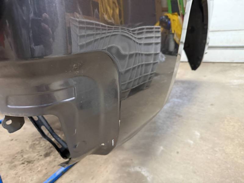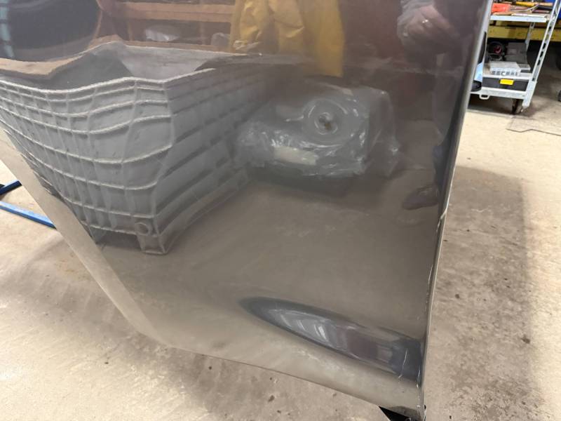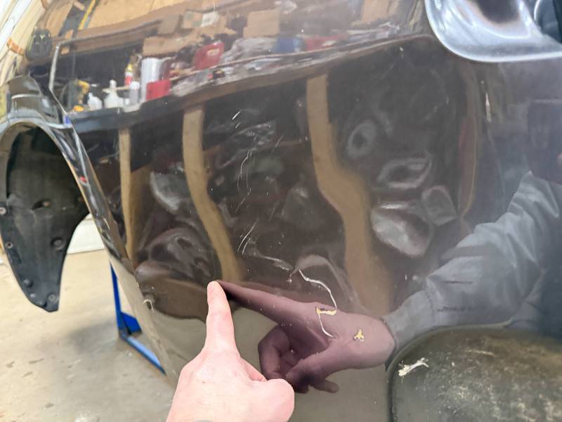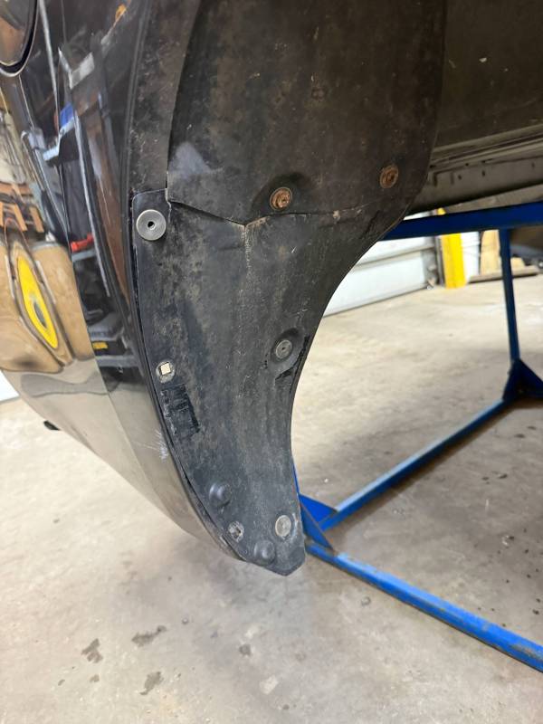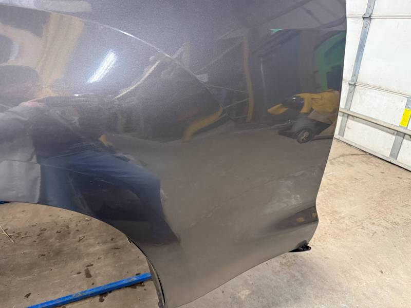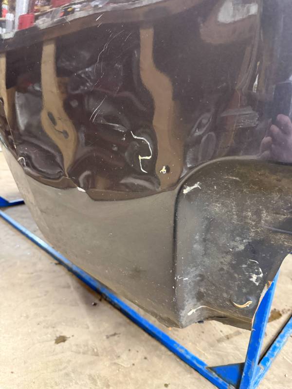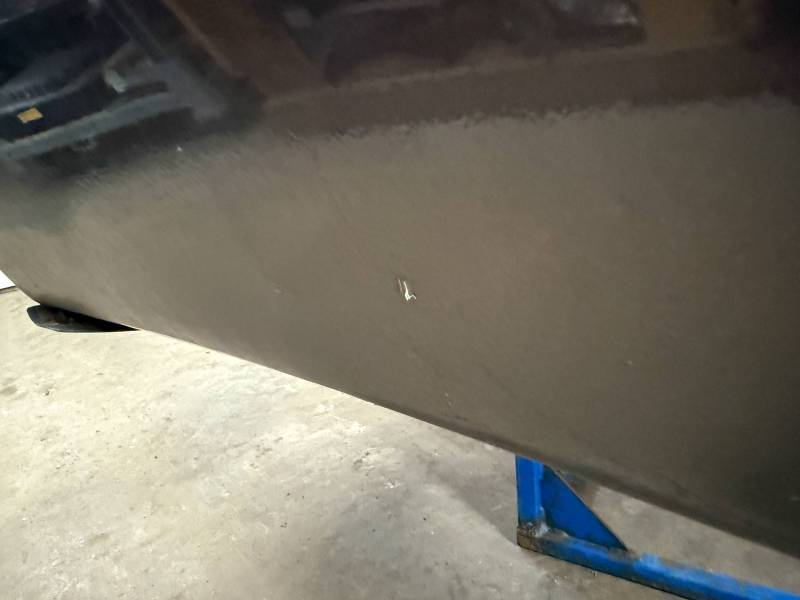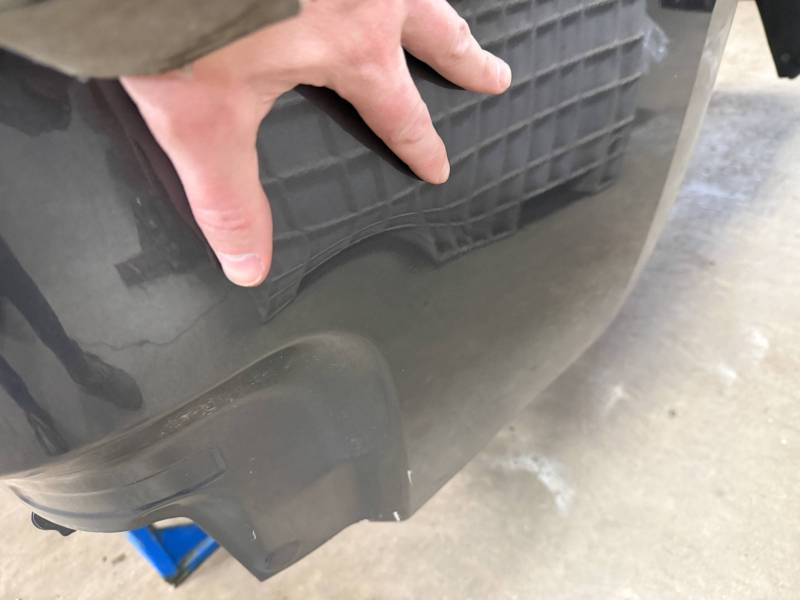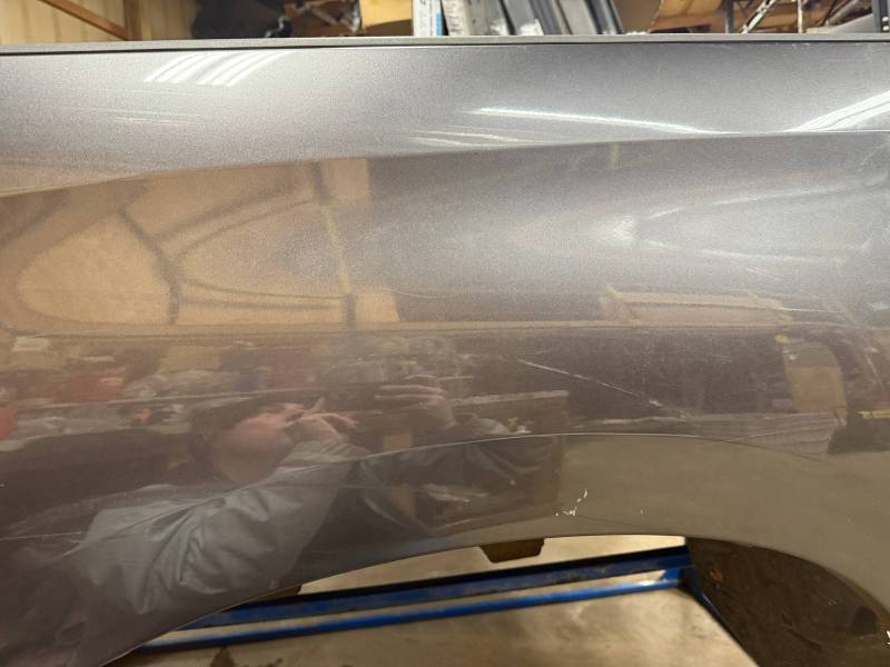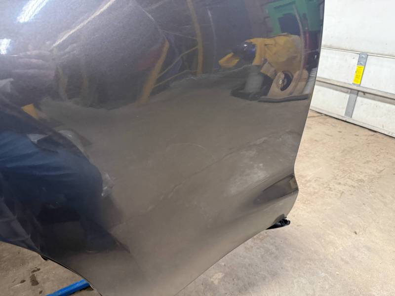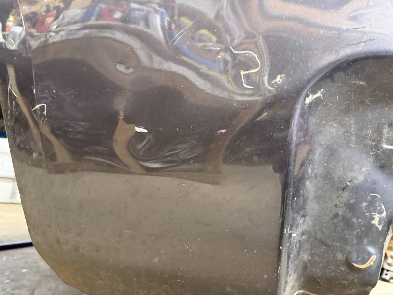 - Left Side: The lower rear section is heavily affected by two softball-sized and two quarter-sized dents. Additionally, there is a dime-sized ding below the taillight opening and another on the front, accompanied by a small "out-dent."