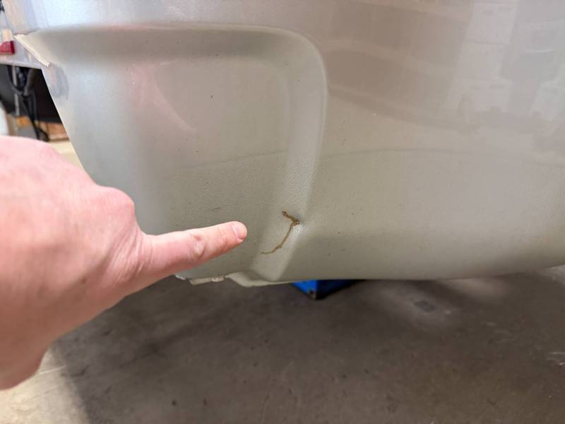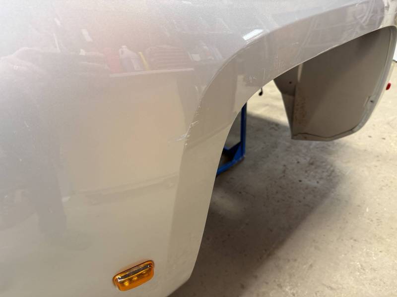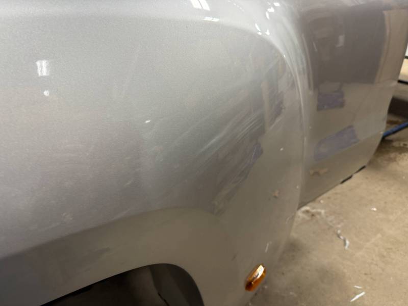 - Left Side (LH): One golf-ball-sized dent on the dually fender, two quarter-sized dents near the top rail, and a 4-inch crease at the lower rear.
