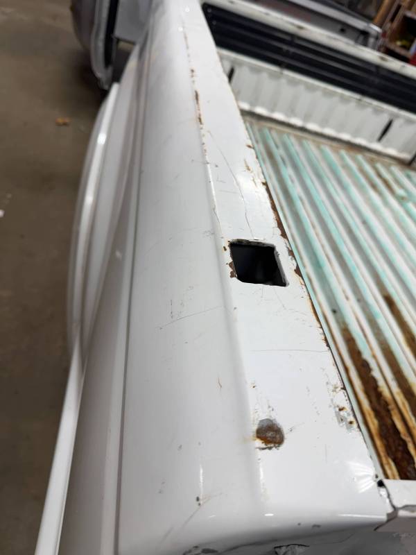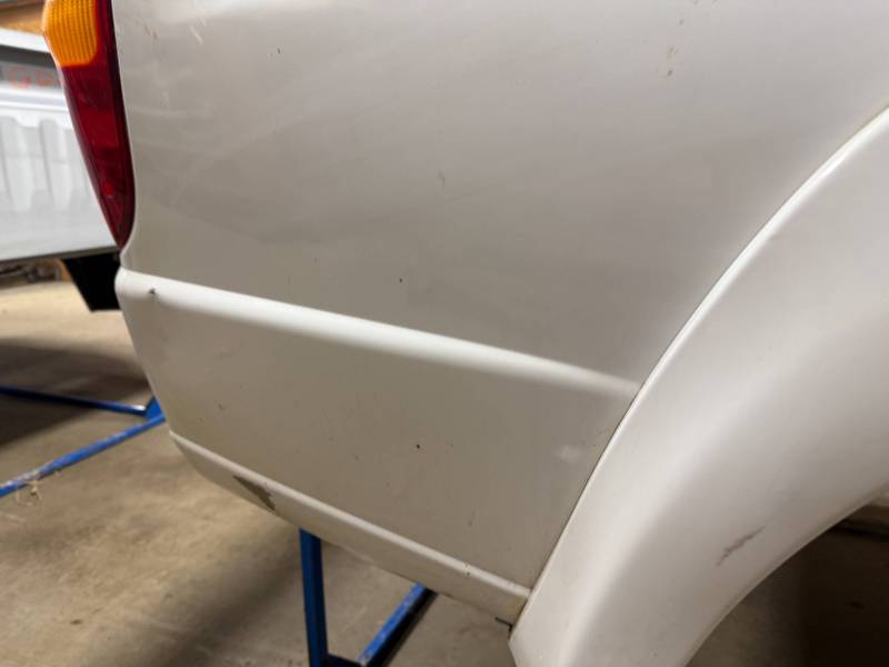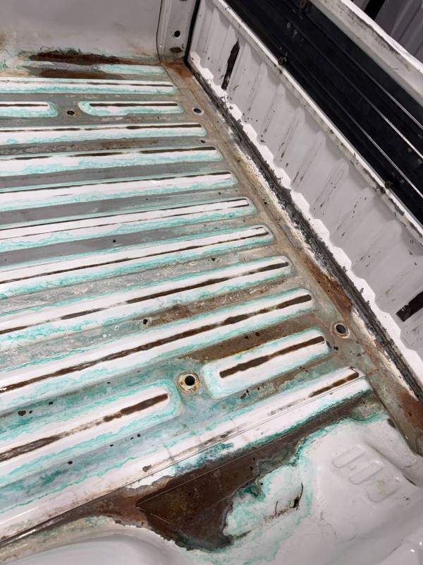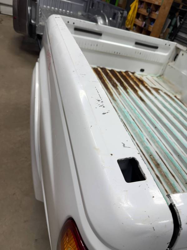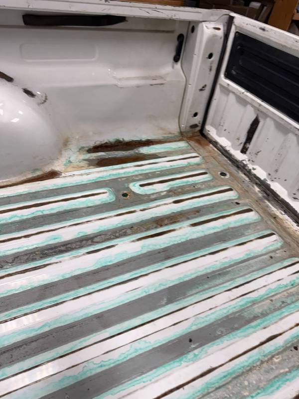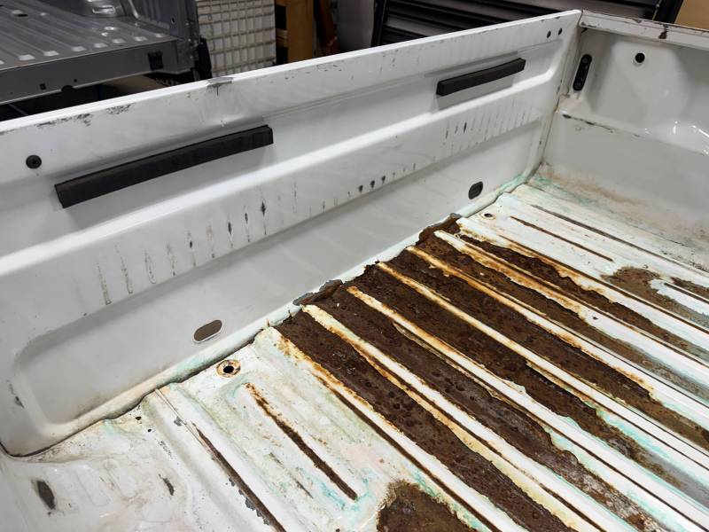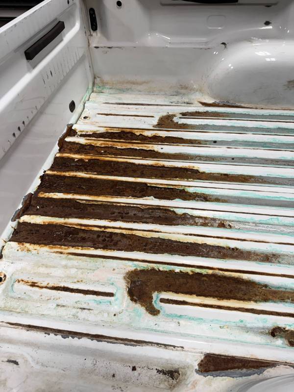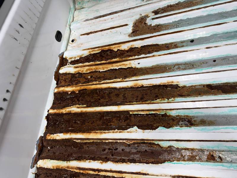 - Bed Interior: A golf-ball-sized dent is present on the header panel. The front floor section shows surface corrosion resulting from pool chemical exposure.