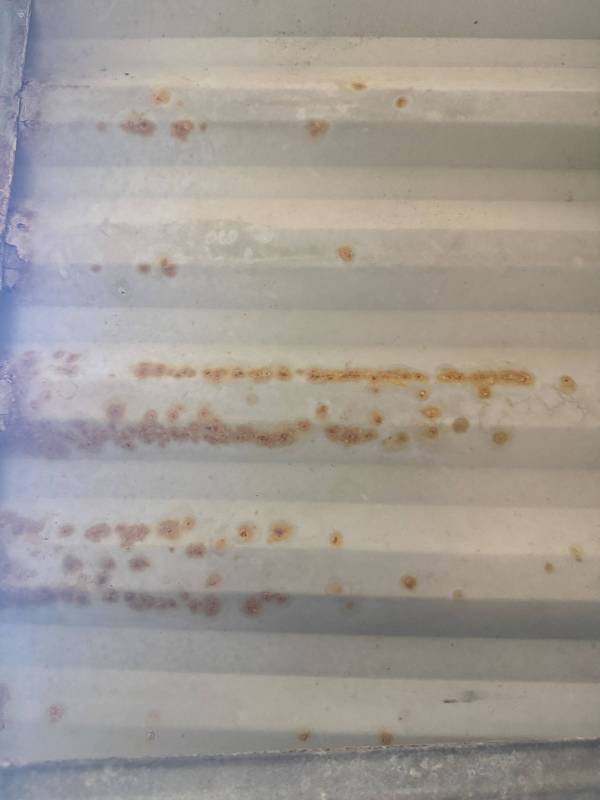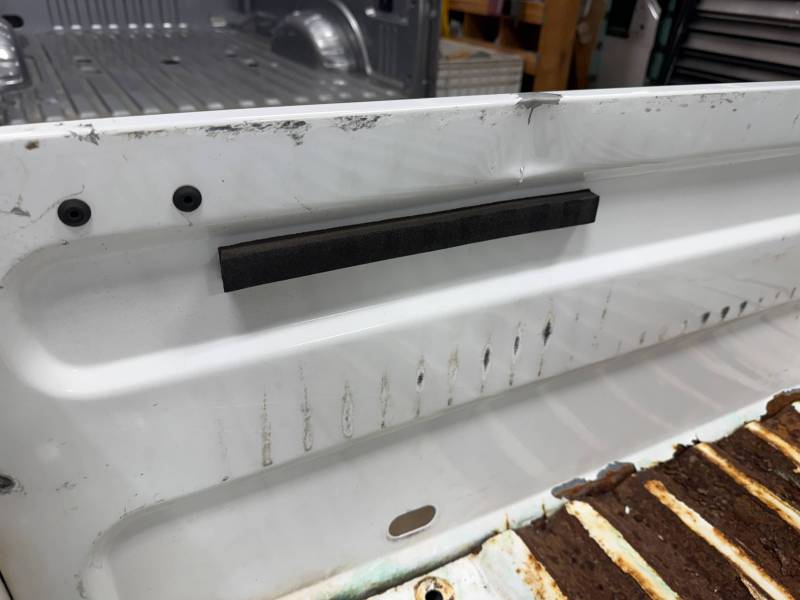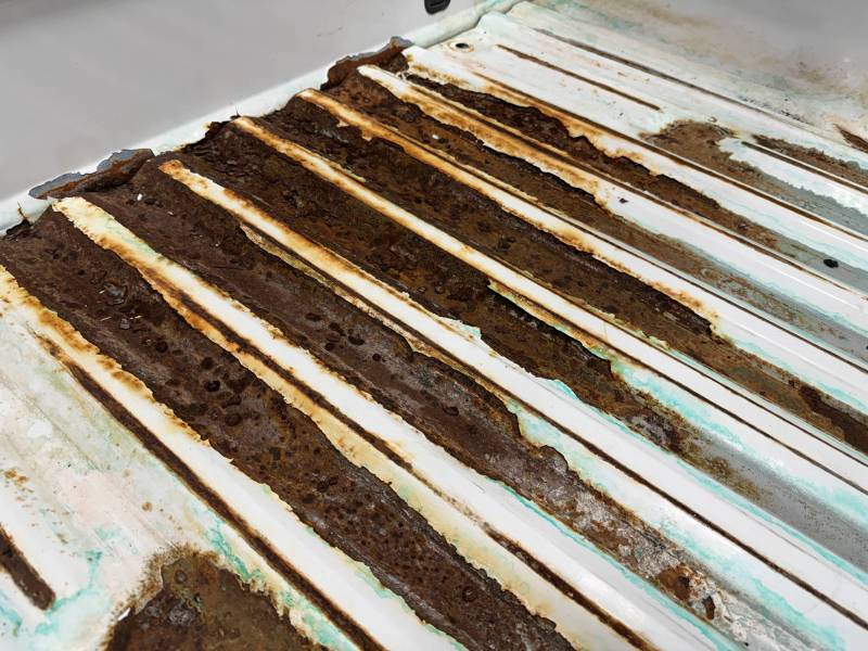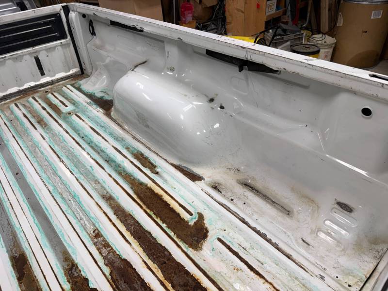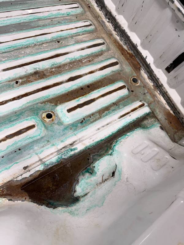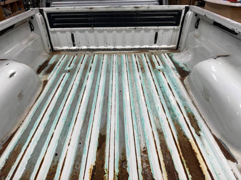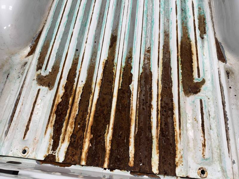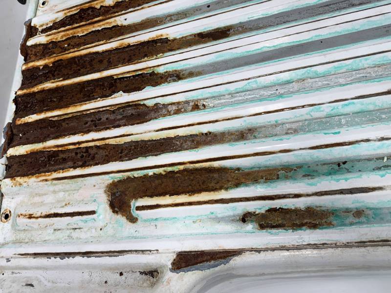 - Bed Interior: A golf-ball-sized dent is present on the header panel. The front floor section shows surface corrosion resulting from pool chemical exposure.