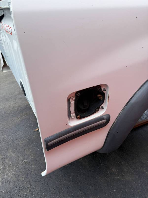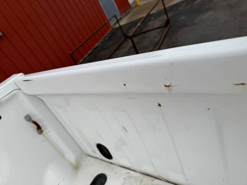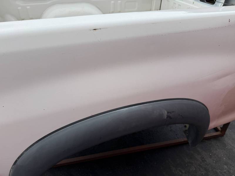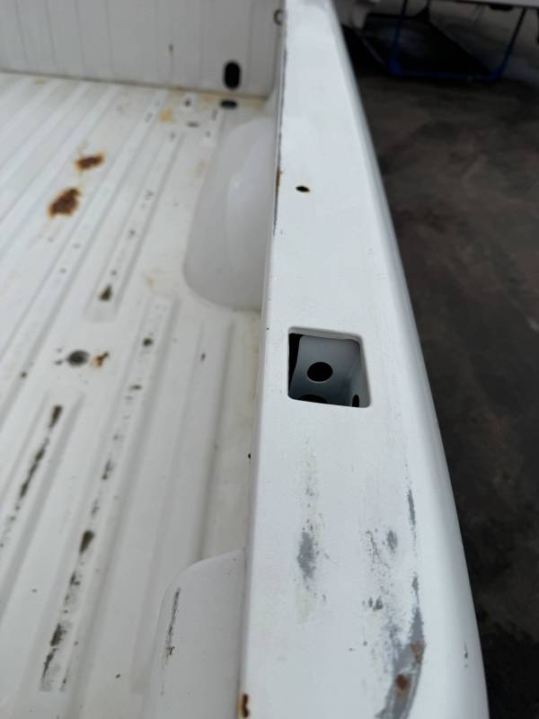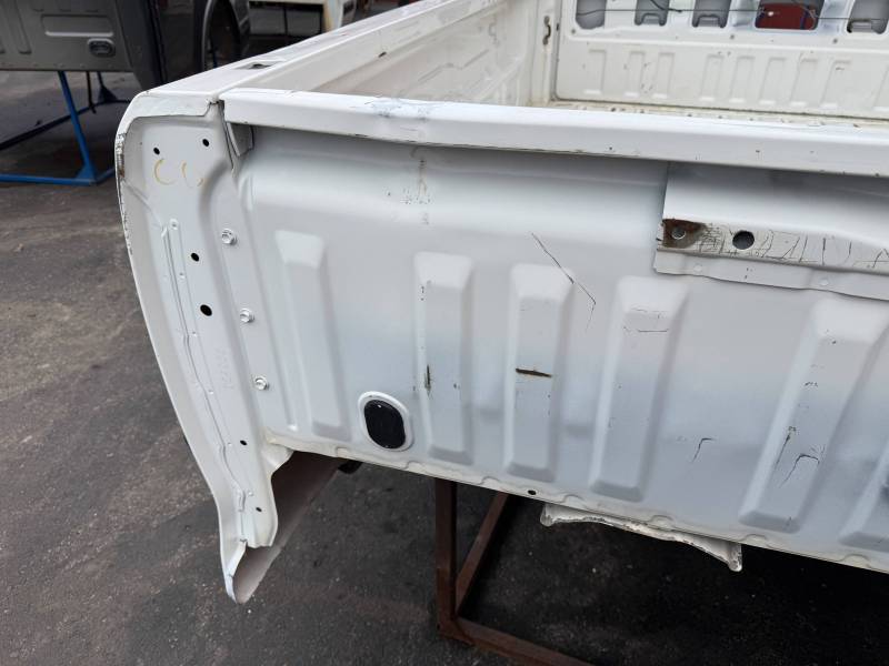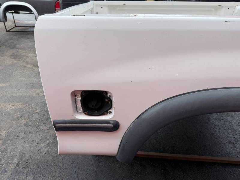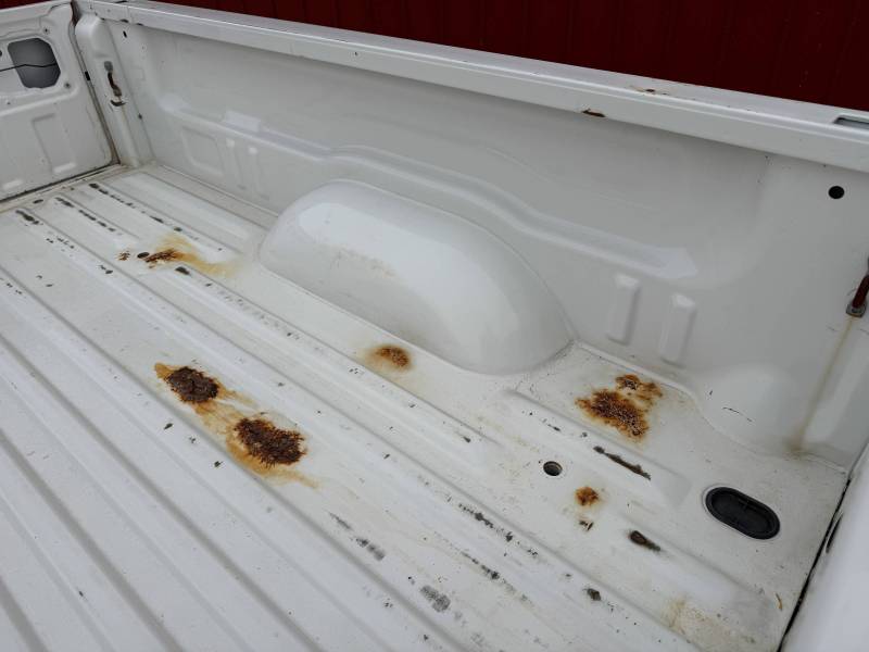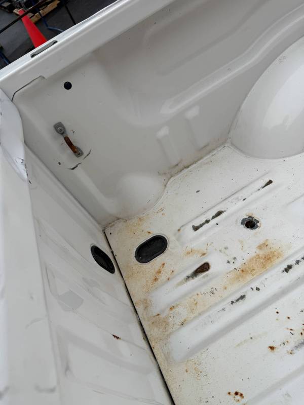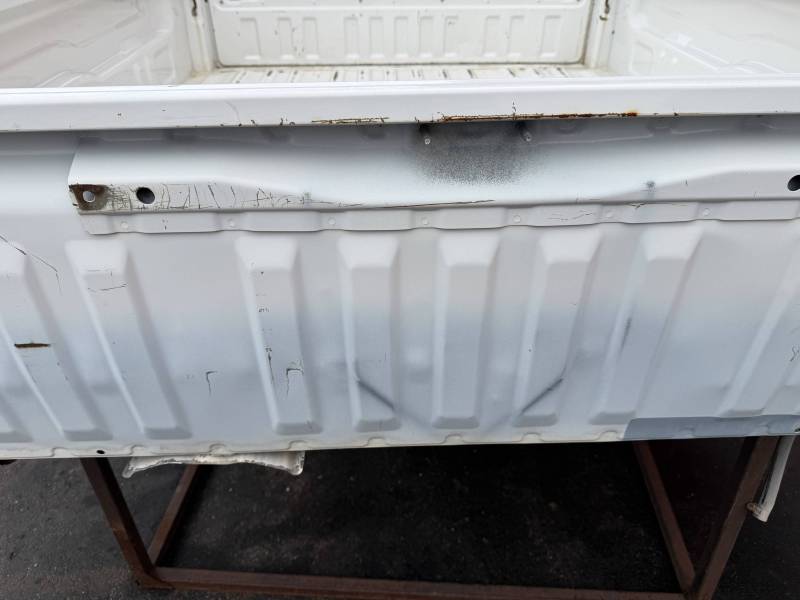This Arizona-sourced truck bed is structurally sound but has several cosmetic flaws. The floor shows surface rust, though the crossmembers remain solid with only minor scaling. While the bed features factory fender flares with no underlying rust, it is missing the fuel door, tailgate handle, and the tailgate's interior panel.
