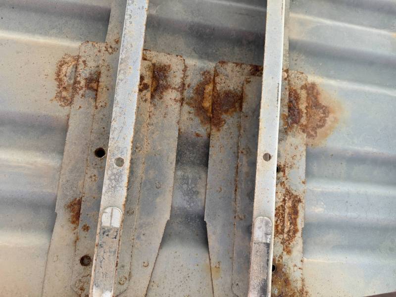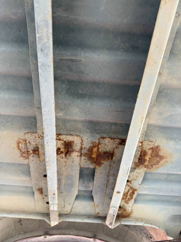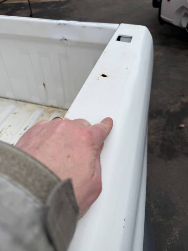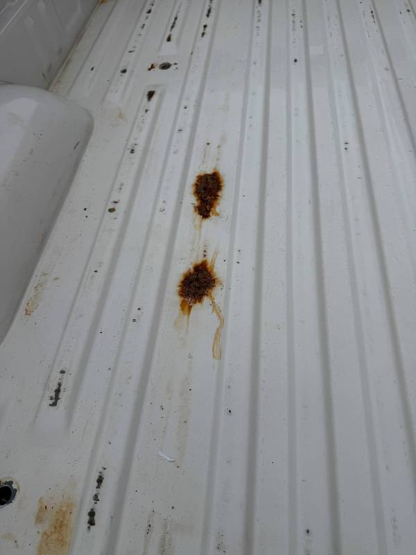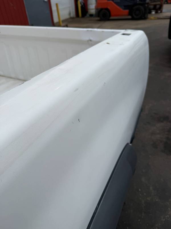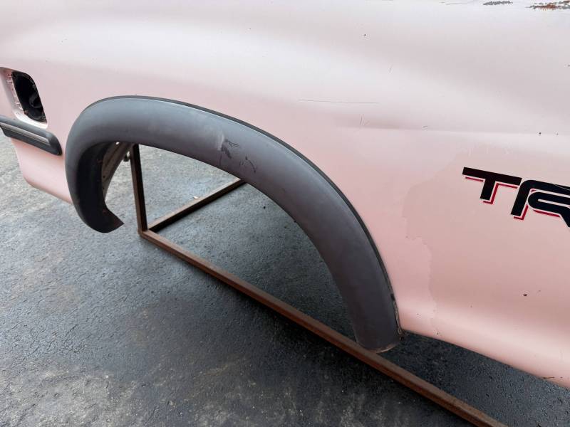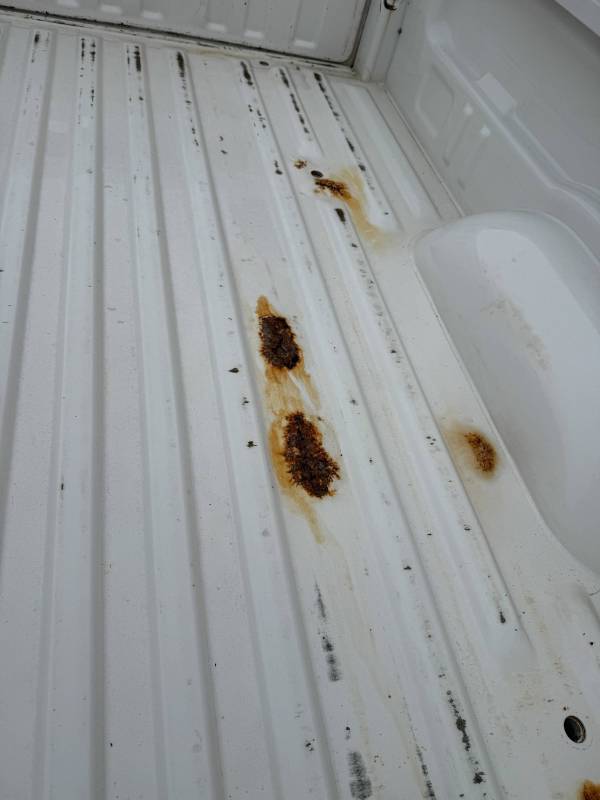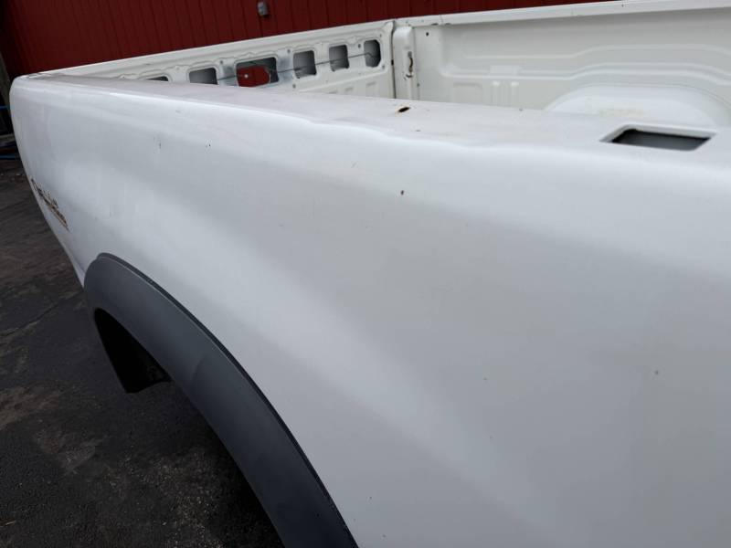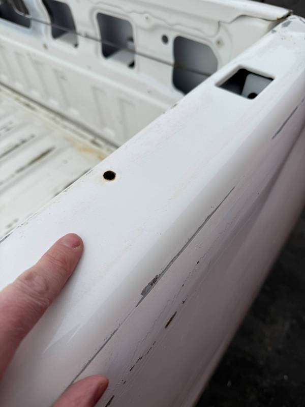 This Arizona-sourced truck bed is structurally sound but has several cosmetic flaws. The floor shows surface rust, though the crossmembers remain solid with only minor scaling. While the bed features factory fender flares with no underlying rust, it is missing the fuel door, tailgate handle, and the tailgate's interior panel.