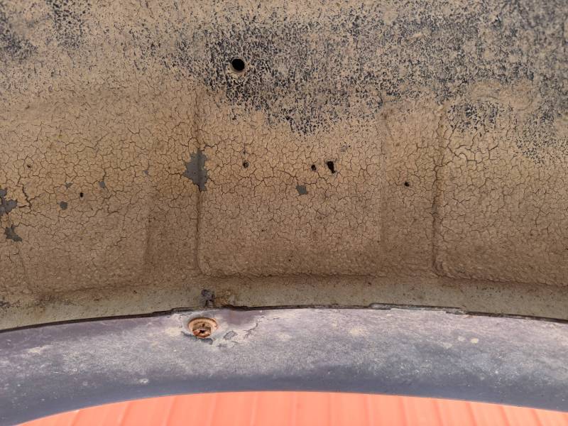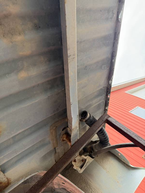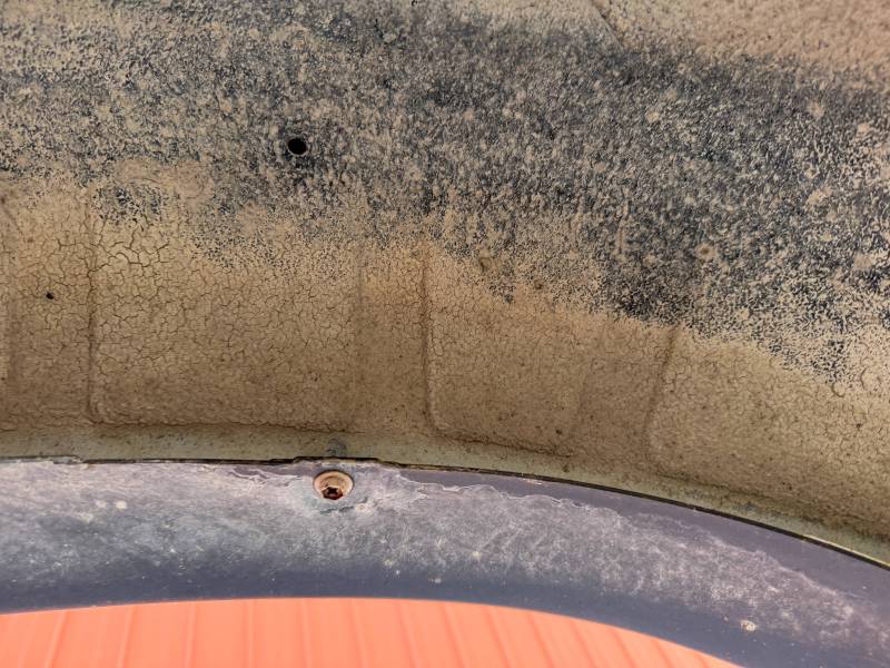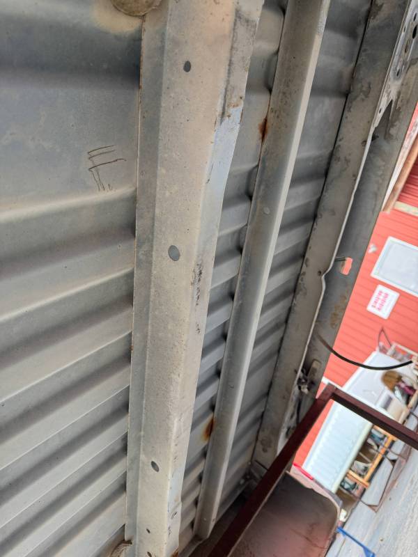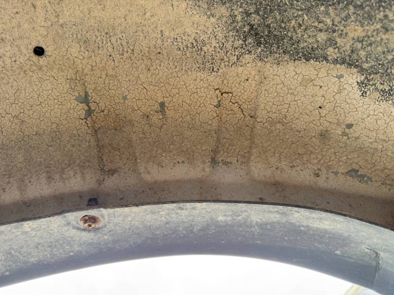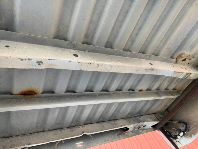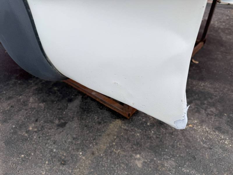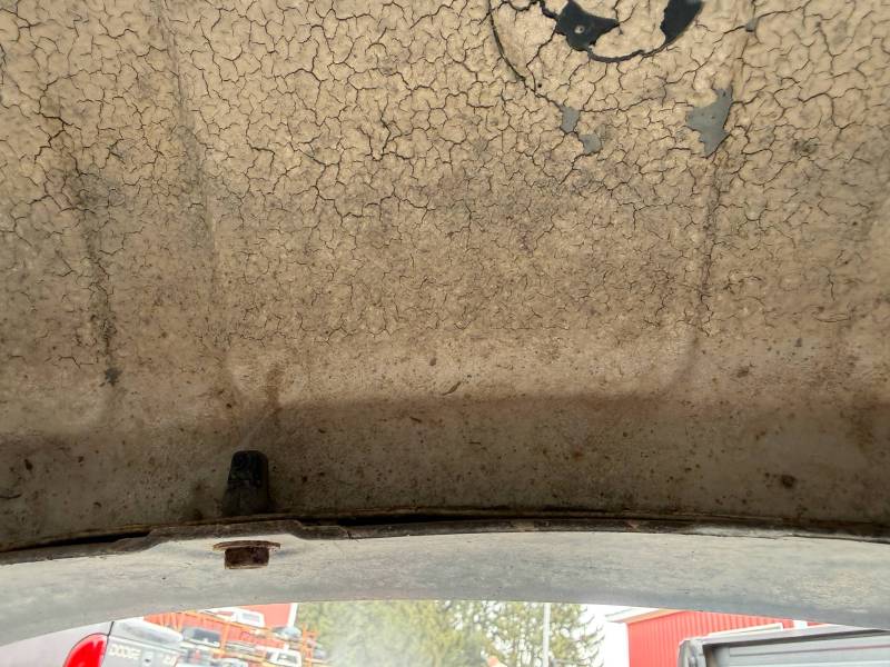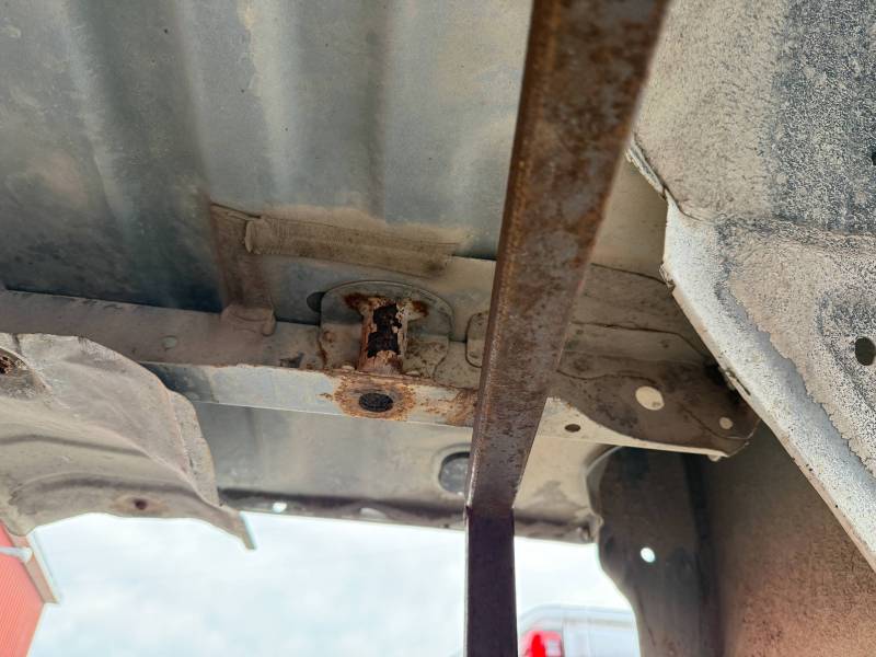 This Arizona-sourced truck bed is structurally sound but has several cosmetic flaws. The floor shows surface rust, though the crossmembers remain solid with only minor scaling. While the bed features factory fender flares with no underlying rust, it is missing the fuel door, tailgate handle, and the tailgate's interior panel.