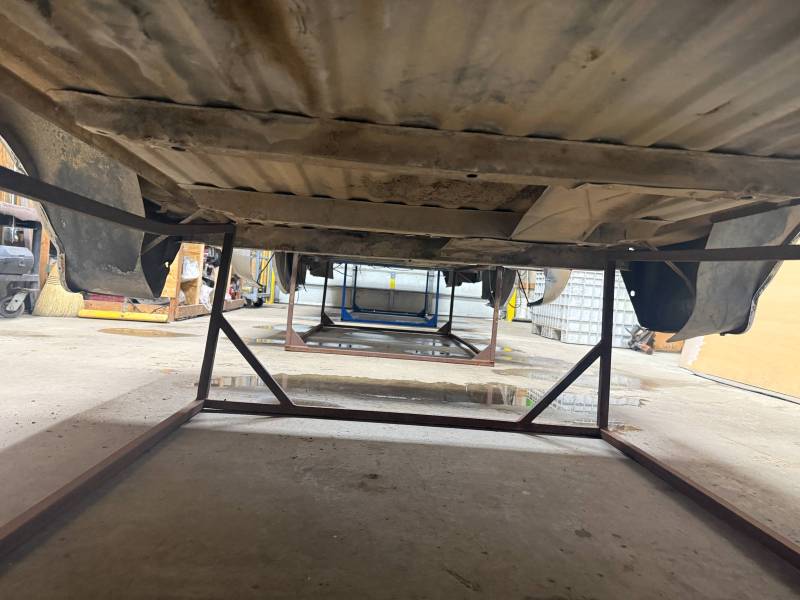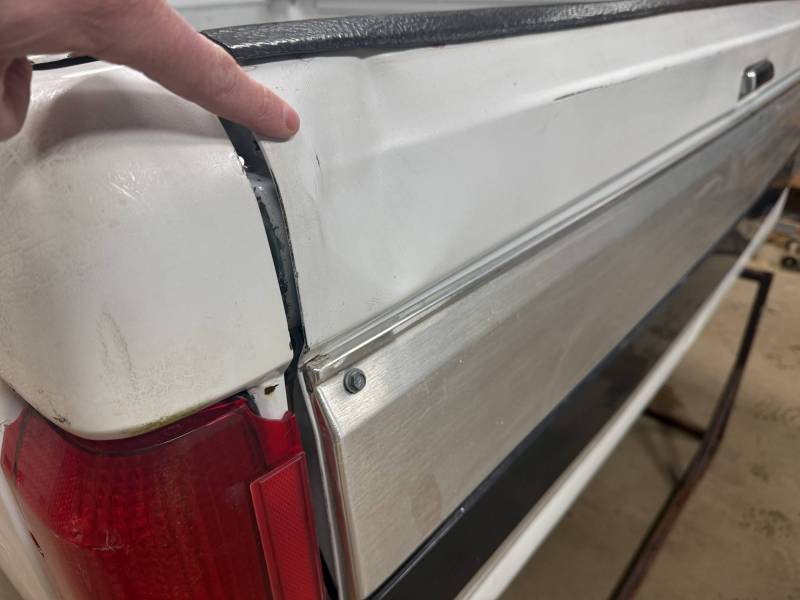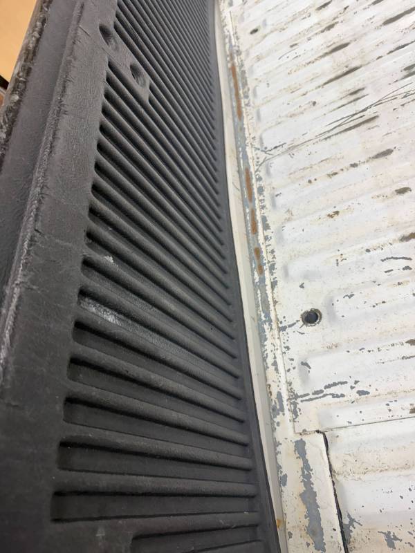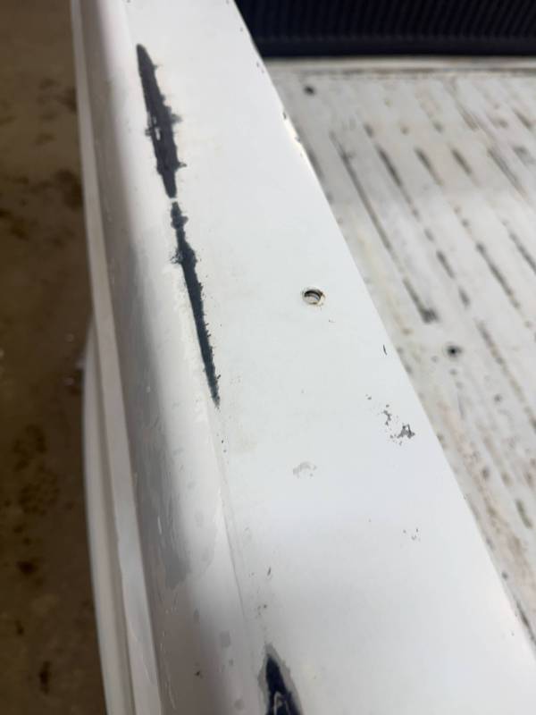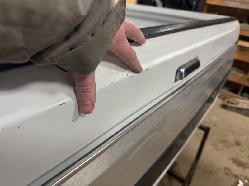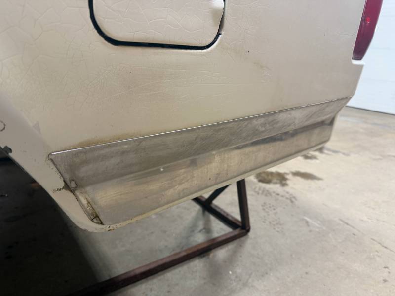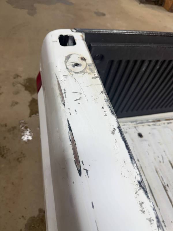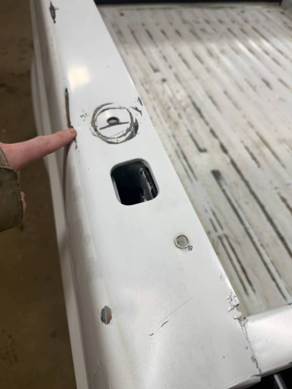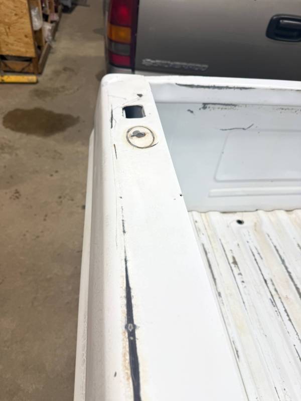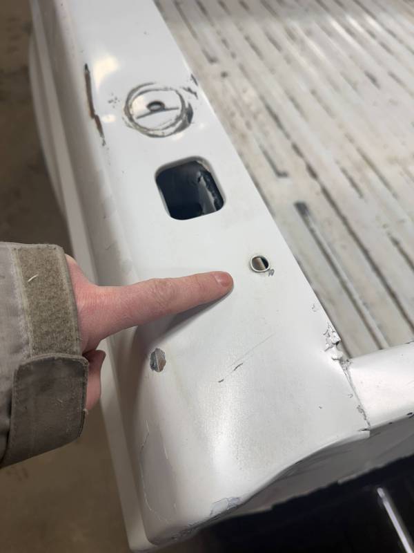 This unit includes both the taillights and a tailgate. The tailgate features an aluminium trim panel that has been bolted and screwed on; while the inner panel is bowed and the exterior has several dents, it remains fully functional. The header panel has two dents, and each top rail has five drill holes along with various dings. All four lower corners are fitted with stainless steel rocker trim.
