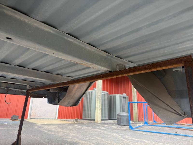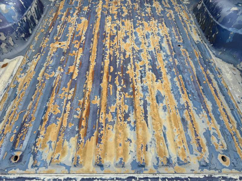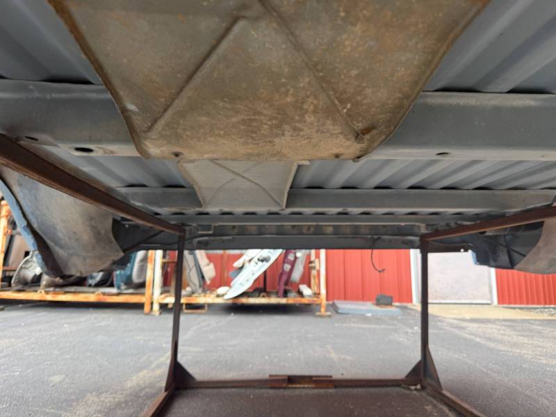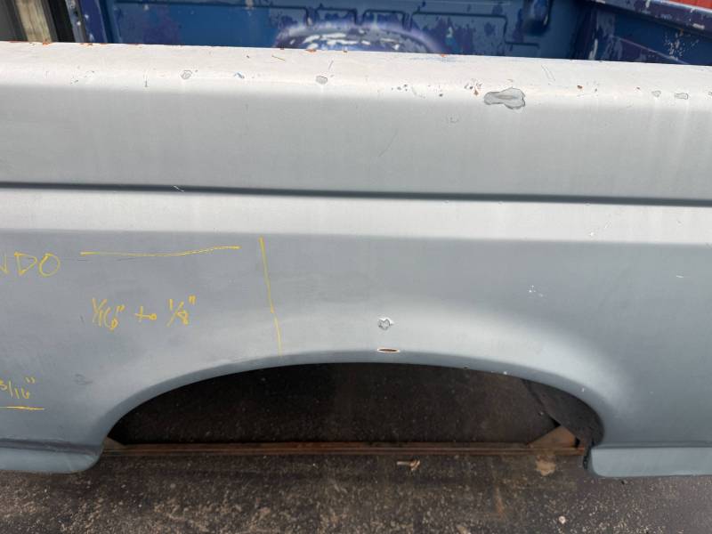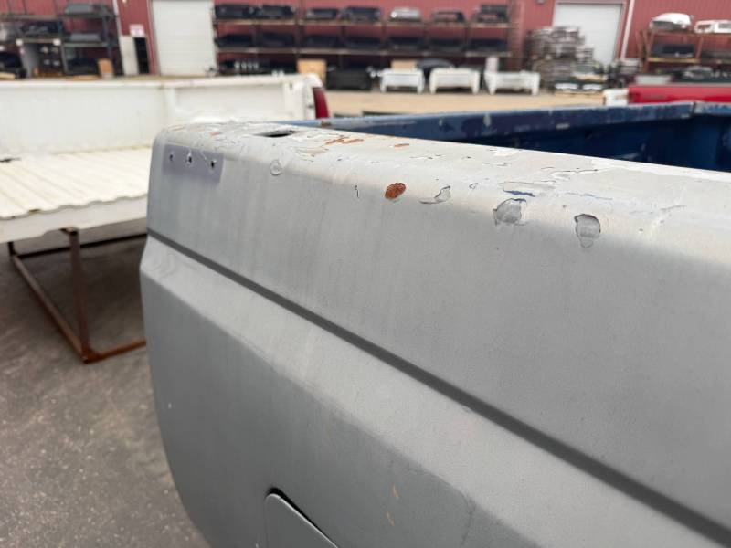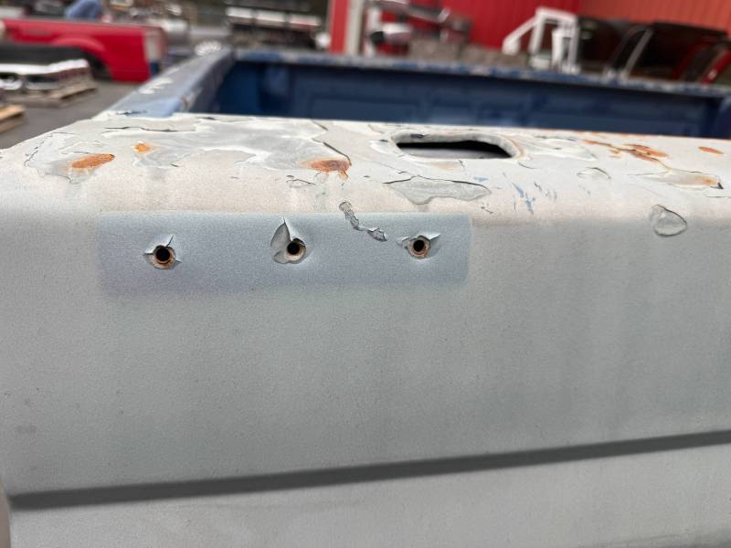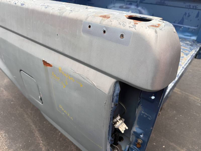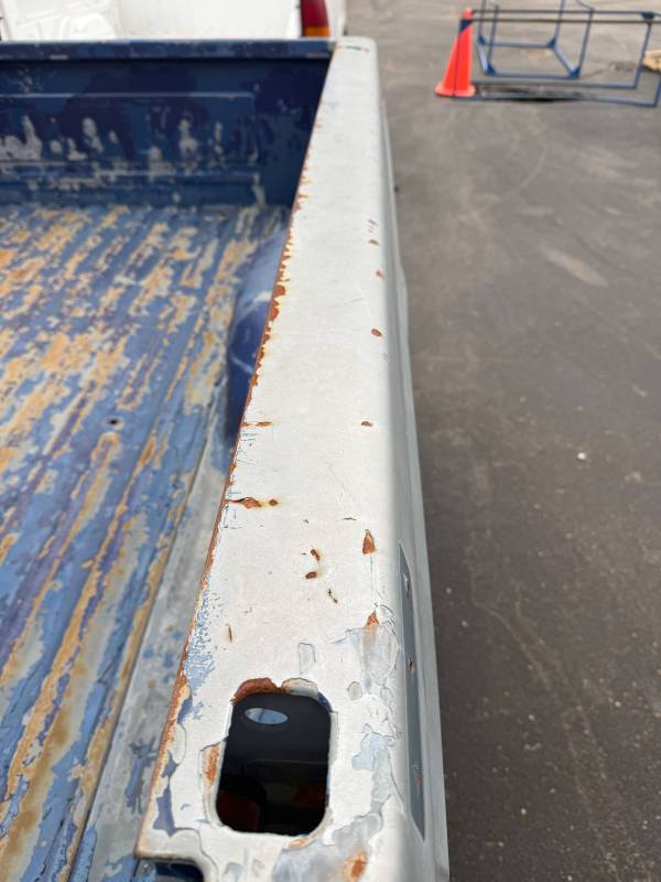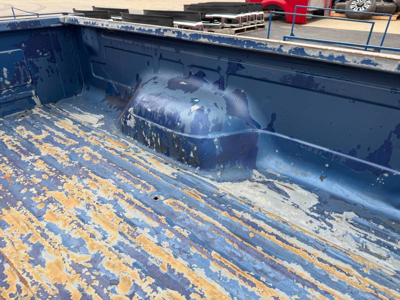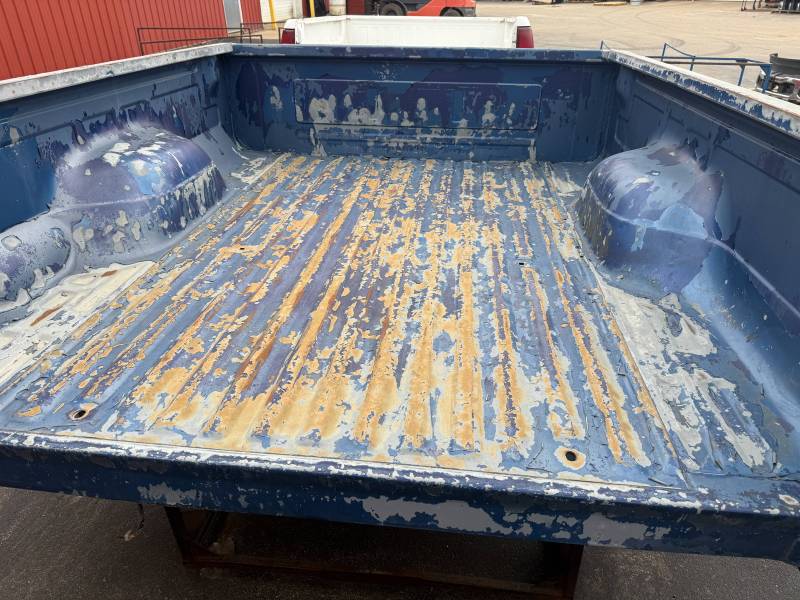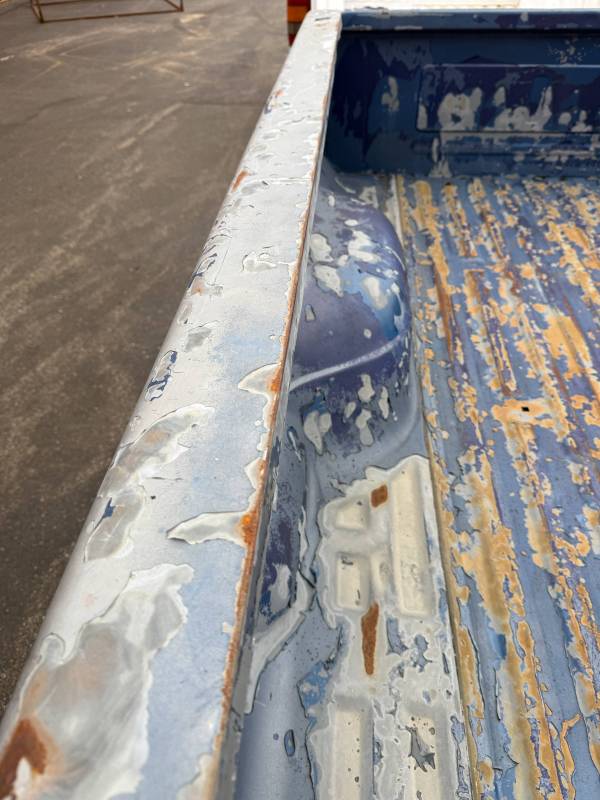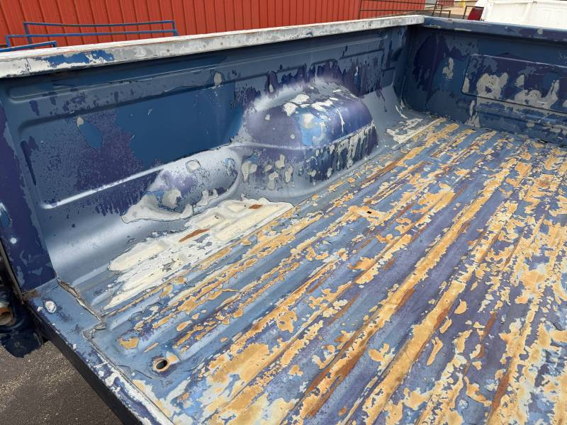 This rust-free Texas bed (originally blue, now painted silver) is being sold without a tailgate or taillights. The silver paint on the floor is currently peeling, and both bed sides have three holes drilled at the front and rear where chrome tie-down hooks were previously mounted.