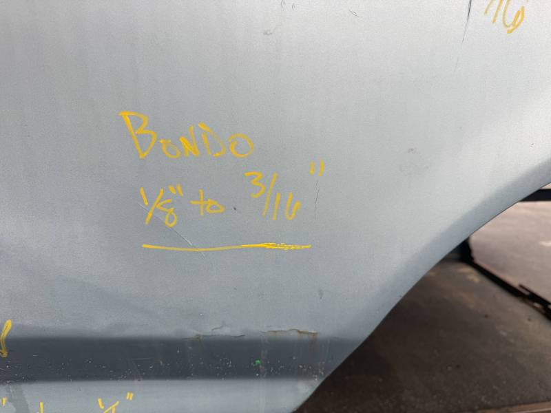 - Extensive bodywork is present from the rear to the wheel arch, with Bondo thickness ranging from 1/16” to 1/4".