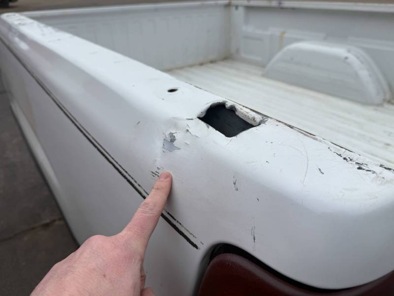 This rust-free Texas bed includes taillights but is missing the tailgate. While structurally solid regarding corrosion, the body has significant utility-related modifications and wear.