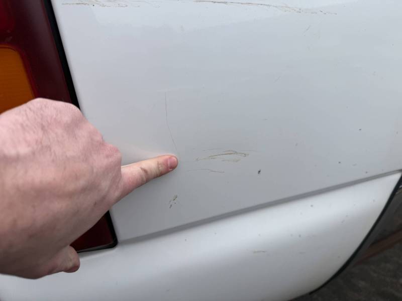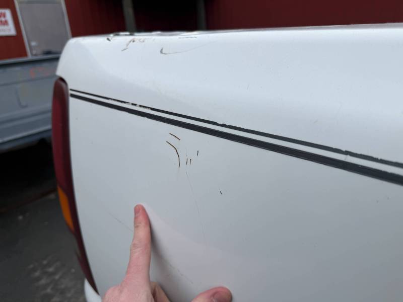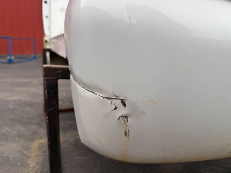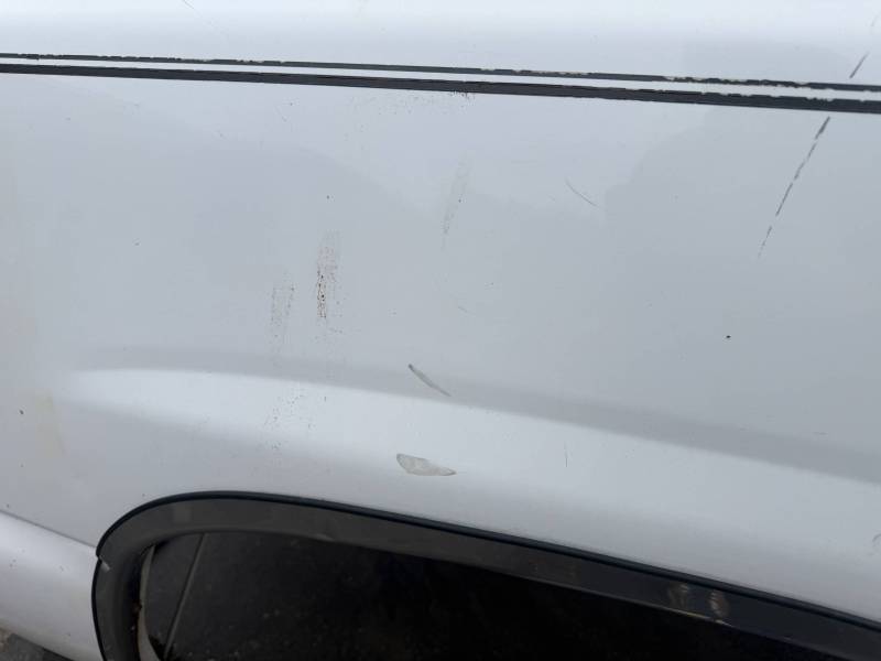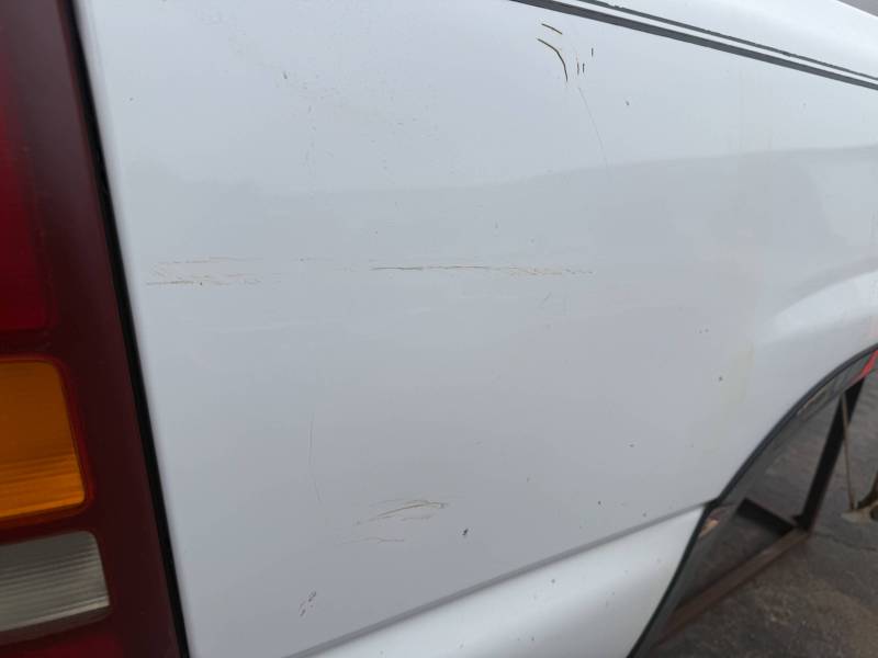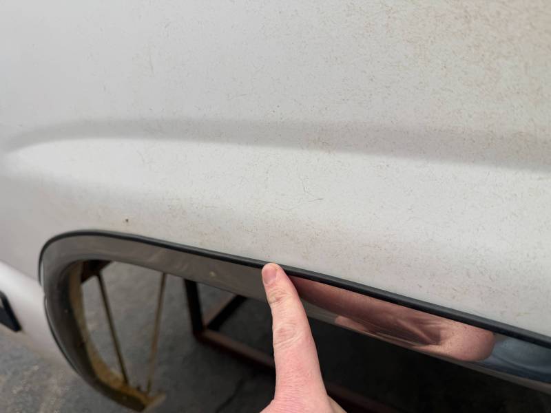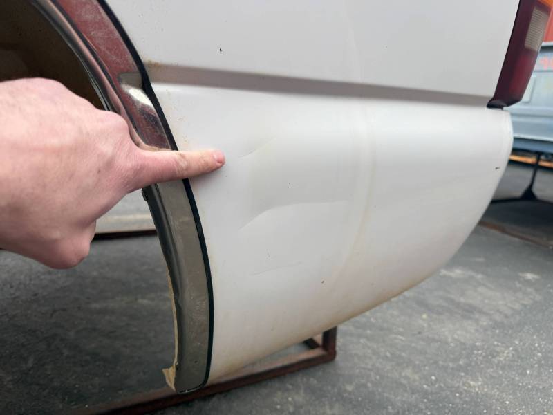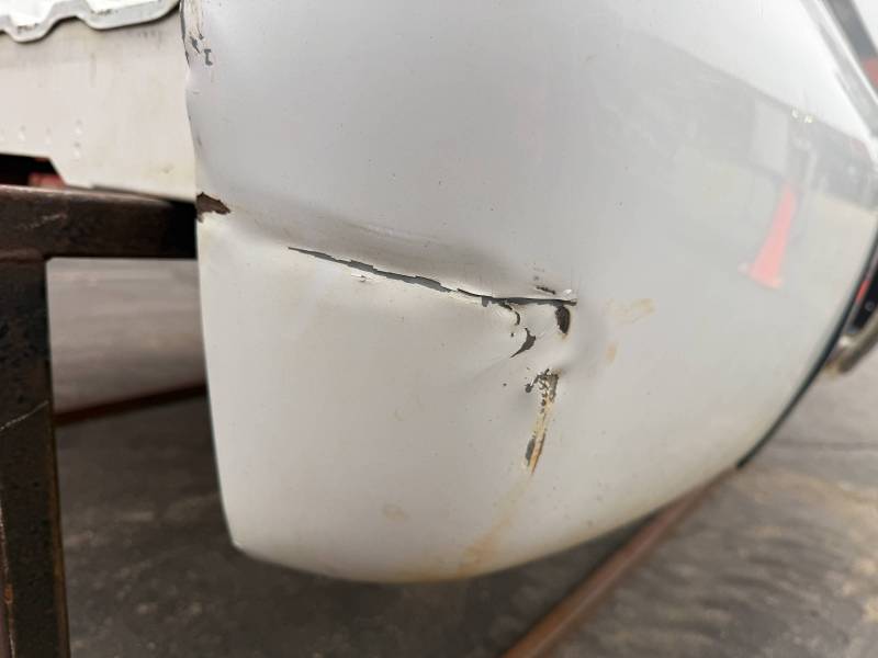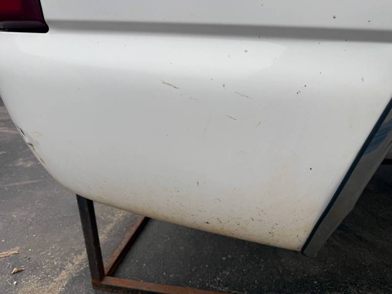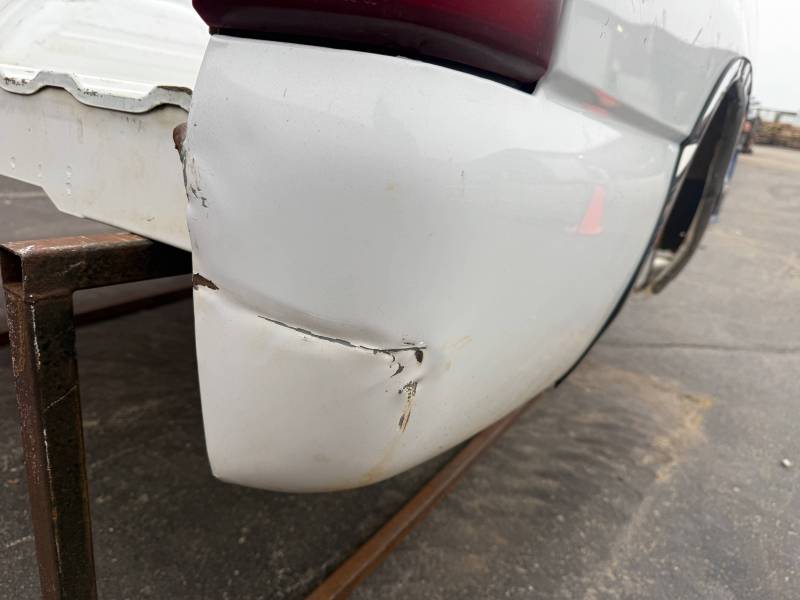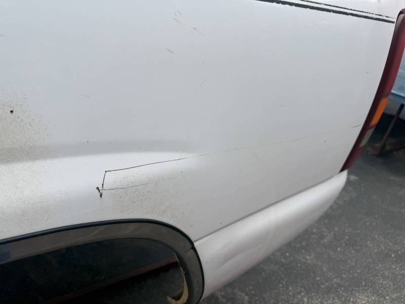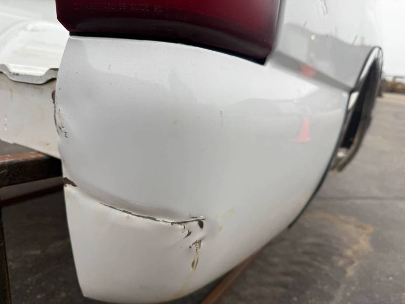 - A large flat dent on the lower front and a 6” crease under the taillight caused by bumper impact.