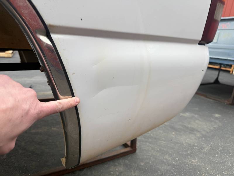 - The rear features a 4” crease, a quarter-sized dent, and two additional dents near the top rail.