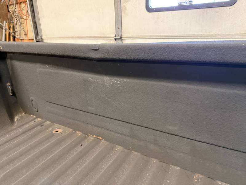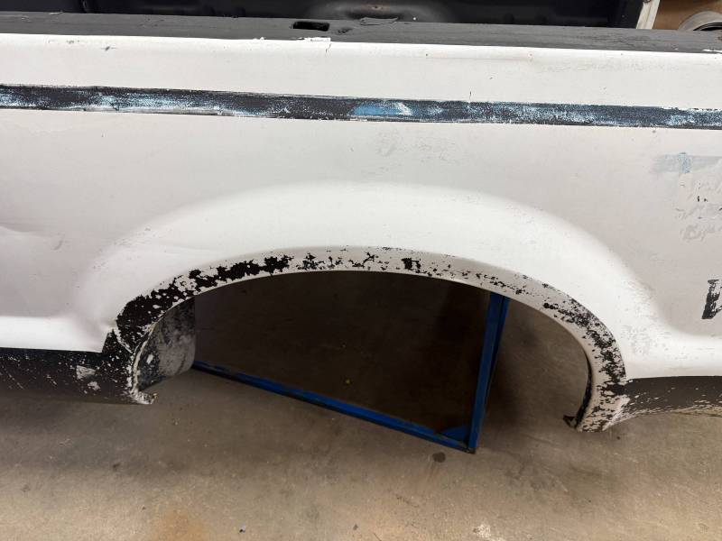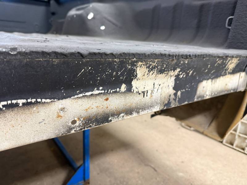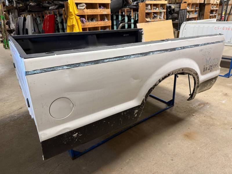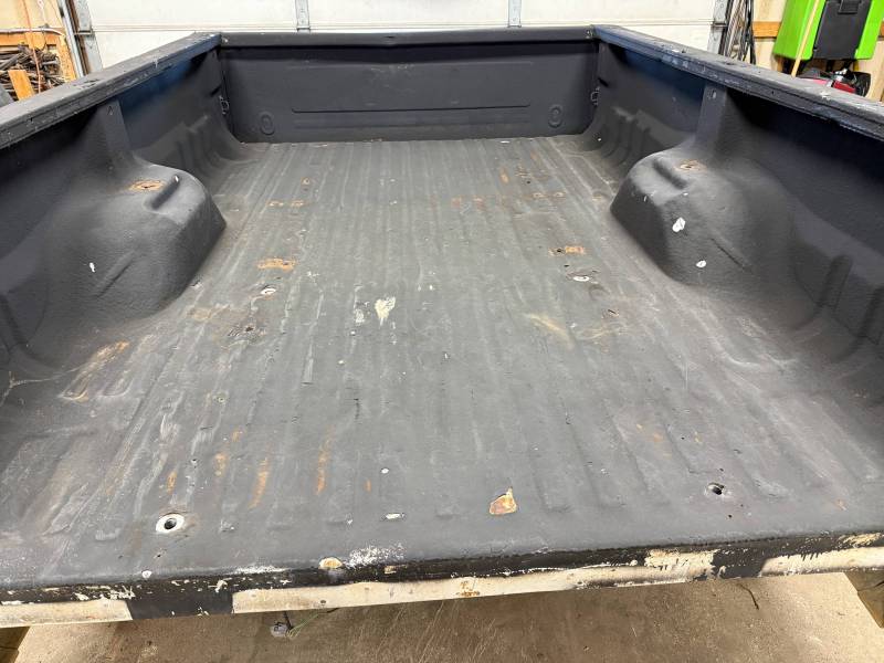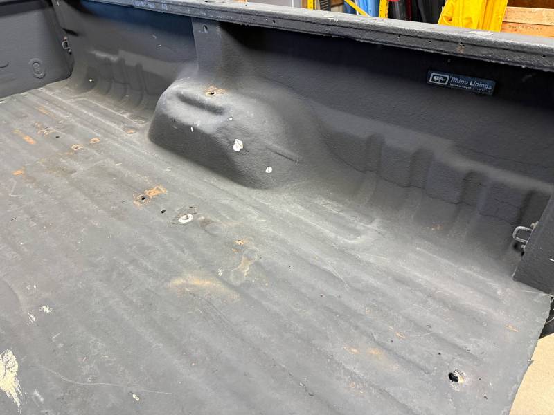 This truck bed is structurally solid and rust-free, though it shows extensive cosmetic wear, numerous modifications, and previous body repairs. The tailgate and taillights are missing, and the interior is fully protected with Rhino liner, though the rear floor section is wavy.