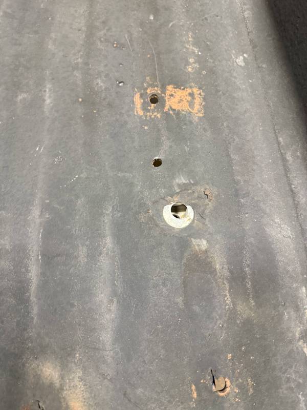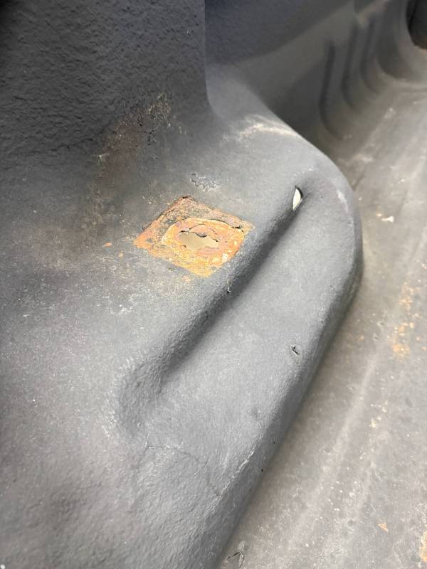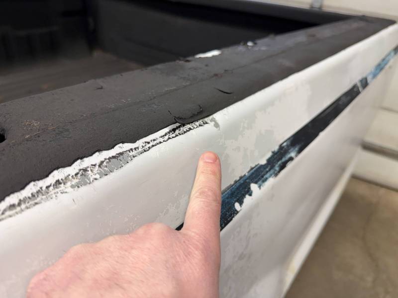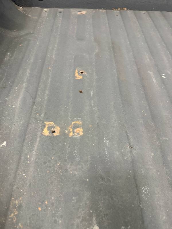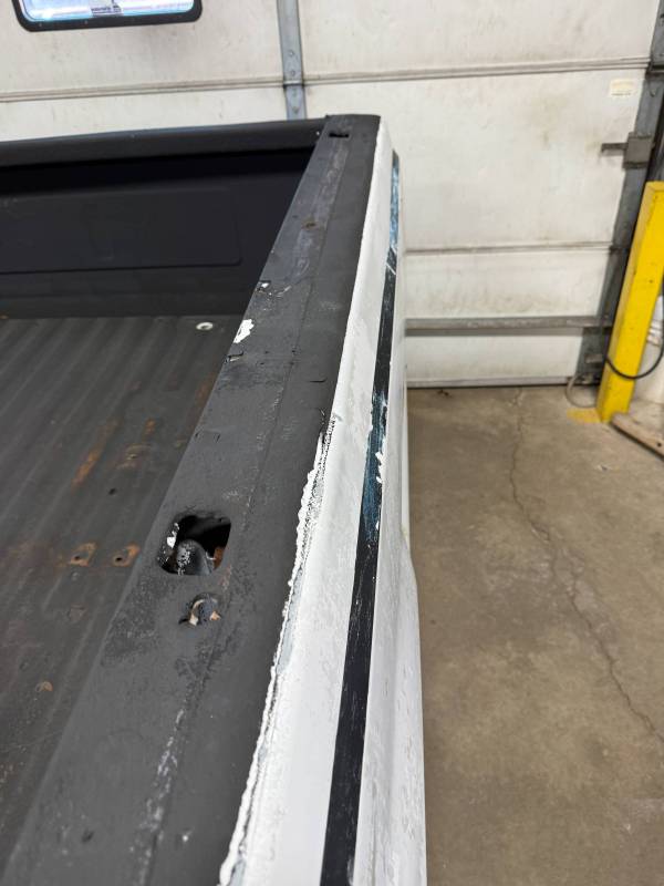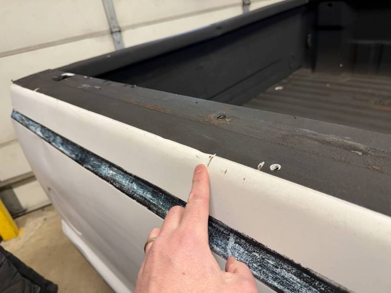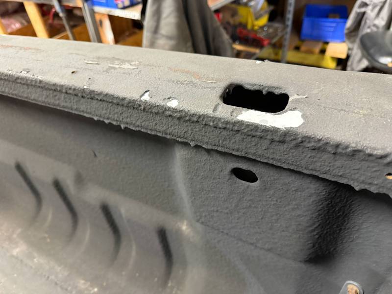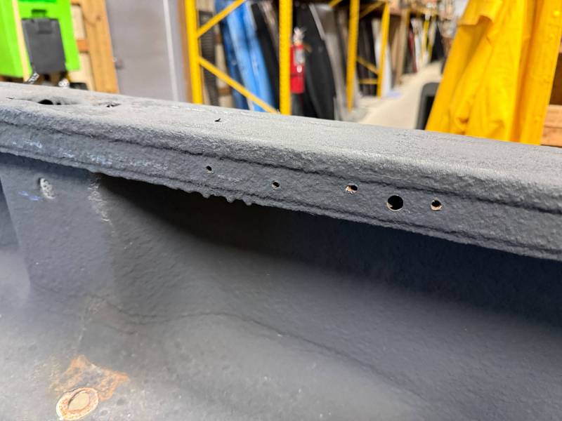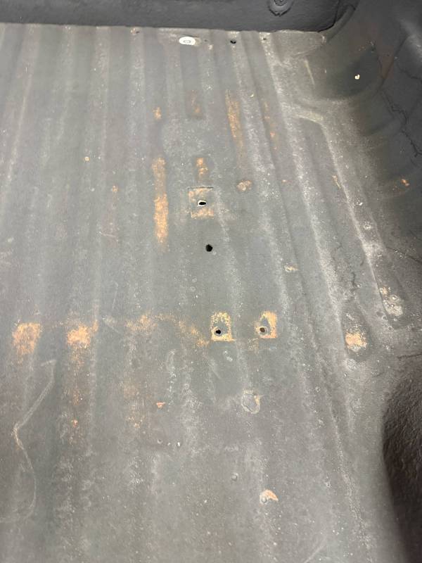 Drill Holes: 11 holes near the tailgate, 16 in the floor, 2 in the wheel tubs, and 30 across the rails and header.