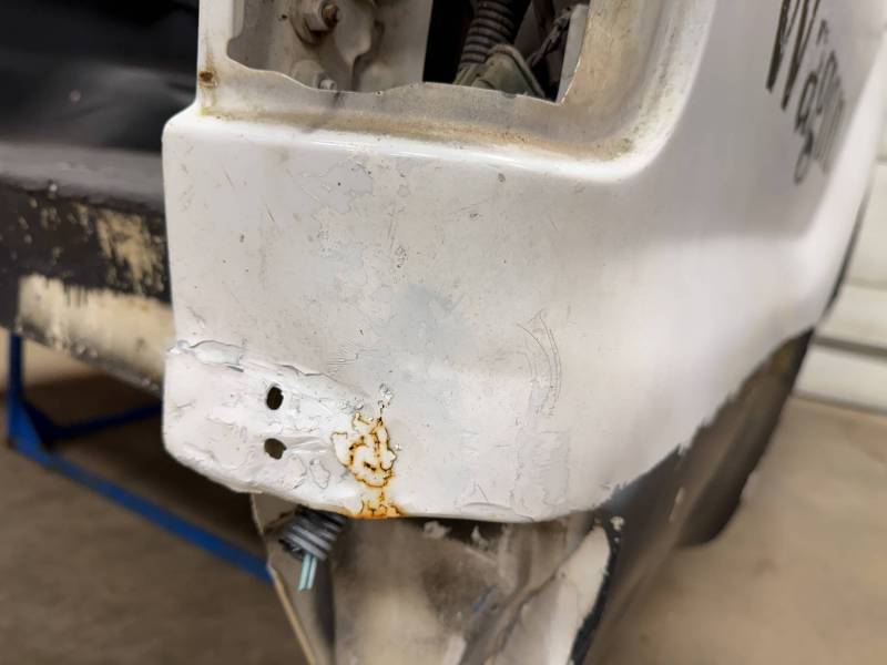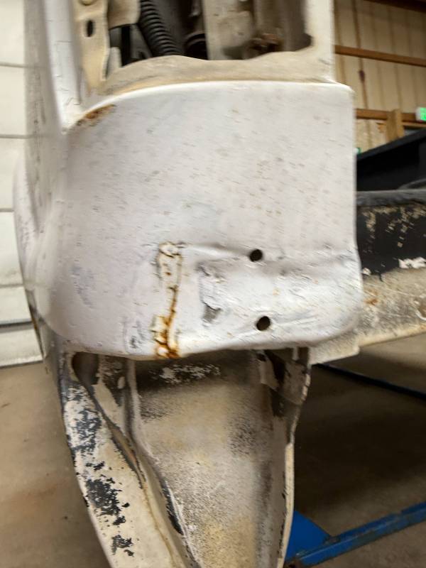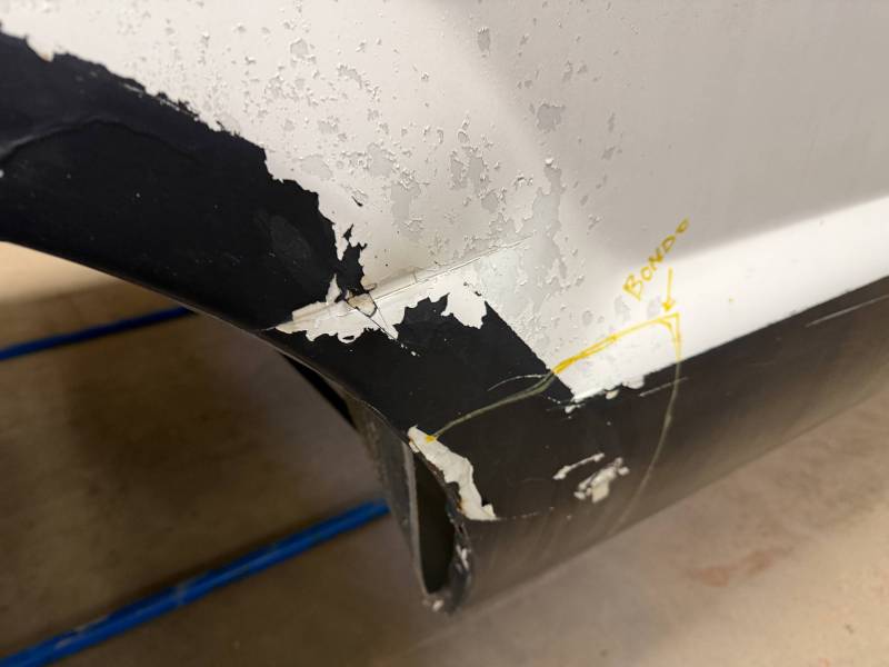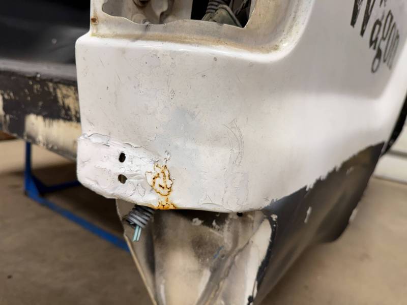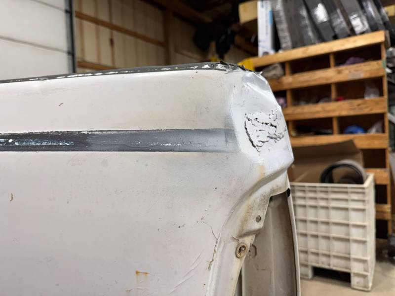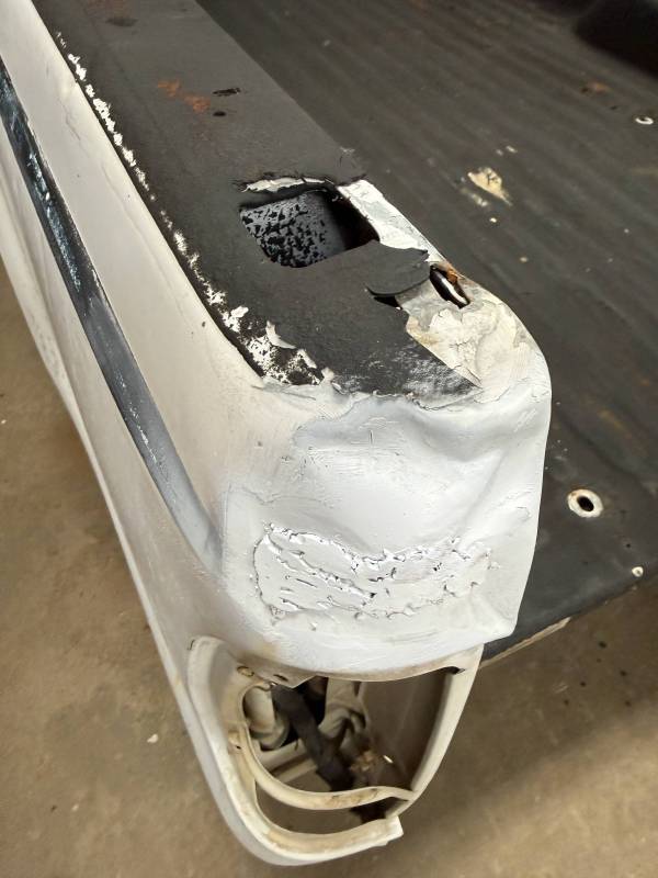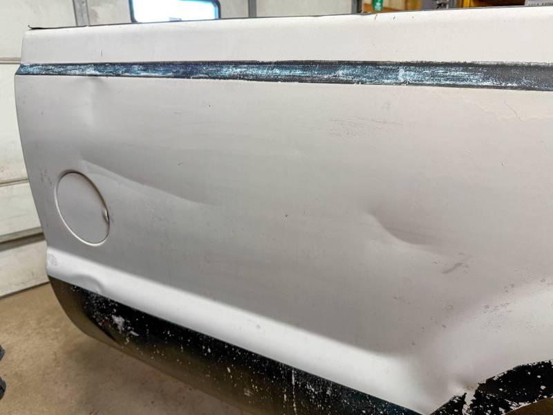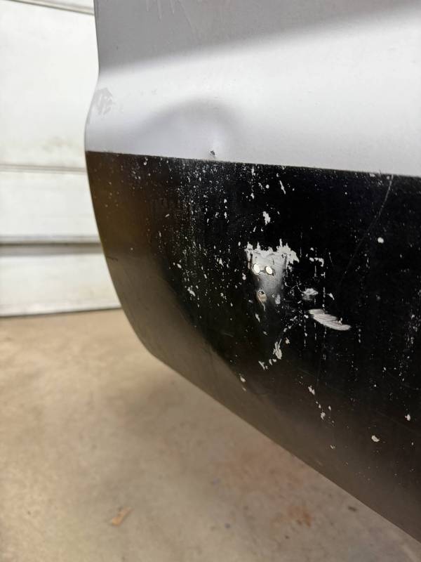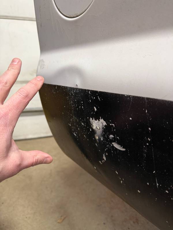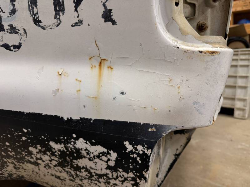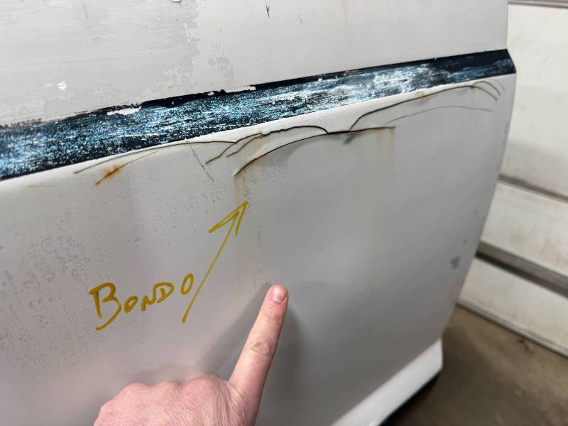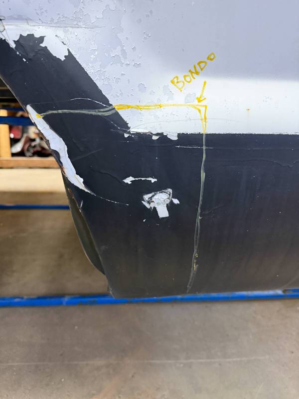 Repairs: Large weld-repaired dent above the taillight and Bondo filler on the lower rear.