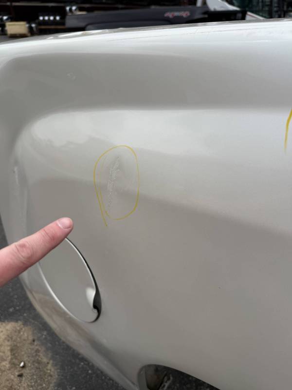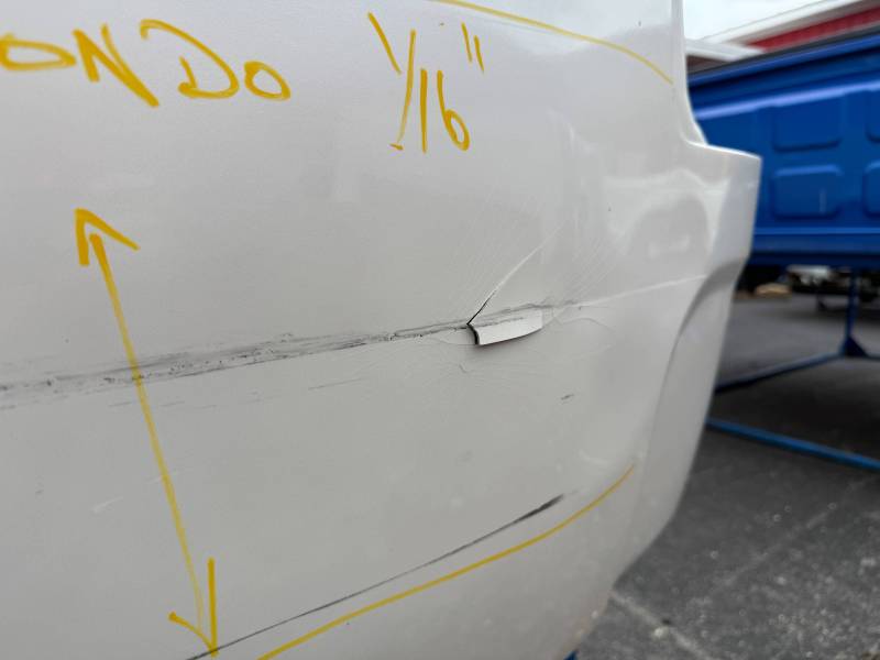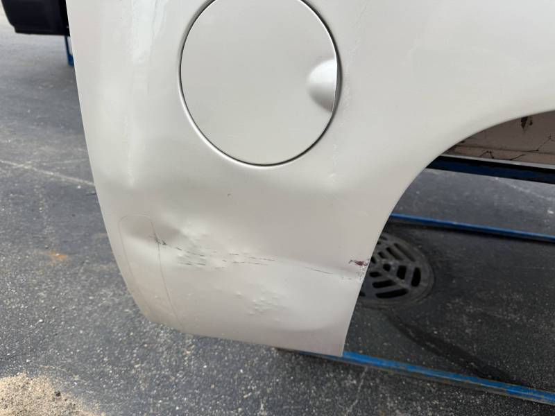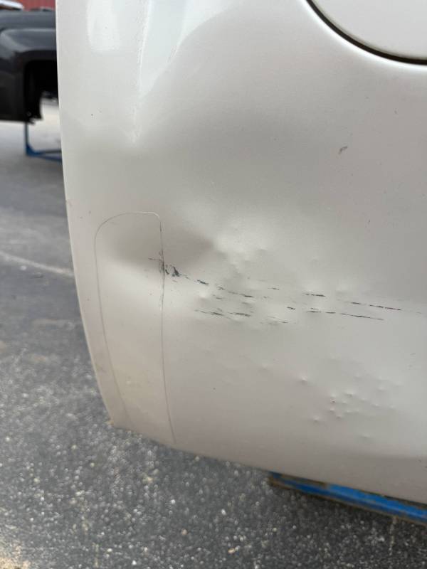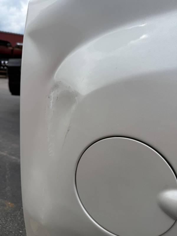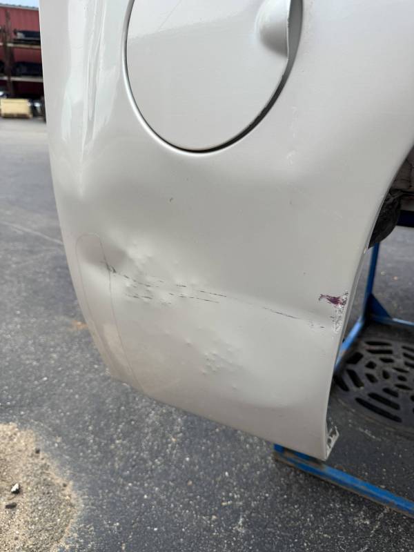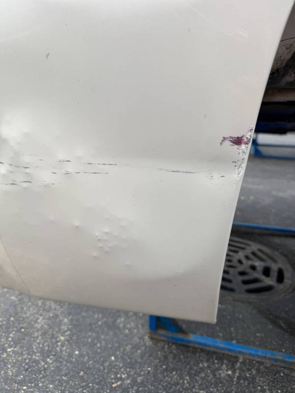 - Lower Panels: The front lower section is heavily dented; the rear lower section has two softball-sized dents.